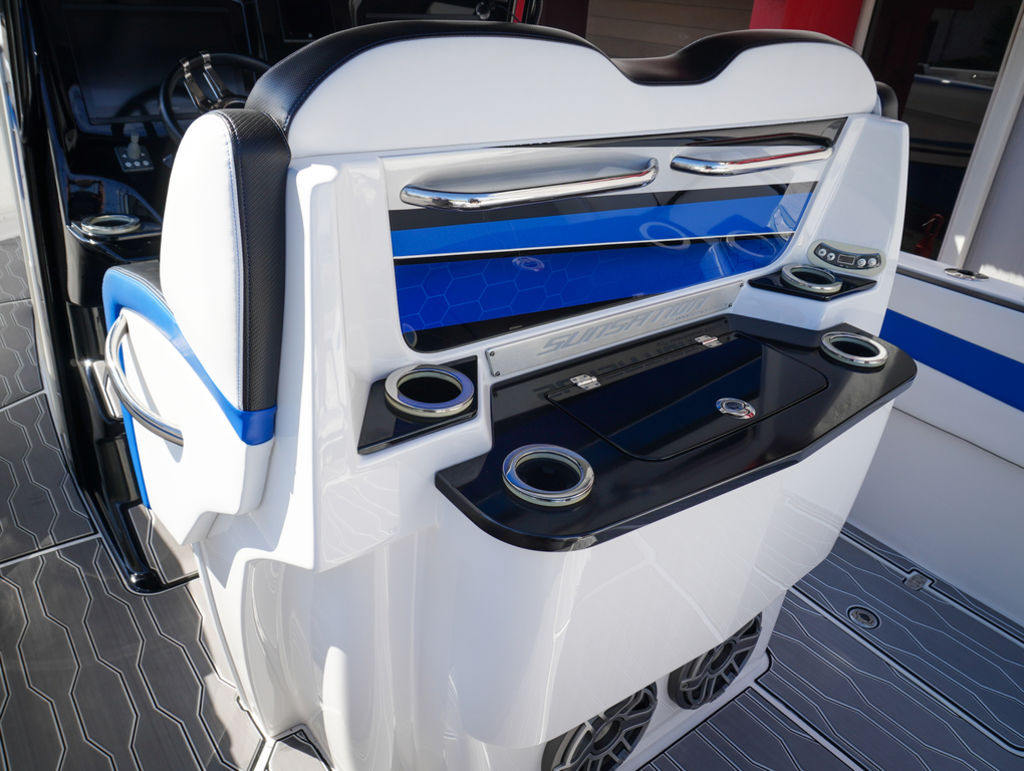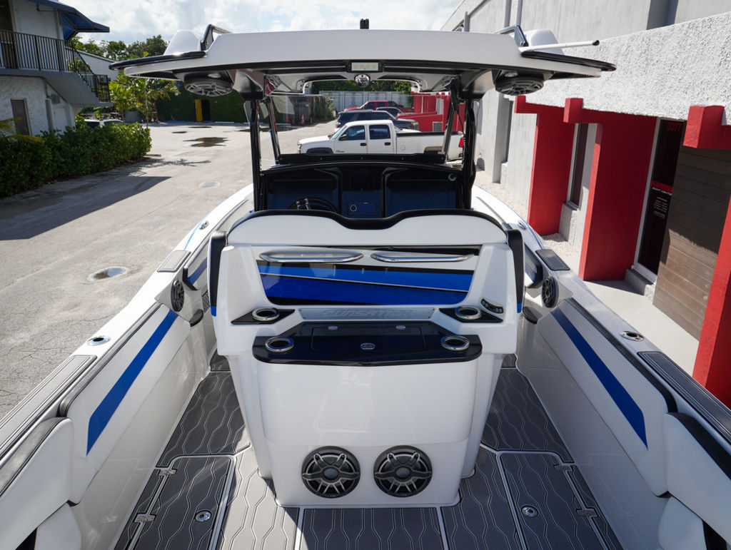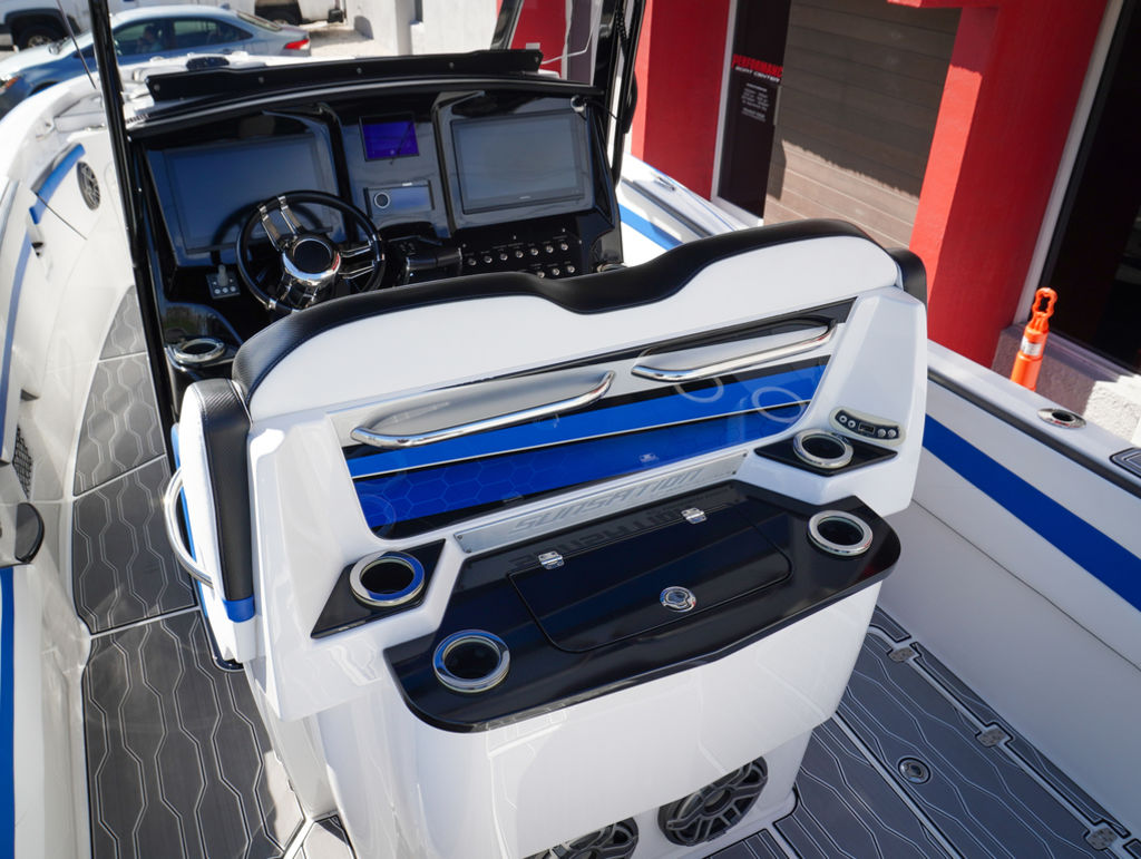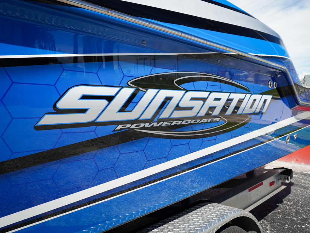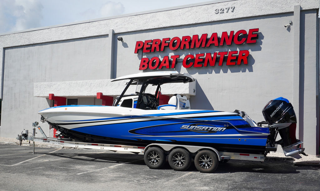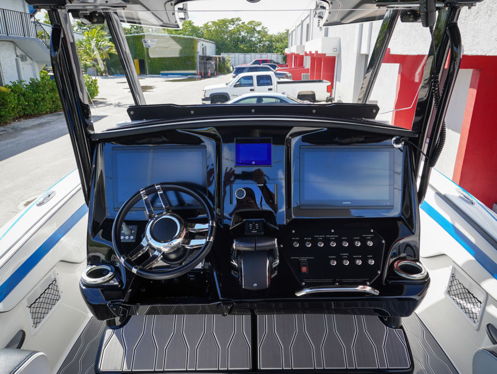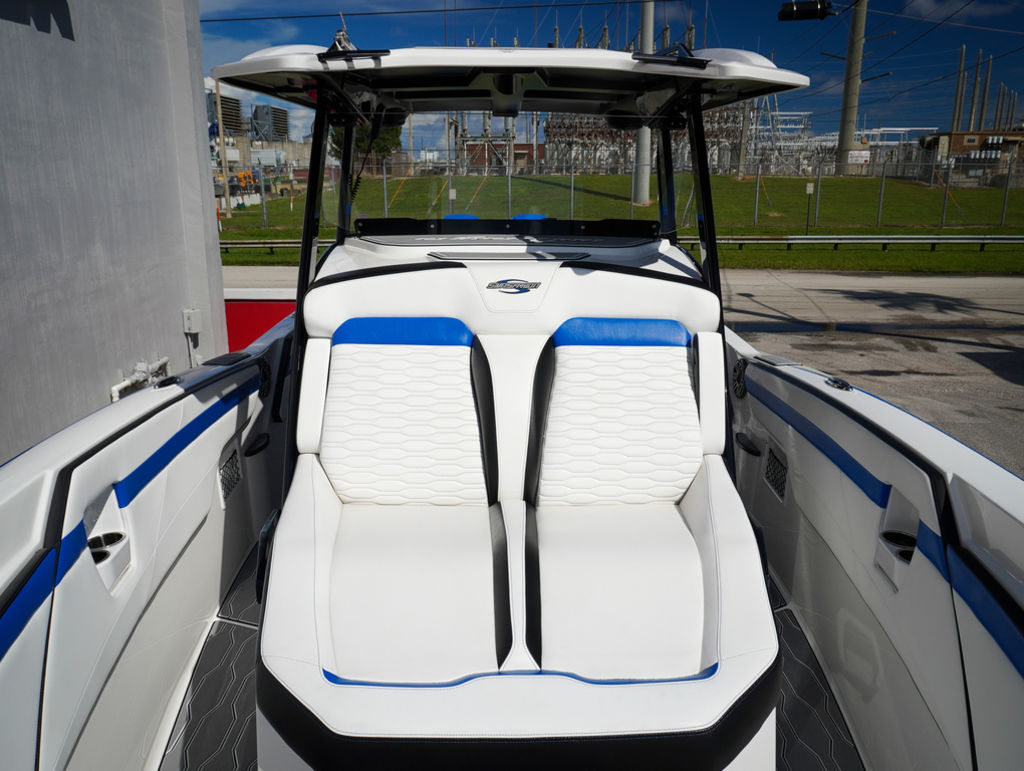 2023 Sunsation 32 CCX with twin Mercury L6 400M outboards with 2 year Mercury extended warranties and painted accents. Sold new by PBC. Optional Equipment: Beautiful detailed full paint by Mitcher T, Black Bottom gelcoat, Bow Thruster, Chill Plate in cooler seat, Electric head with holding tank and overboard discharge, VHF Radio, Full Cover with Hard Top Cover, Under Water Lights, Gunnel Rod Holders, Rear Sunshade, Transom Wash Down System, NO TRAILER. Always Dry Stored and serviced by Mercury Technician. Located in Ft.Lauderdale off site. Call for appointment to inspect.