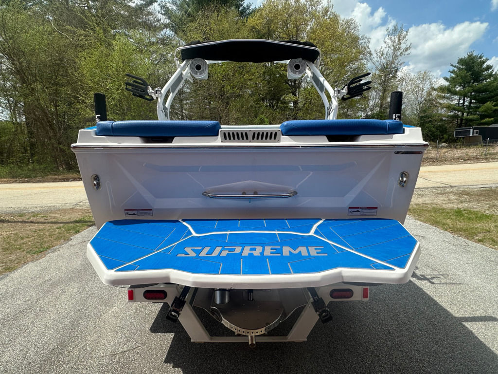Tapered V HullThe surfability of a Supreme begins at the water level with the modified deep-v hull design. The deep-v creates a smooth rough water ride with double the degree of V (20 degrees of deadrise) as competitors. The ‘modified’ piece of this design adds balance to the hull to guard against side-to-side weight shift negatively impacting the water behind the boat. Supreme ZS models expand the surfability of our modified deep-v hull with a tapered-v hull design that sits lower in the water towards the rear of the wakeboard boat when weighted, displacing more water with less weight to intensify the waves and wakes. Staggered Chine Stabilization (SCS) creates symmetrical waves and wakes. SCS is custom lifting rails on the starboard and port sides, staggered in their size and placement to balance the asymmetrical pitch of the boat due to the righthand drive configuration and natural prop rotation.