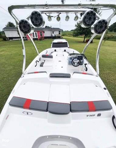 The T18 makes room for up to 9 riders in its wide bow seating and cockpit lounge. The aft sundeck and sun pad make room for more while at anchor. Grab handles are positioned around the deck, and this boat has an upgraded Kicker sound system and amp for the ultimate onboard experience.