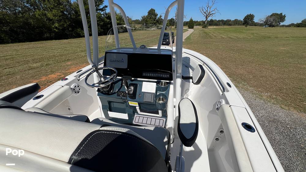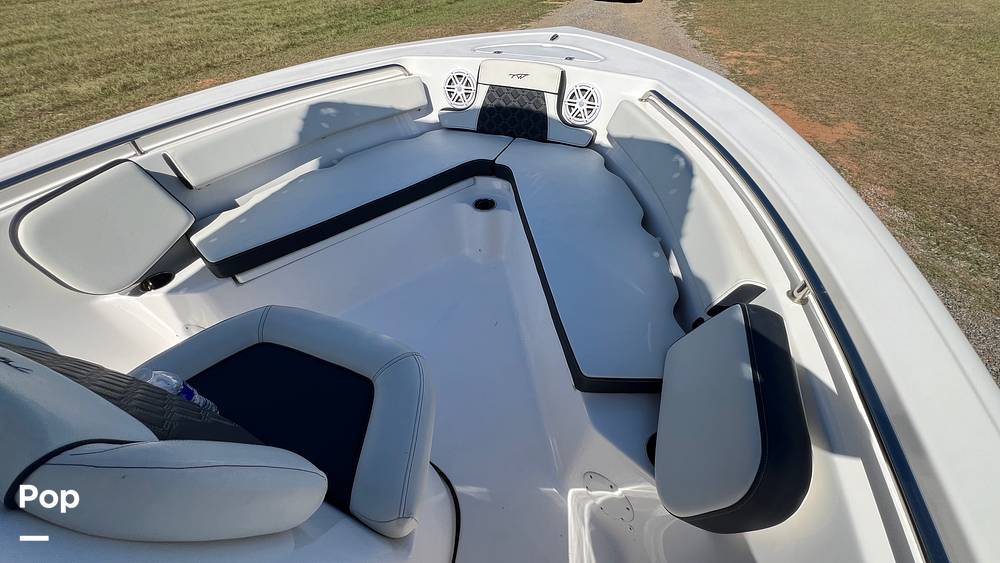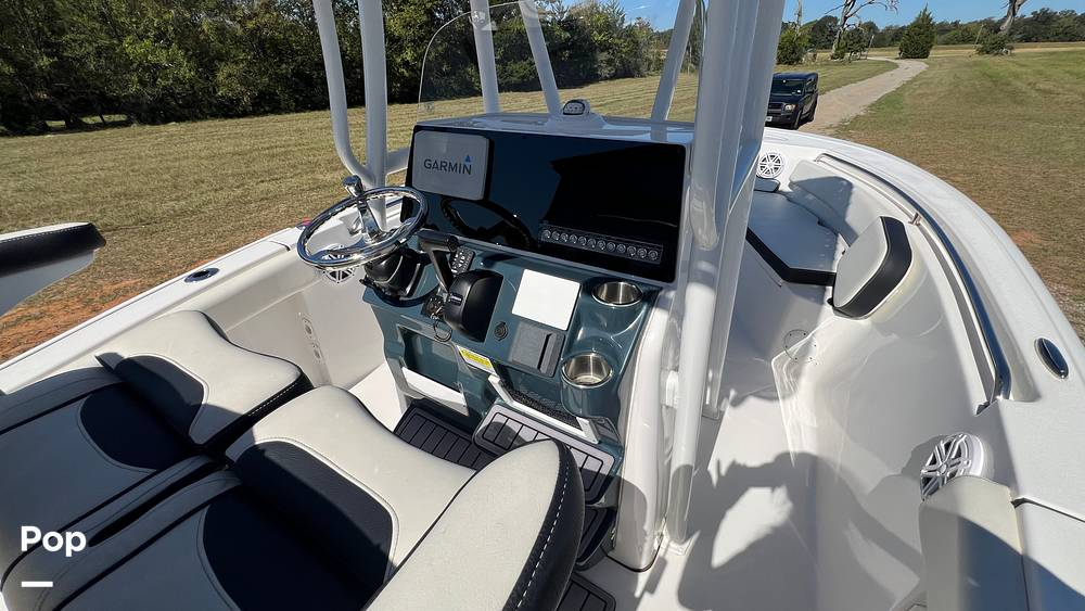 This boat has a comfortable and spacious setup. The console dash panel has a command center, 9" Garmin, and JL Audio System with four speakers. There are double seats at the helm with bolsters for the captain and passenger. The console also has a footrest, glove box storage, stainless steering wheel with knob, and vertical rod holders.