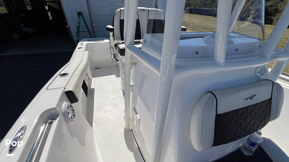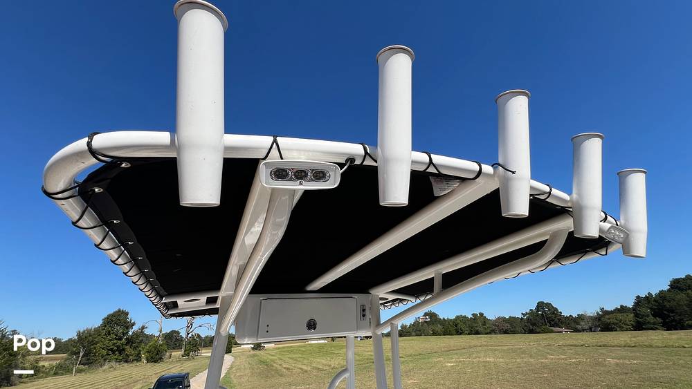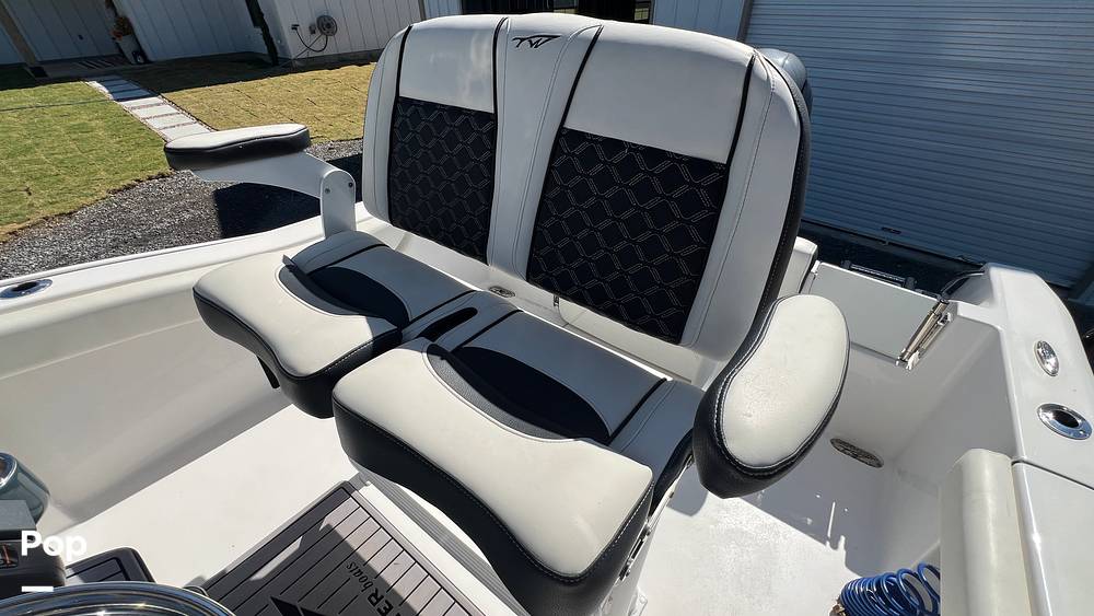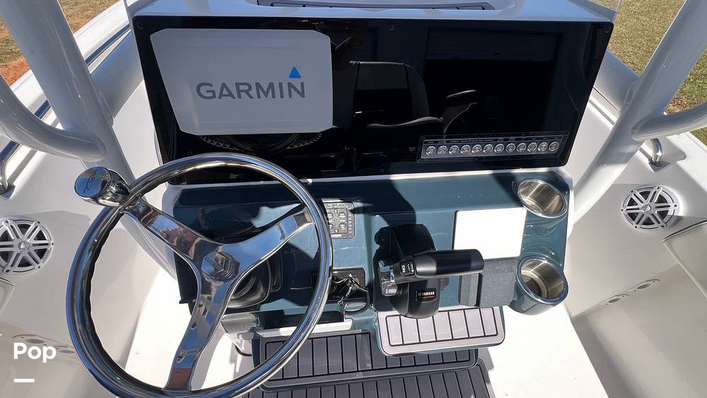It is powered by a 2023 Yamaha outboard 4-stroke engine with 150 HP and only 30 hours. It has hydraulic steering, trim tabs, and automatic bilge pumps.