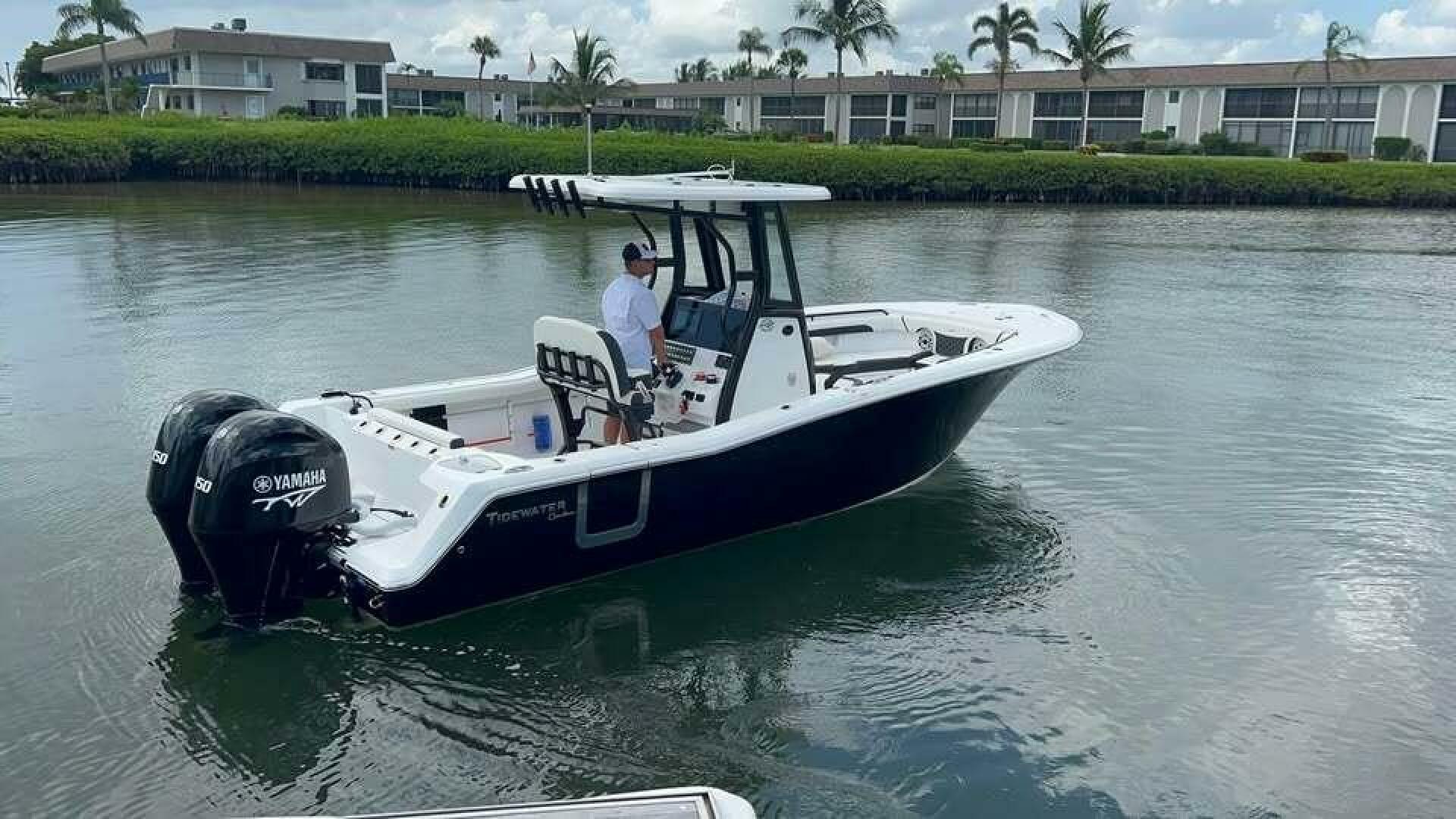 The Tidewater 256 Center Console is a versatile boat built for serious offshore fishing and family outings alike. Powered by twin Yamaha engines, this 25-foot center console is known for its smooth ride, spacious layout, and impressive performance. With ample seating, advanced electronics, and fishing amenities, the 256 CC is as versatile as it is powerful, making it a fantastic choice for anglers and leisure seekers alike.Key FeaturesTwin Yamaha Outboards: Twin Yamaha 150 HP outboards provide reliable power and fuel efficiency, delivering a smooth, fast ride with the confidence to tackle offshore waters.Spacious Deck Layout: The large, open deck layout offers ample room for casting, seating, and entertaining, making it ideal for both fishing trips and family outings.Deep V Hull: Tidewater’s deep V hull design ensures a comfortable, stable ride in rougher waters, enhancing both safety and performance.Fishing-Focused FeaturesMultiple Rod Holders and Tackle Storage: Dedicated rod holders and tackle compartments keep your gear organized and ready for action.Dual Livewells: Two aerated livewells ensure you can keep bait fresh and fish lively throughout your trip.Large Fish Boxes: Keep your catch fresh in the insulated fish boxes, spacious enough for larger hauls.Comfort and ConveniencePlush Seating Throughout: Comfortable bow seating with removable backrests, a large forward lounge, and cushioned helm seats make for a relaxing day on the water.Hardtop with Rocket Launchers: The T-top offers shade and additional rod storage, with an integrated electronics box for easy access to all your controls.Head Compartment: A fully enclosed head with a freshwater sink offers convenience and privacy, making it perfect for extended outings.Advanced Electronics and NavigationIntegrated GPS/Fishfinder: The high-quality navigation system provides easy, precise tracking and helps you find your favorite fishing spots.Premium Audio System: Equipped with a marine-grade sound system, allowing you to enjoy music and radio on the water.Trim Tabs and Yamaha Digital Controls: Effortless handling with precise Yamaha controls and trim tabs for added stability and control.This Tidewater 256 CC Adventure is the ultimate boat for those who want to enjoy both offshore fishing and family-friendly cruising. With powerful twin Yamaha engines, spacious seating, and top-of-the-line fishing features, it’s ready for action.FEATURES;Cockpit Bolsters Fixed Stern Bench Seat Port and Starboard Bow Cushions White Console with Companion Footrest & Black Dash PanelDeluxe Drop Bolster Leaning PostHard Top (Bottom Color) - WhiteHard Top (Top Color) - WhiteDark blue hull Compass Dual Battery Switch Finished Bilge Liner with Motion Light Fresh Water Shower Insulated 30 Gal. Livewell Under Port Stern SeatMacerator Pump for Floor Fish Boxes Raw Water Wash Down Dive Door Ladder Pull Up Cleats (5) Swim Ladder Inquire today about this beauty and set up your private showing before she is gone!