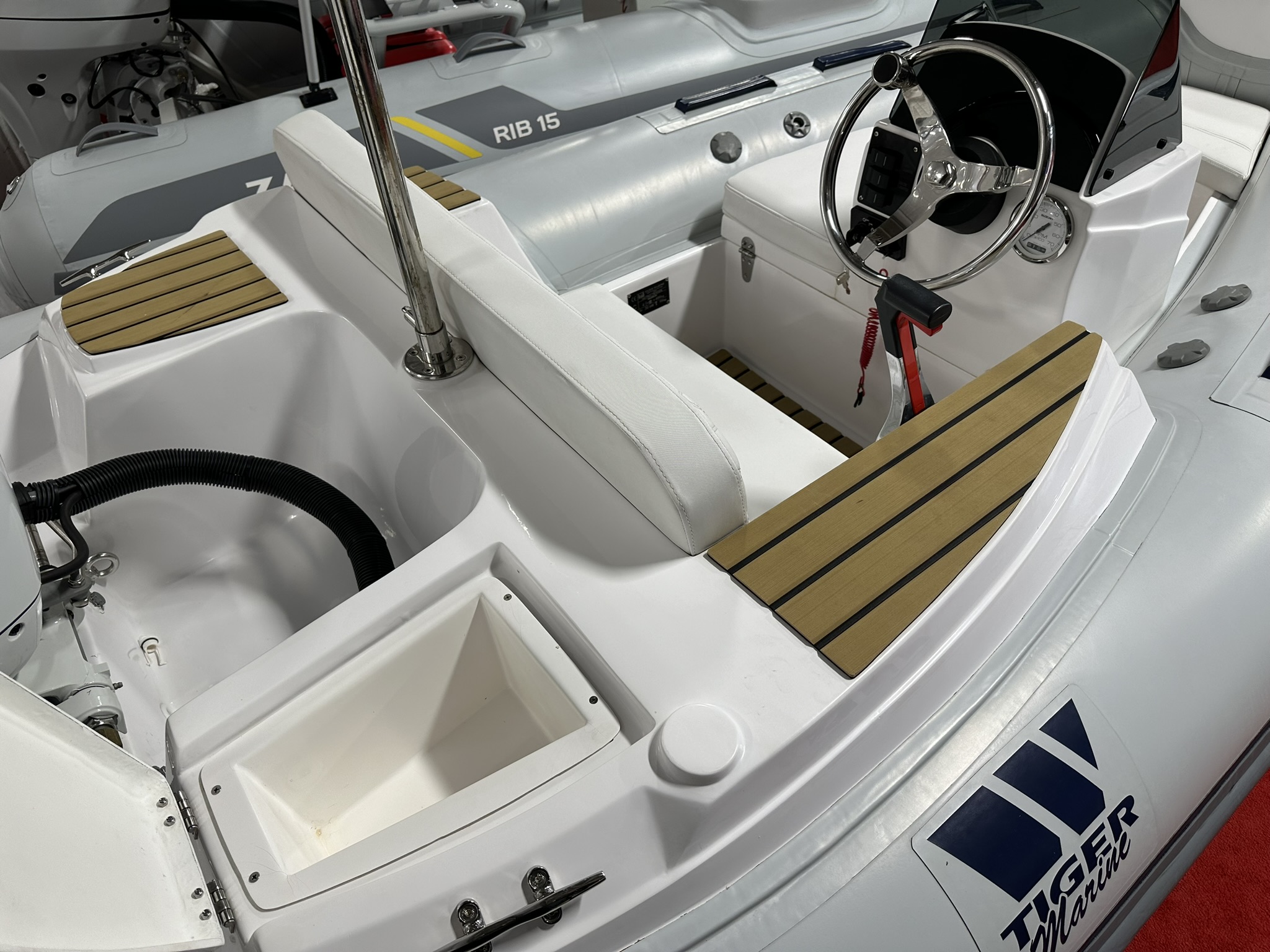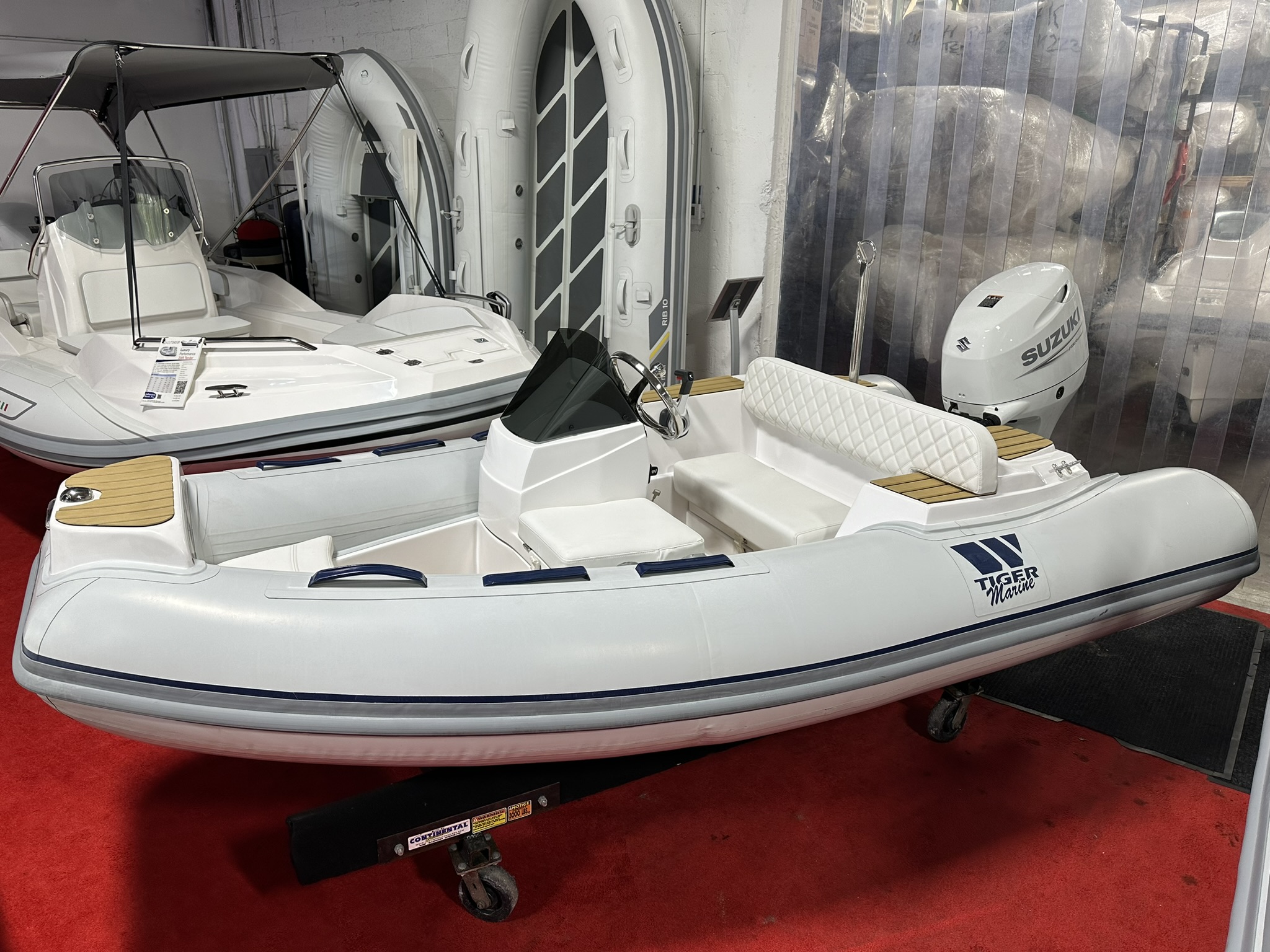 The Tiger Marine 340 PT is stocked with hypalon tube. SeaDeck faux teak, Silvertex cushion set, ski-pole, Nav lights, Bilge Pump, Battery system with cutoff switch.