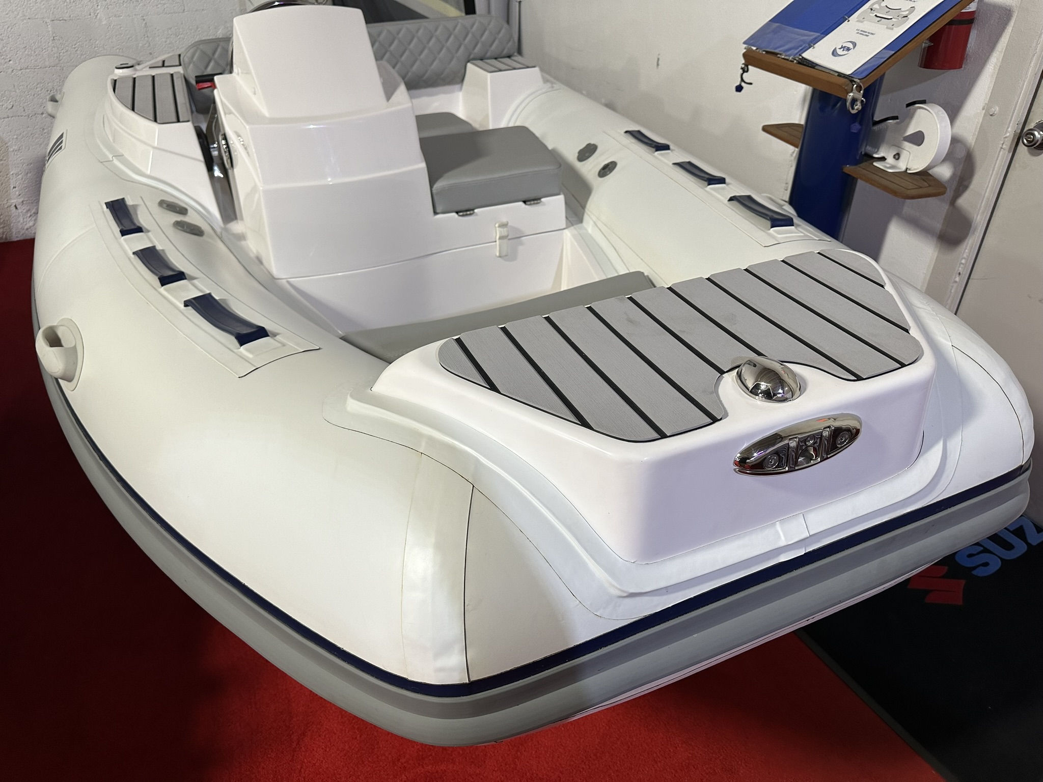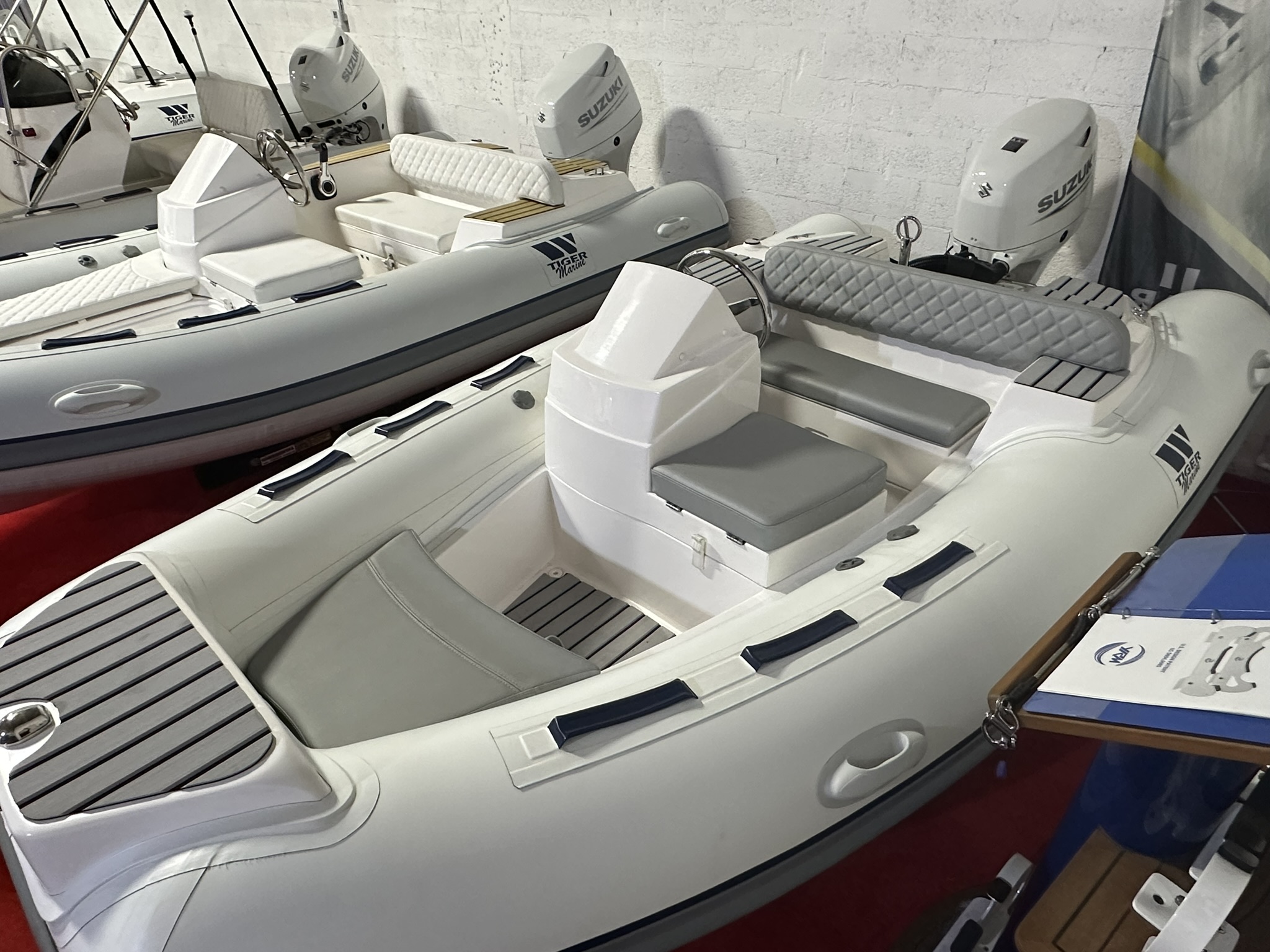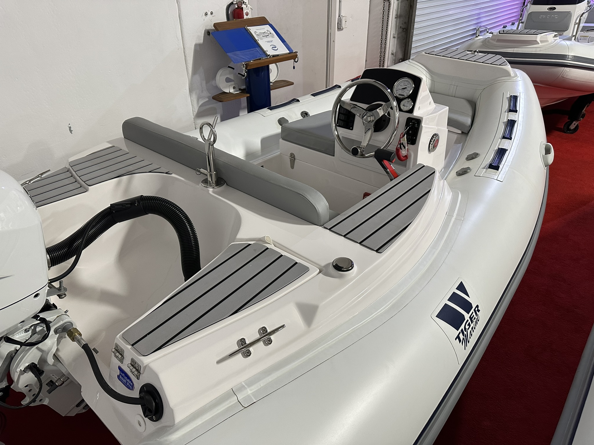 The Tiger Marine 380 PT is stocked with hypalon tube. SeaDeck faux teak, Silvertex cushion set, ski-pole, Nav lights, Bilge Pump, Battery system with cutoff switch.