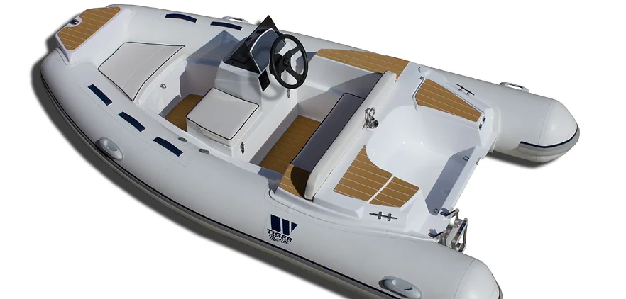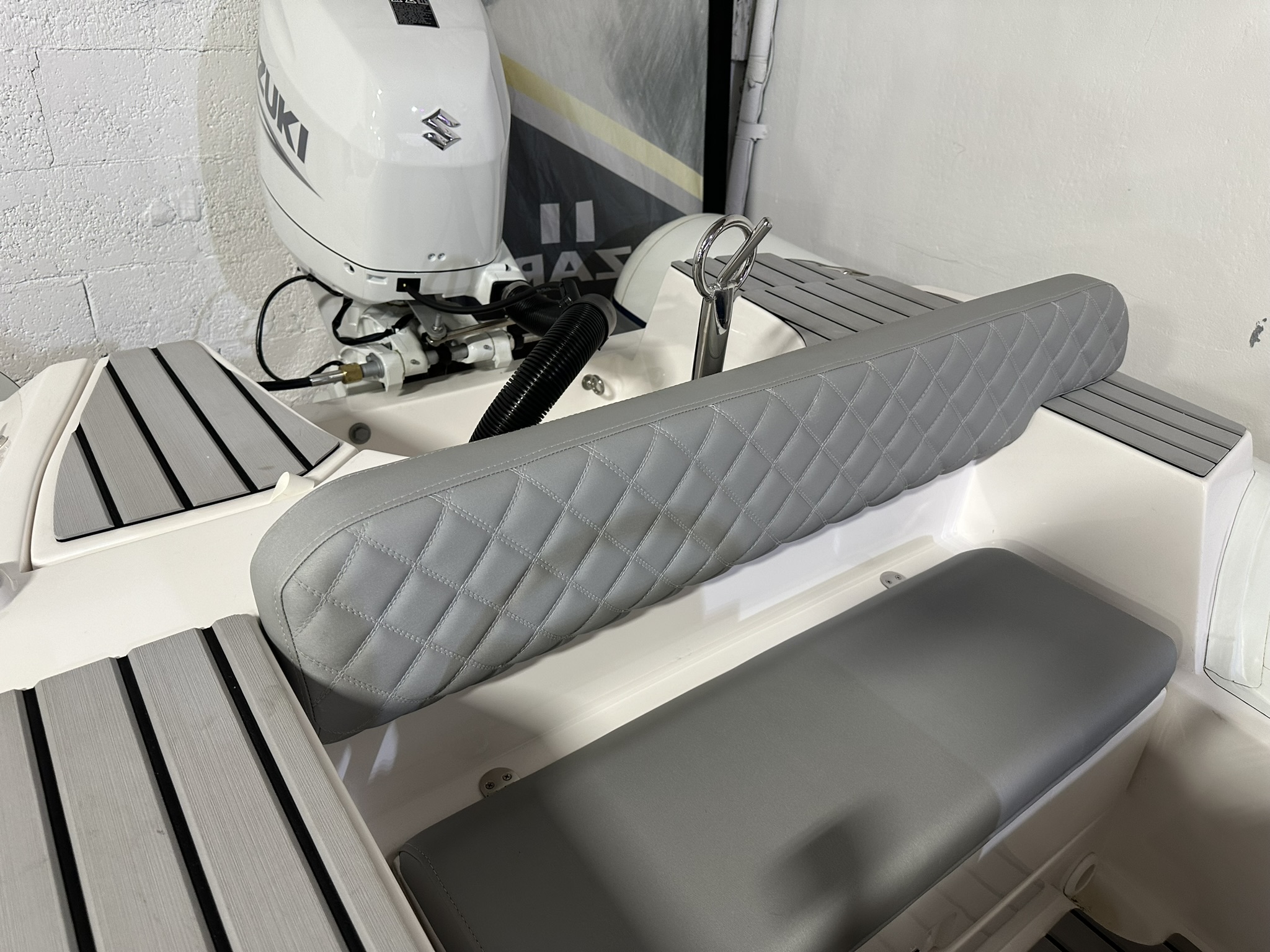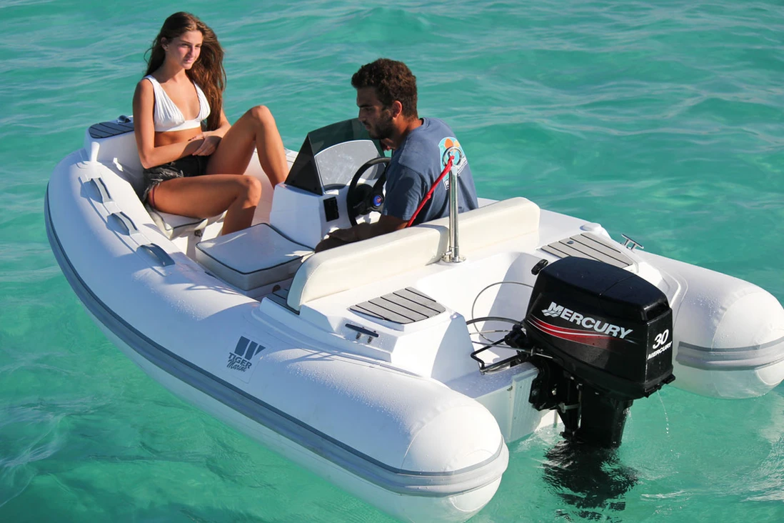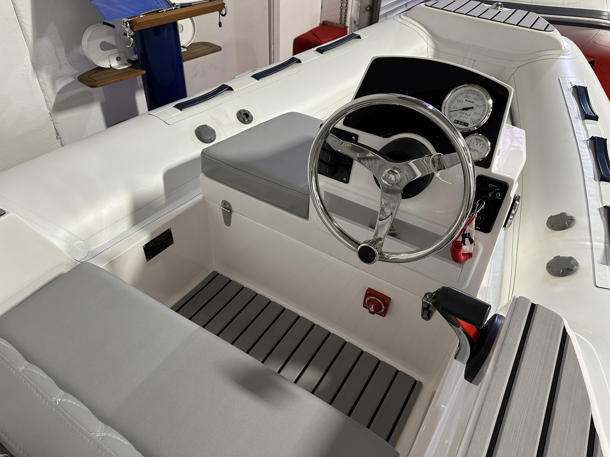 The Tiger Marine 380 PT is stocked with hypalon tube. SeaDeck faux teak, Silvertex cushion set, ski-pole, Nav lights, Bilge Pump, Battery system with cutoff switch.