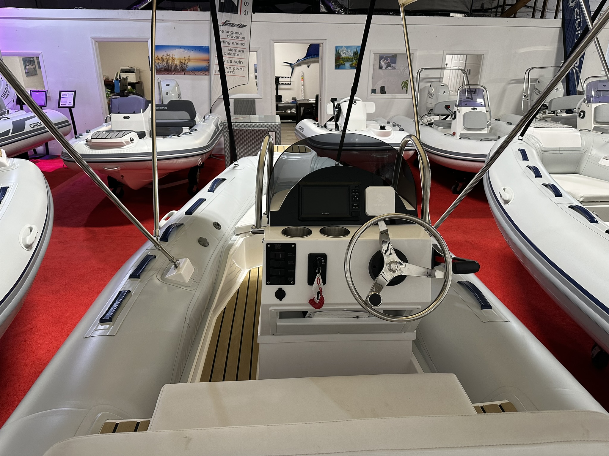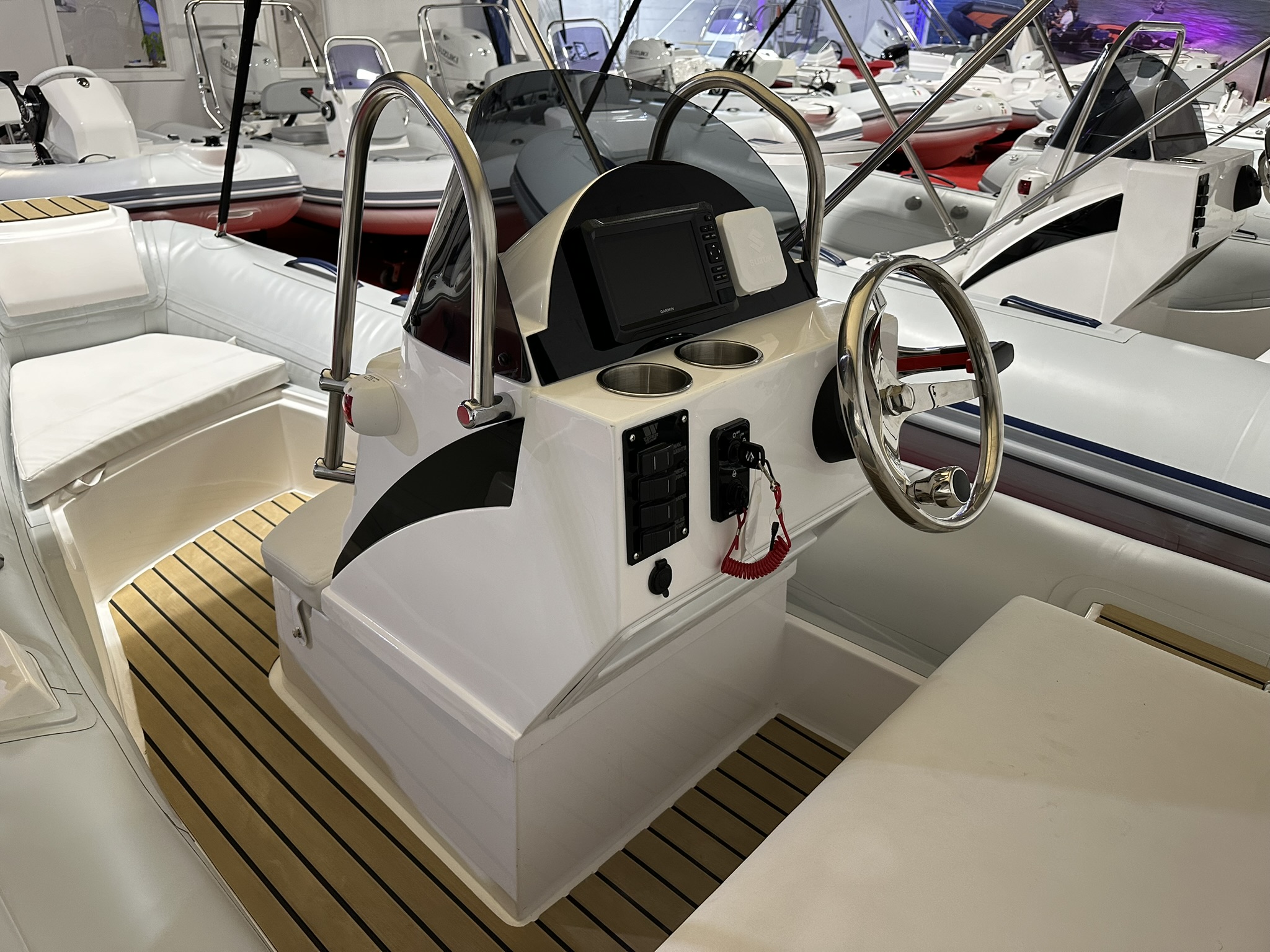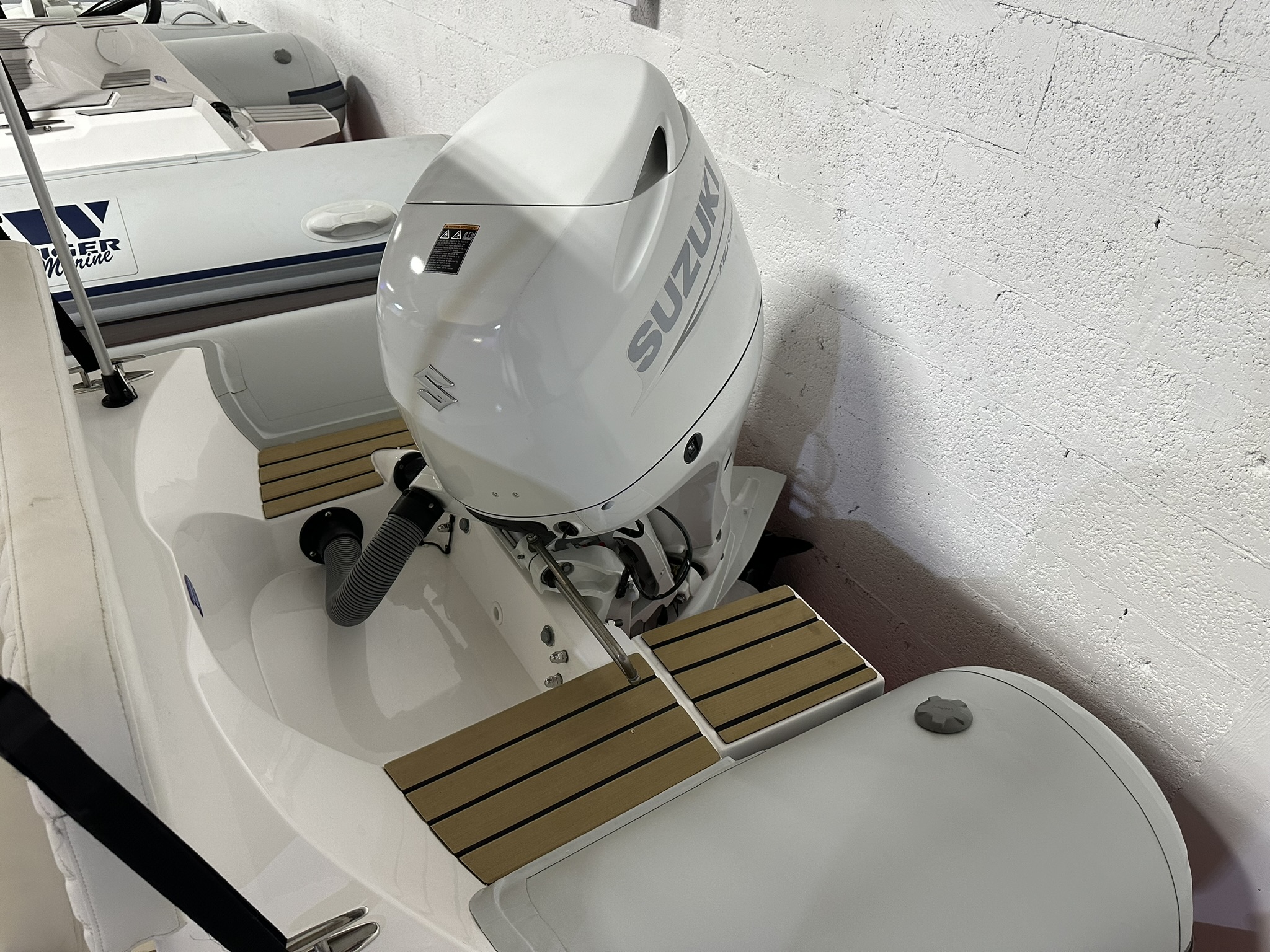 The Tiger Marine 440 SL is stocked with hypalon tube. SeaDeck faux teak, Silvertex cushion set, ski-pole, Nav lights, Bilge Pump, Battery system with cutoff switch, Stainless Steel Bimini Top