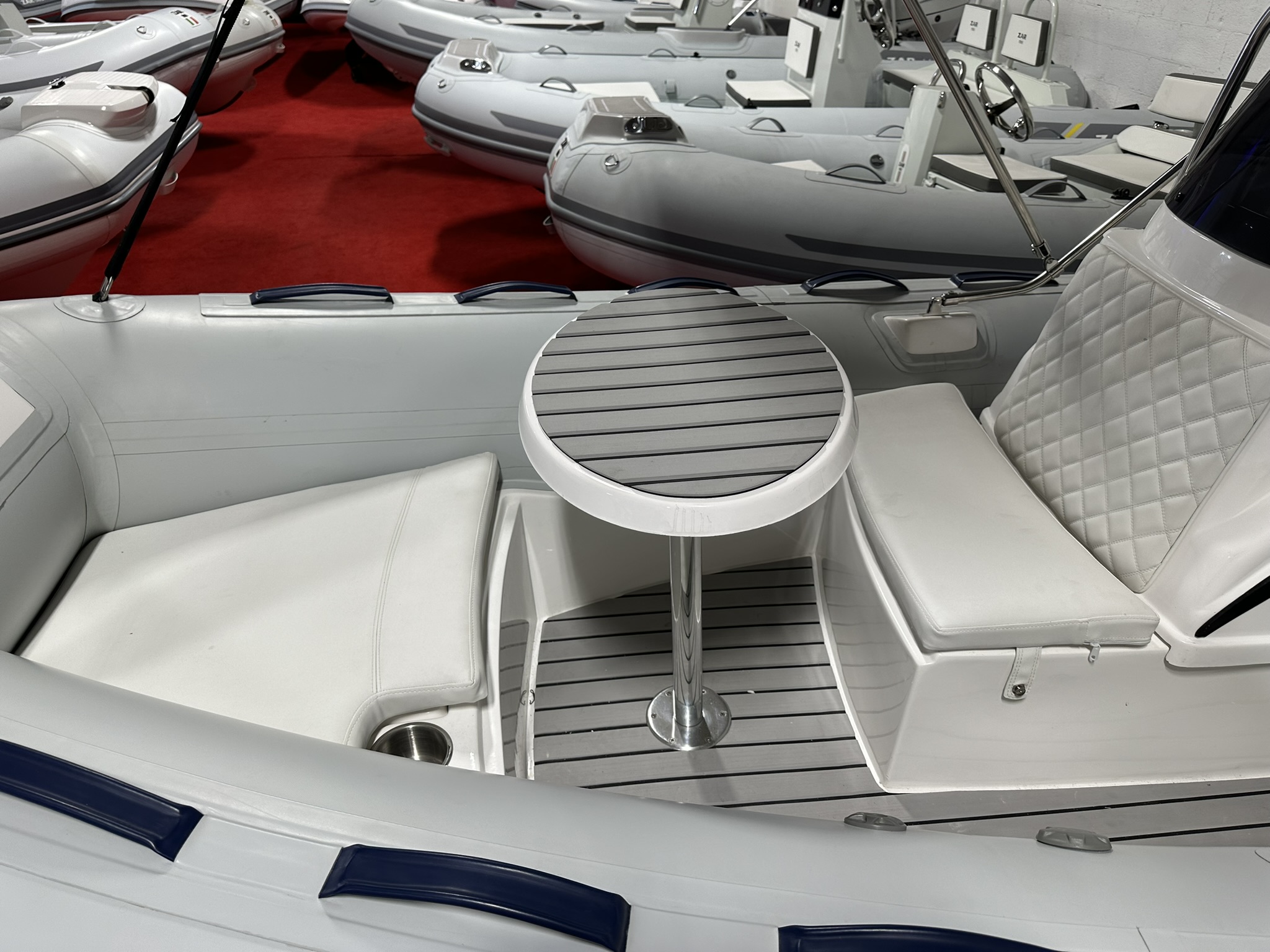 The Tiger Marine 480 SL is stocked with hypalon tube. SeaDeck faux teak, Silvertex cushion set, ski-pole, Nav lights, Bilge Pump, Battery system with cutoff switch, Stainless Steel Bimini Top