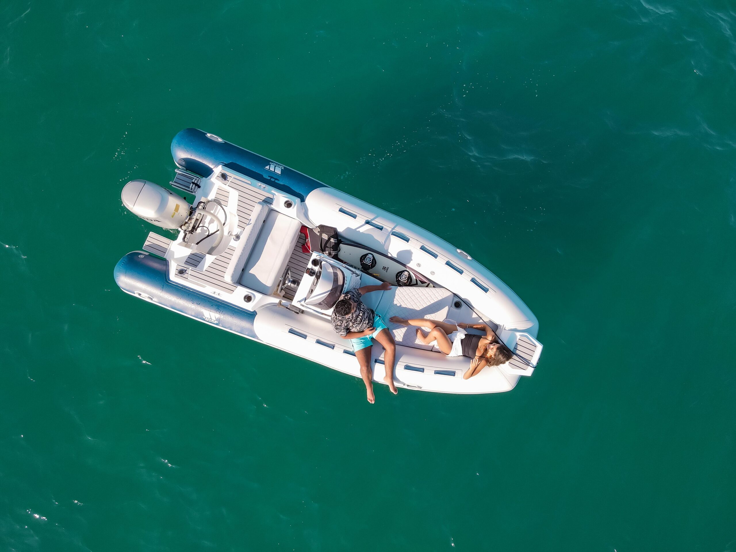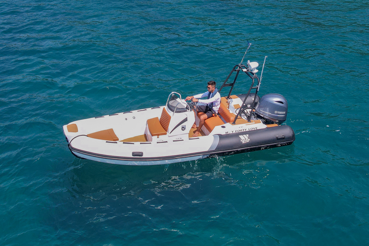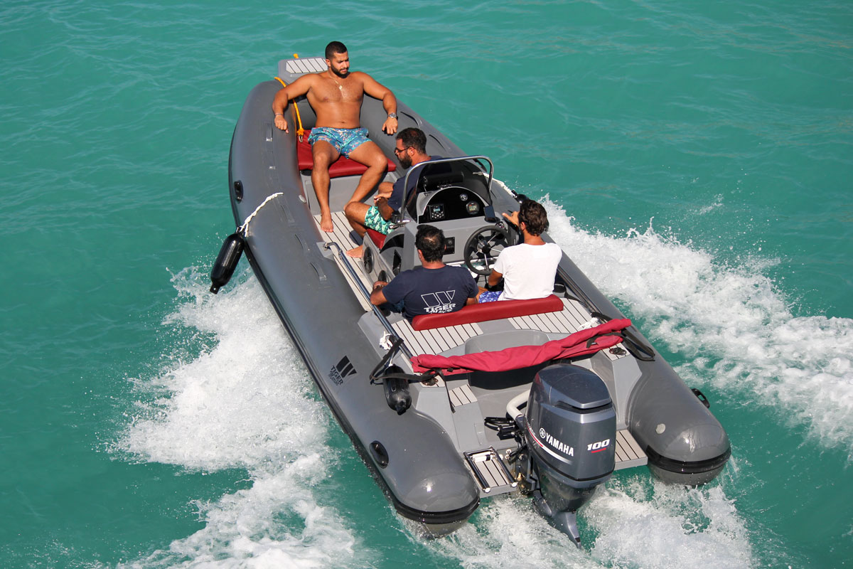 The Tiger Marine 520 SL is stocked with hypalon tube. SeaDeck faux teak, Silvertex cushion set, ski-pole, Nav lights, Bilge Pump, Battery system with cutoff switch, Stainless Steel Bimini Top