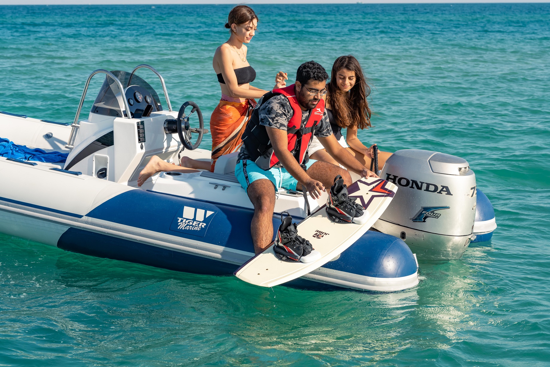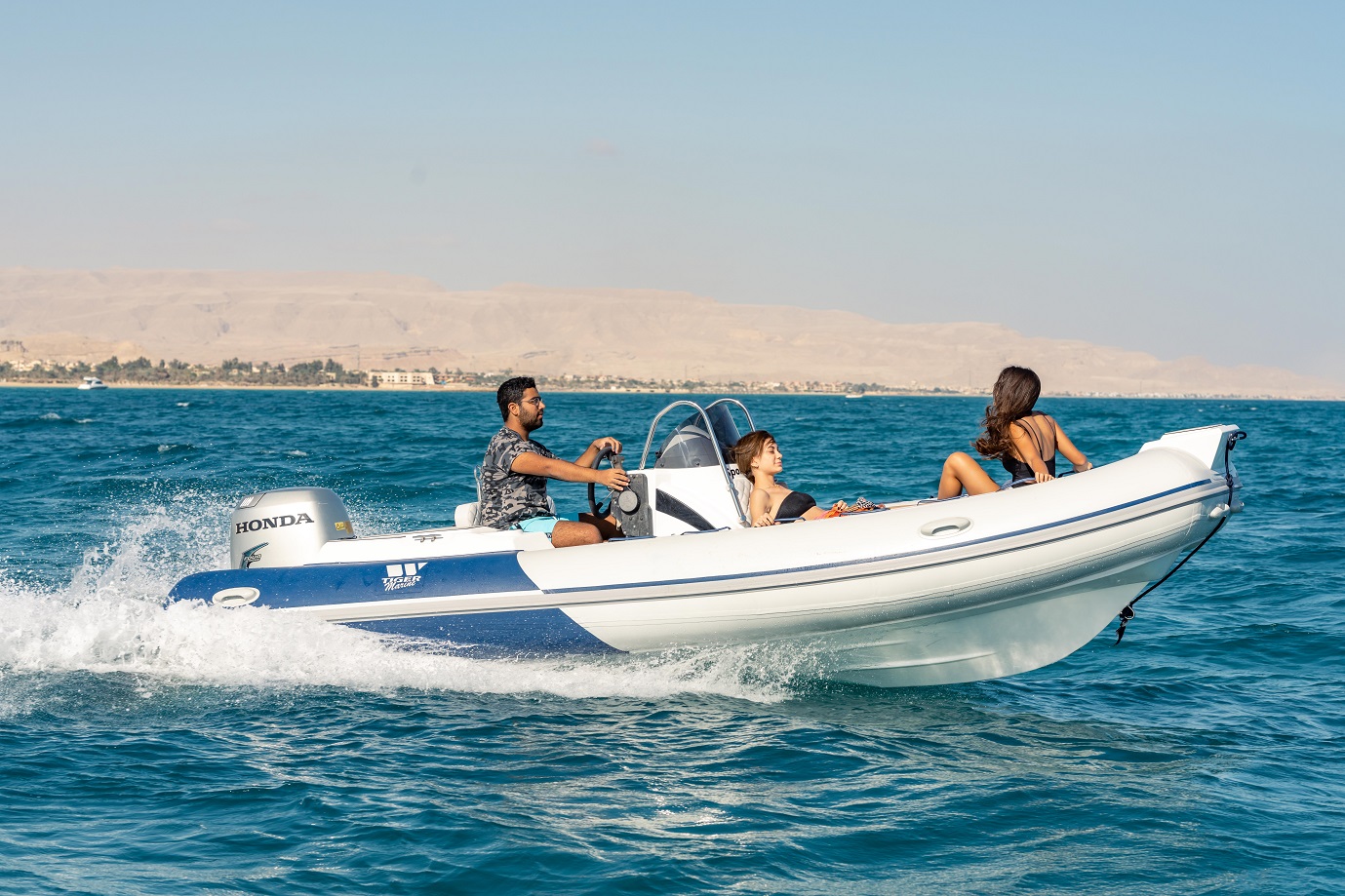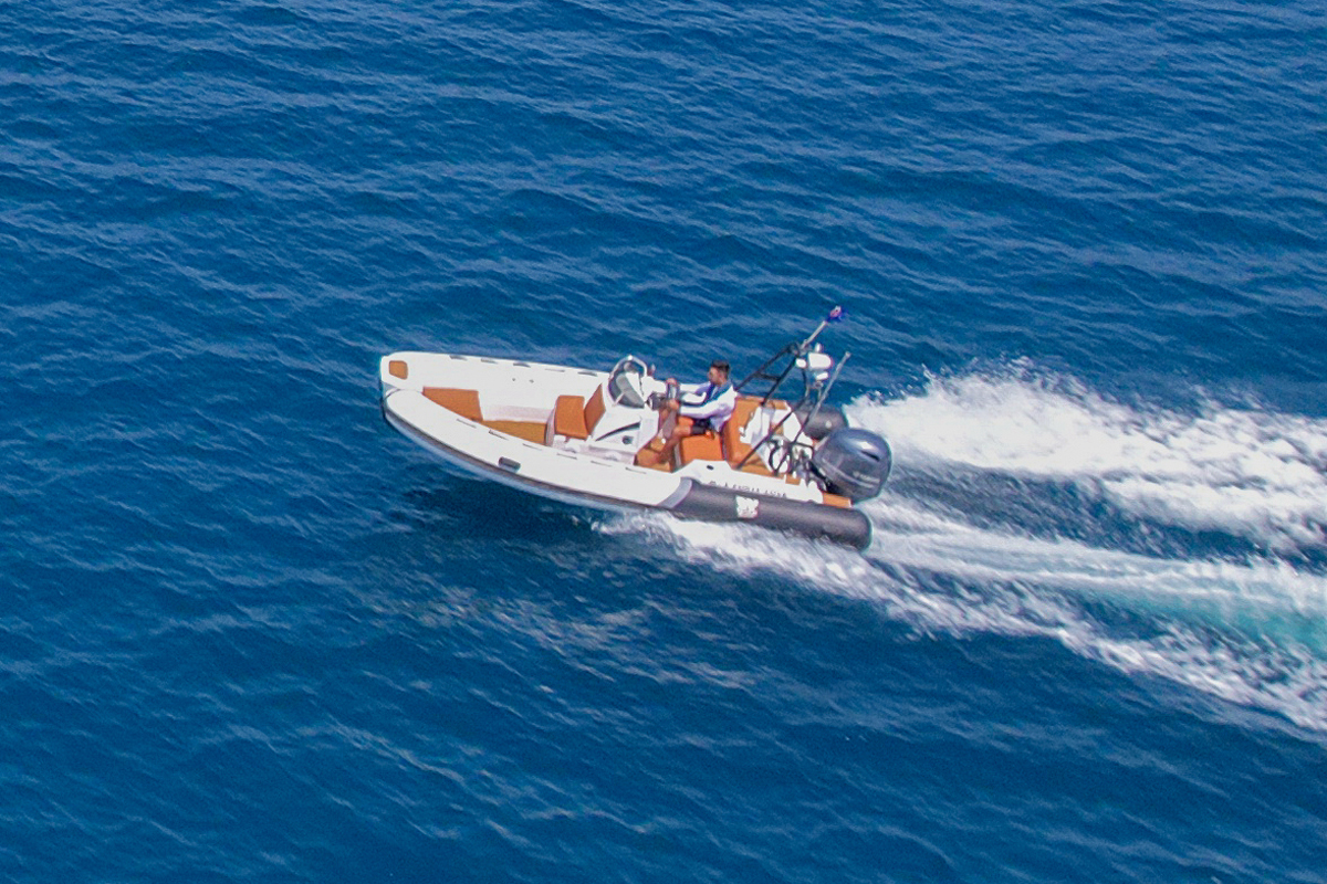 The Tiger Marine 520 SL is stocked with hypalon tube. SeaDeck faux teak, Silvertex cushion set, ski-pole, Nav lights, Bilge Pump, Battery system with cutoff switch, Stainless Steel Bimini Top