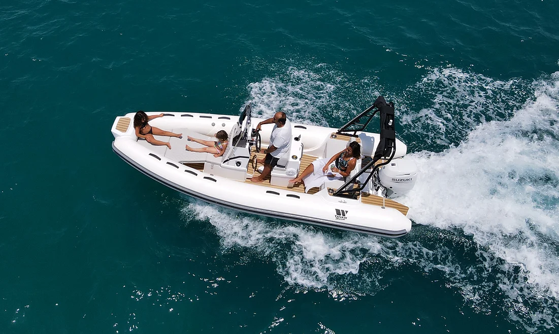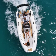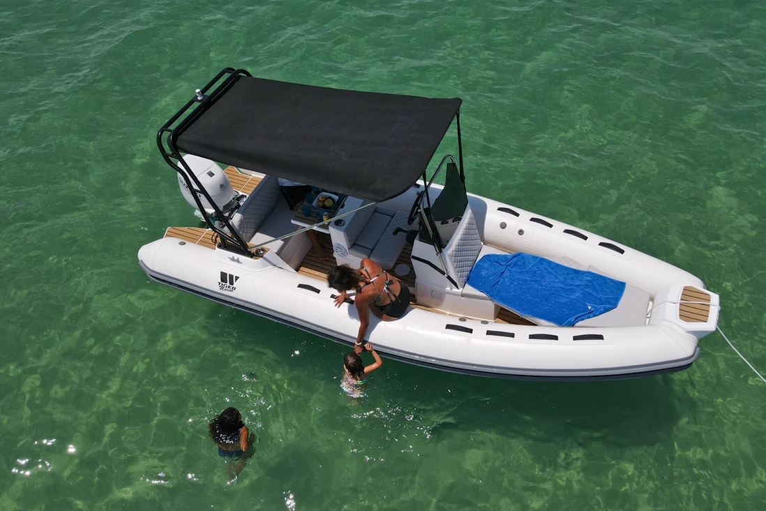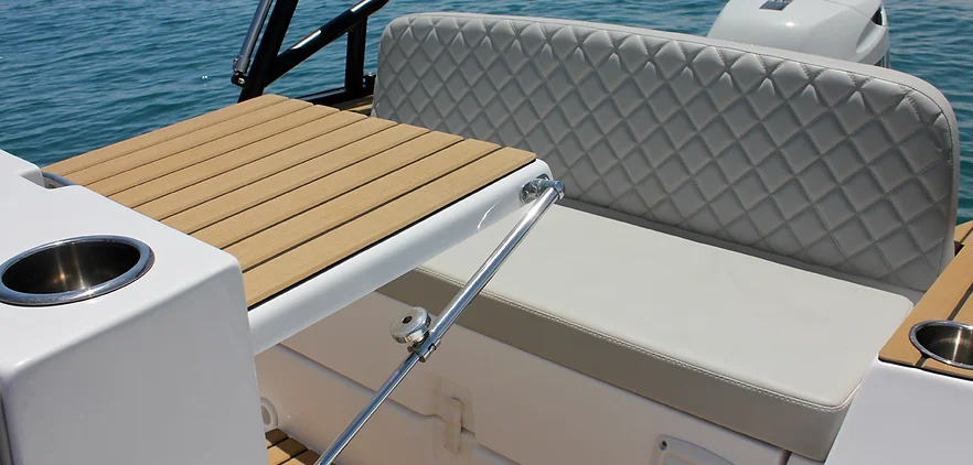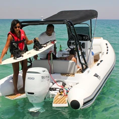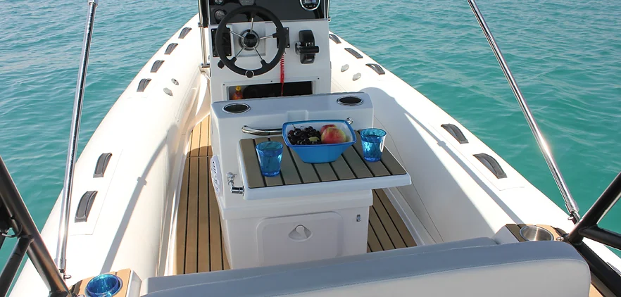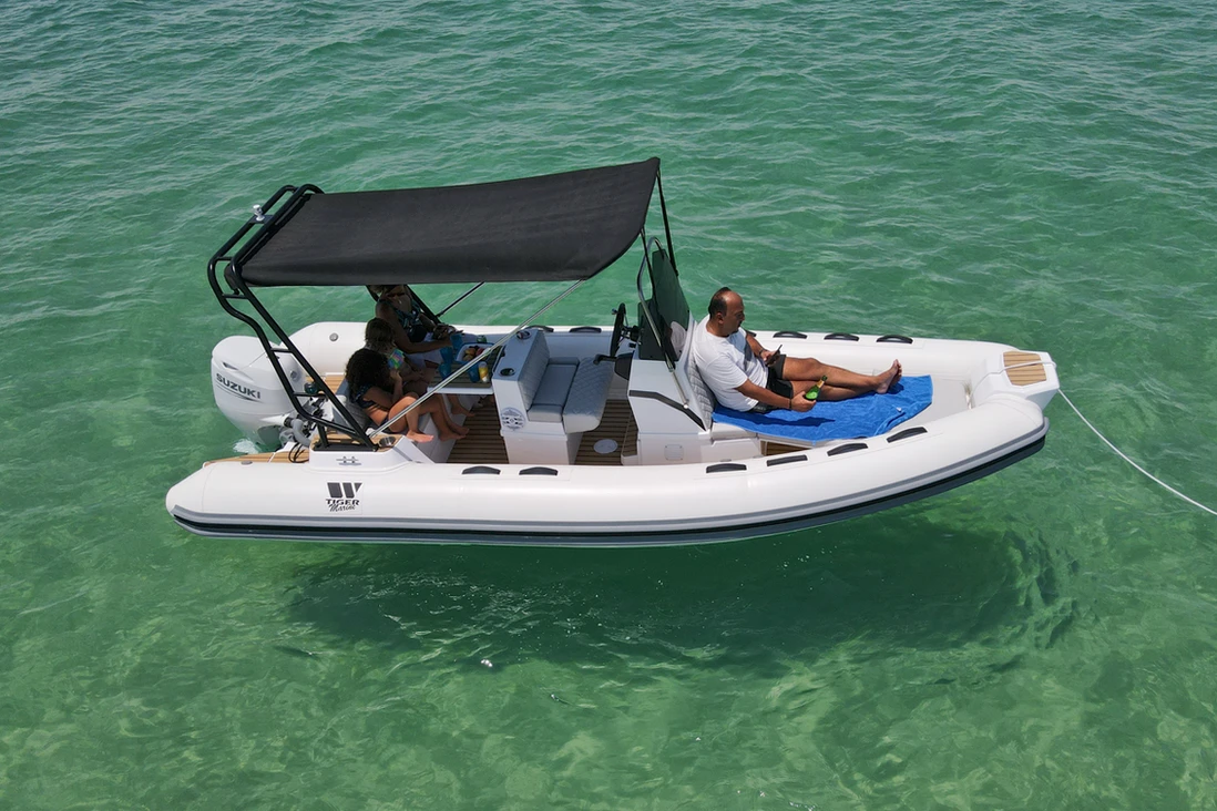 The Tiger Marine 550 PL is stocked with hypalon tube. SeaDeck faux teak, Silvertex cushion set, ski-pole, Nav lights, Bilge Pump, Battery system with cutoff switch.