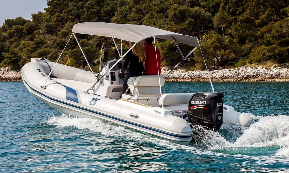 The Tiger Marine 600 OP is stocked with hypalon tube. SeaDeck faux teak, Silvertex cushion set, ski-pole, Nav lights, Bilge Pump, Battery system with cutoff switch, Fiberglass T-top with Aluminum Frame, Swim ladder.