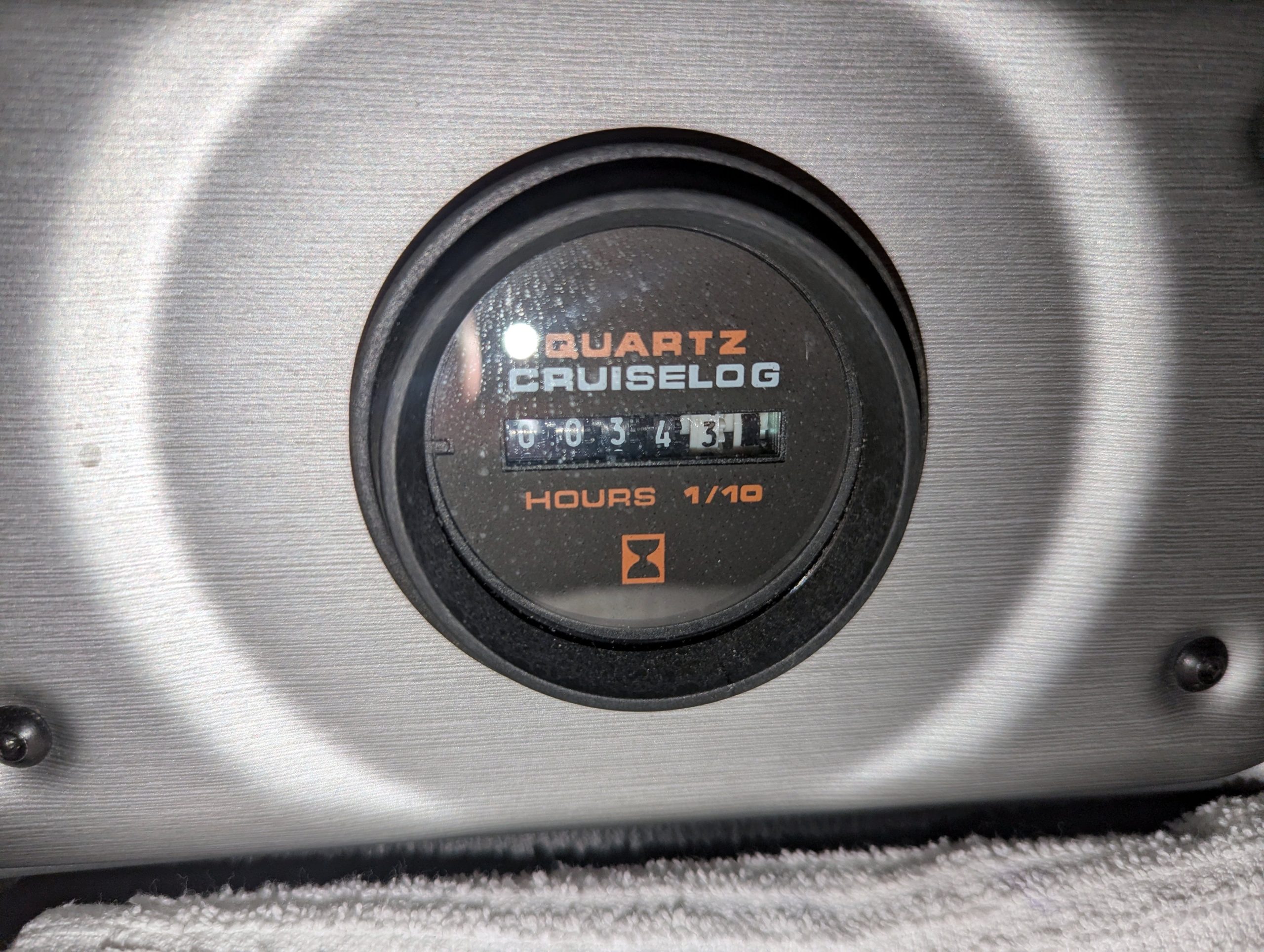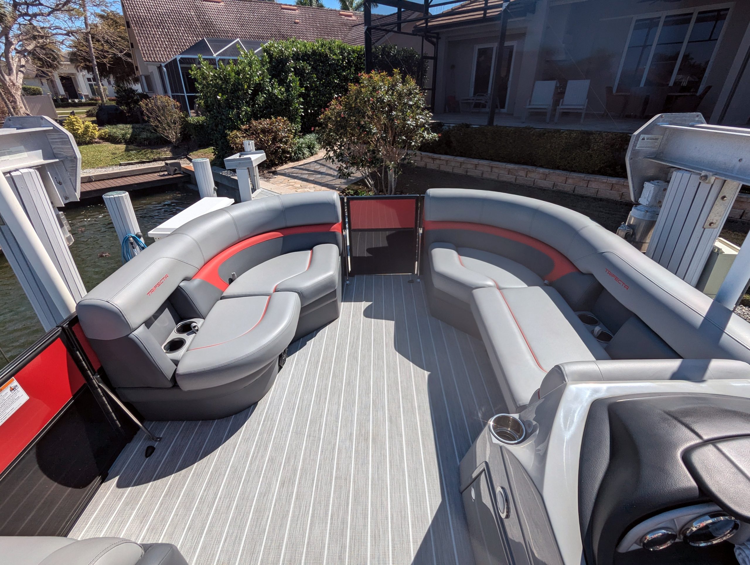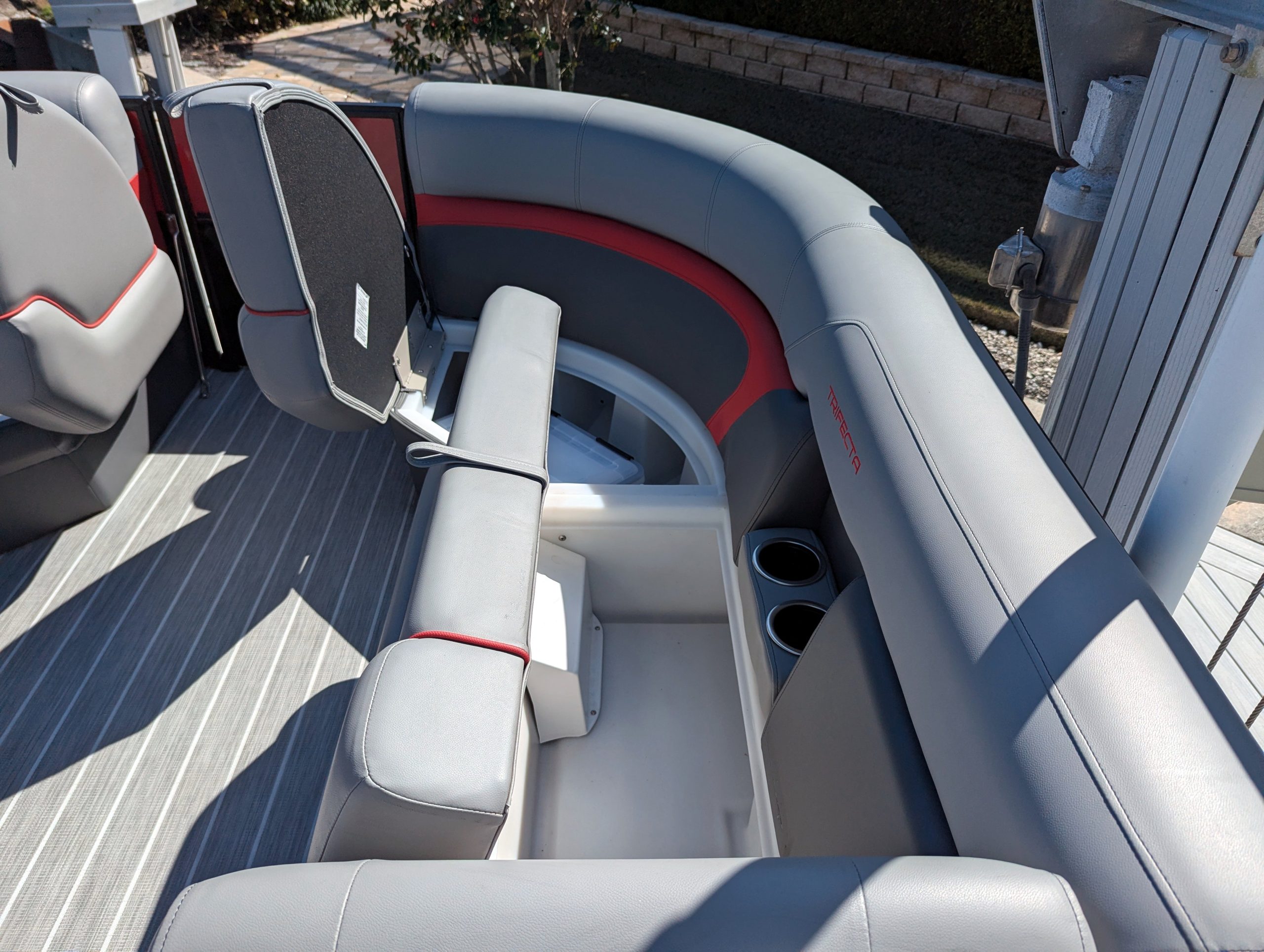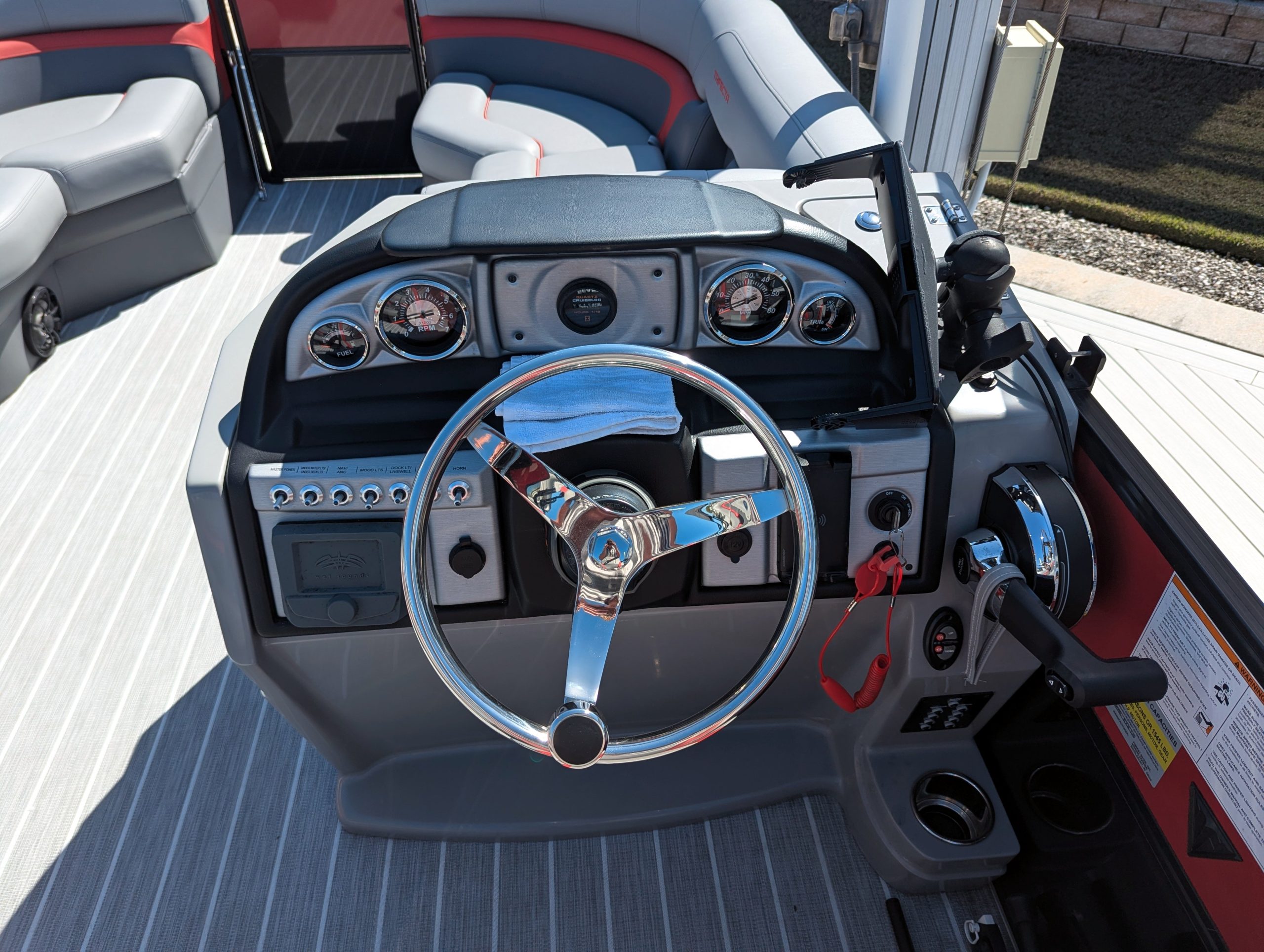 Standard Features: (4) Speakers w/ Protective Inside Covers, 37 Gallon, Direct Fill, Fuel Tank in Motor Pod w/ Fuel / Water Separator, 3/4" One Piece V-Lite Performance Deck, Bimini Top, Trailering Brackets Bow Reinforcement Bumper & Continuous Extruded Aluminum Riser Brackets, Deutsch Waterproof Electrical Wiring Harness, Extended Stern Platform w/ SS Telescoping Ladder,TOval Shaped Silver Matte Table, Port Side Cup Holder, Port Stern Gate, Quick Release Nylon Bimini Brackets, Radius Deck w/ Integrated Deck Trim and Vinyl Rub Rail, Raised Logos, Reinforced Splash Fins, Stainless Steel Cleats, Stainless Steel Cup Holders, Framed/Coated Mid Back Helm Chair w/ Arms & Seat Slider, Stainless Steel Corners Surlast 10' Color Matched Bimini Top w/ Push Pin Quick Release, Surlast Color Matched Playpen Cover Tachometer, Voltmeter, Fuel Gauge, Trim Gauge, 12 Volt Receptacle Transducer Bracket on Starboard Tube Vinyl Wrapped Furniture Bases.