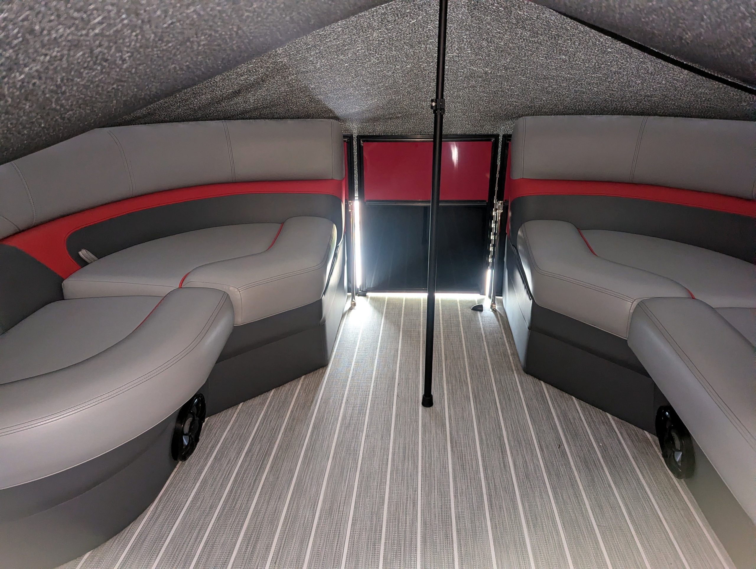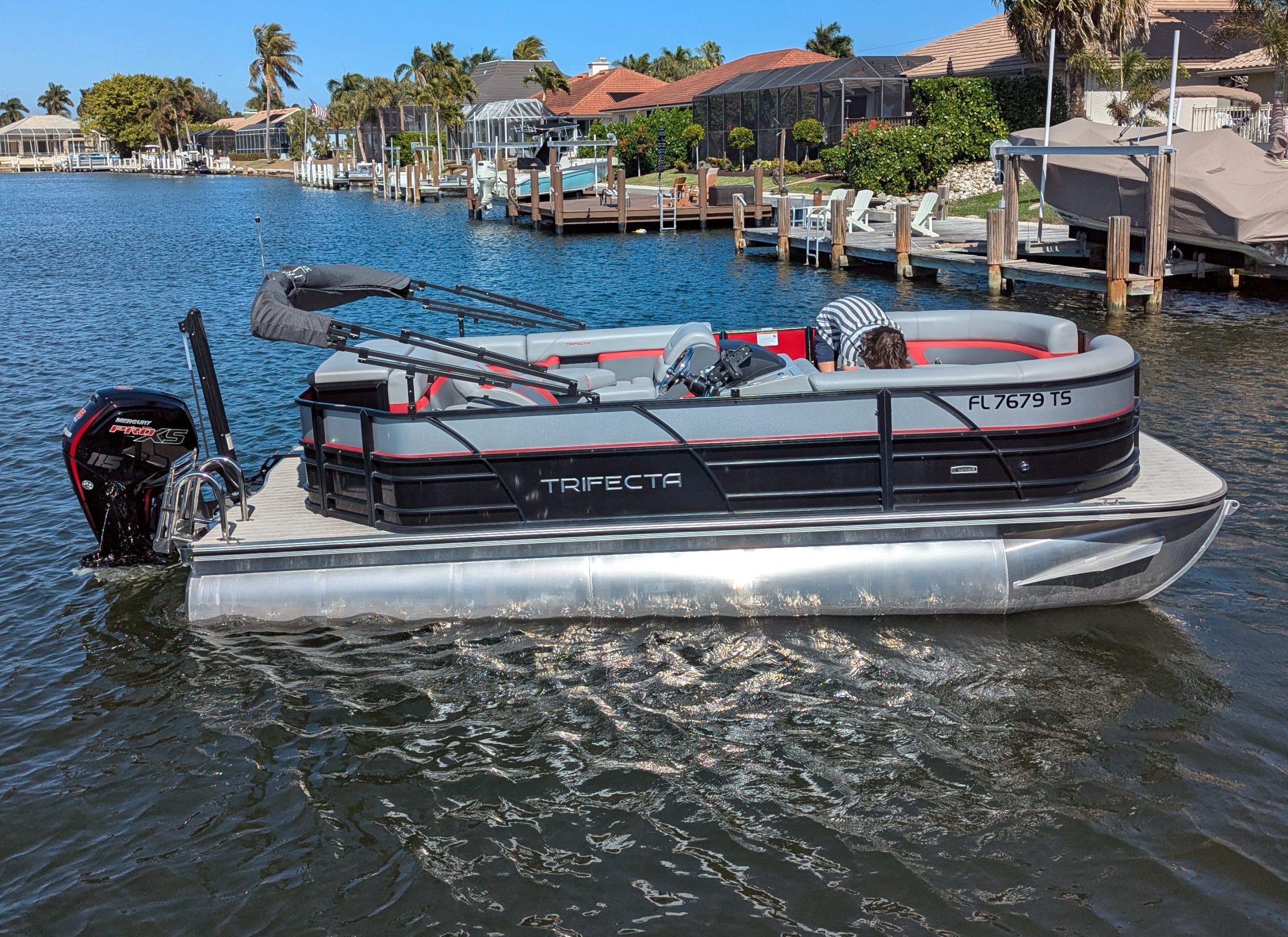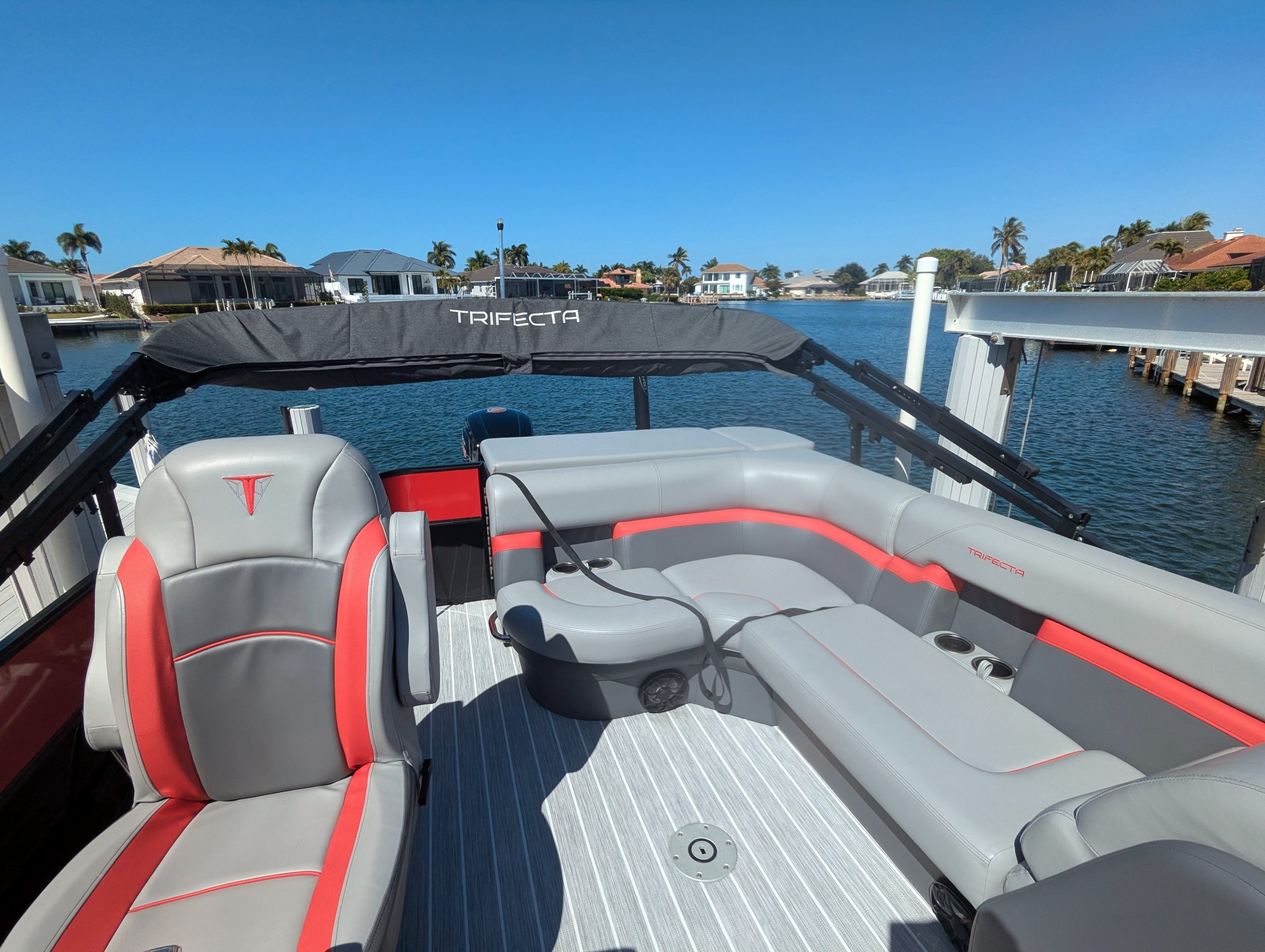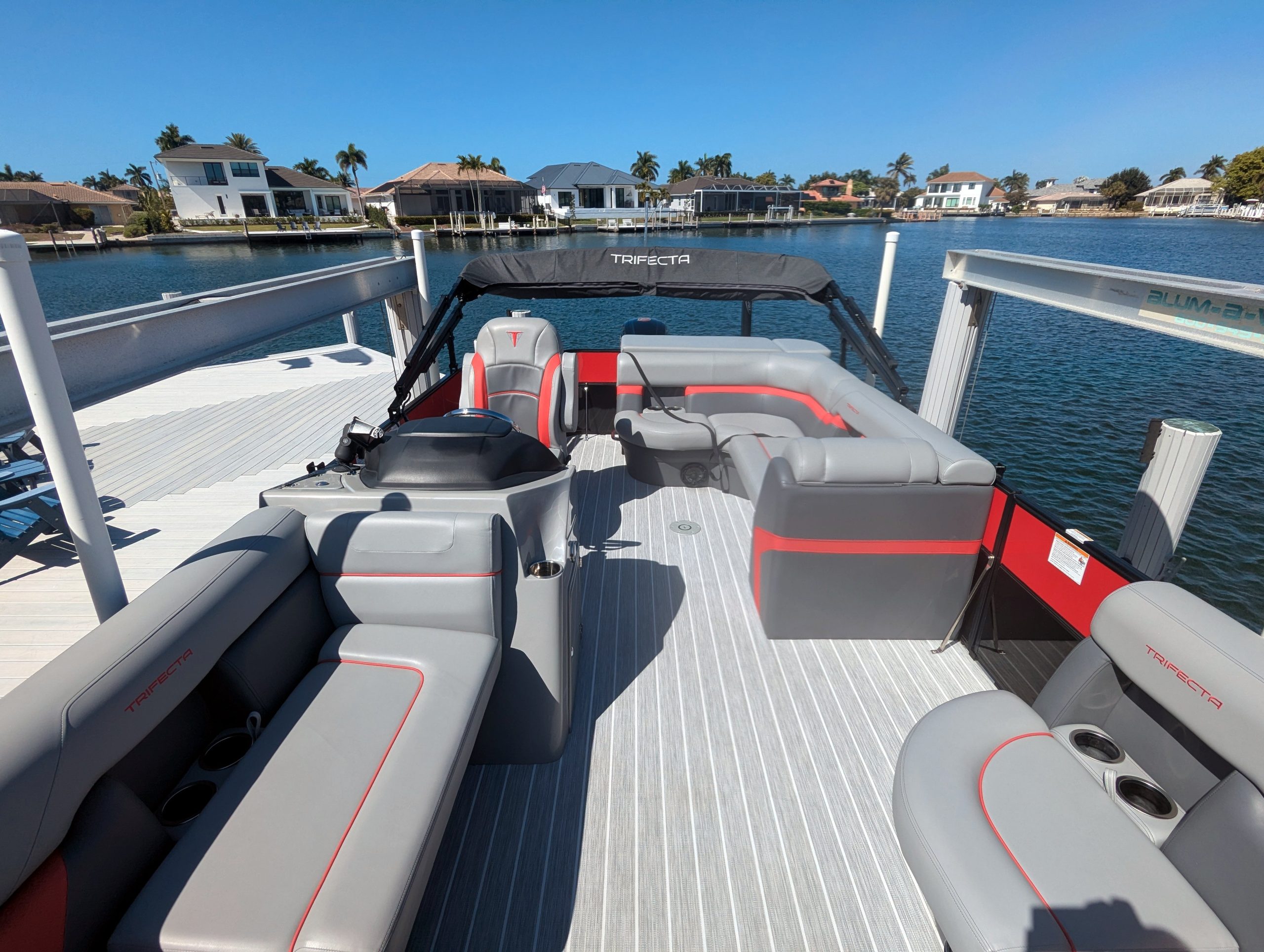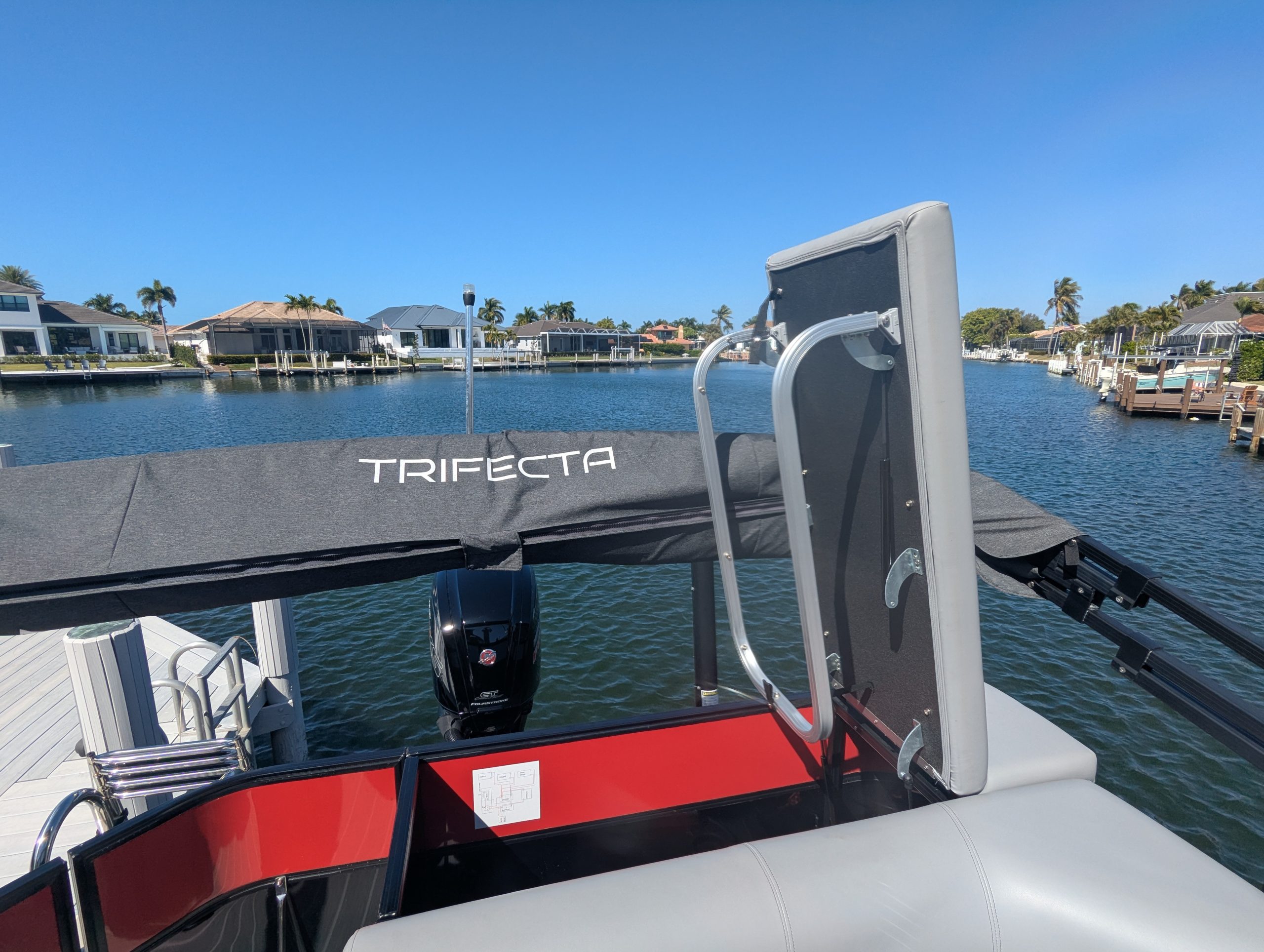 Standard Features: (4) Speakers w/ Protective Inside Covers, 37 Gallon, Direct Fill, Fuel Tank in Motor Pod w/ Fuel / Water Separator, 3/4" One Piece V-Lite Performance Deck, Bimini Top, Trailering Brackets Bow Reinforcement Bumper & Continuous Extruded Aluminum Riser Brackets, Deutsch Waterproof Electrical Wiring Harness, Extended Stern Platform w/ SS Telescoping Ladder,TOval Shaped Silver Matte Table, Port Side Cup Holder, Port Stern Gate, Quick Release Nylon Bimini Brackets, Radius Deck w/ Integrated Deck Trim and Vinyl Rub Rail, Raised Logos, Reinforced Splash Fins, Stainless Steel Cleats, Stainless Steel Cup Holders, Framed/Coated Mid Back Helm Chair w/ Arms & Seat Slider, Stainless Steel Corners Surlast 10' Color Matched Bimini Top w/ Push Pin Quick Release, Surlast Color Matched Playpen Cover Tachometer, Voltmeter, Fuel Gauge, Trim Gauge, 12 Volt Receptacle Transducer Bracket on Starboard Tube Vinyl Wrapped Furniture Bases.
