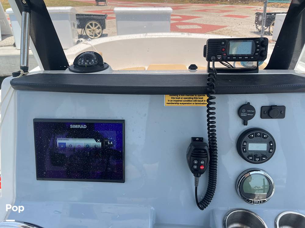 The helm is under a nice T-top with a Simrad GPS, VHF radio, Lenco trim tabs, and a Bluetooth stereo. There is a nice storage area under the console to stow your gear!