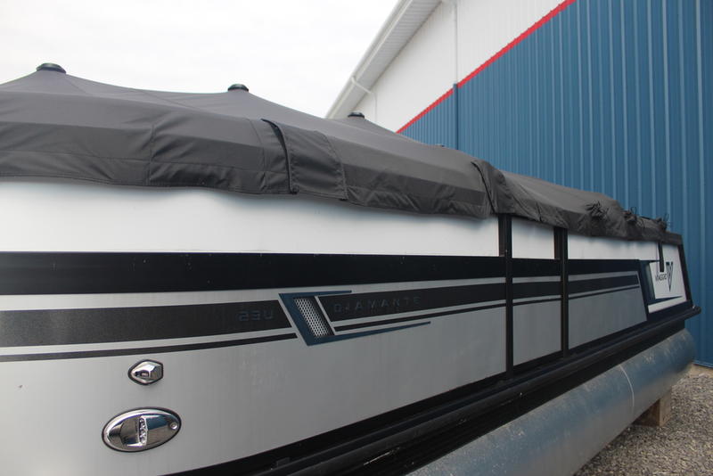 The interior is white/dark graphite with flint accents. It is powered by a Mercury 150 XL motor and includes the Tripletoon Performance Package. Options include teak flooring in slate color, Pro Series ski tow bar, stainless fold down cleats, additional USB port, Platinum Console with Simrad GO7 and Platinum Furniture Package. Prep, Tax and DMV fees are additional charges. Trailer available additionally.