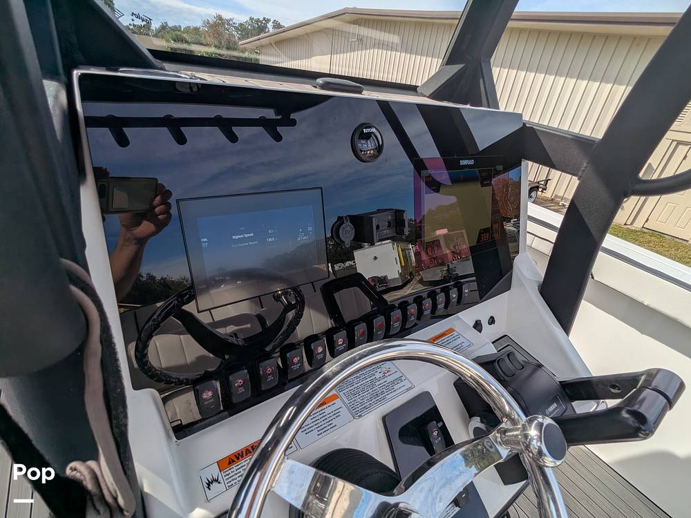 The helm is outfitted with advanced technology, featuring a 7-inch Connext touchscreen and a large 12-inch Simrad electronics display for navigation and control, complemented by a premium marine stereo system.