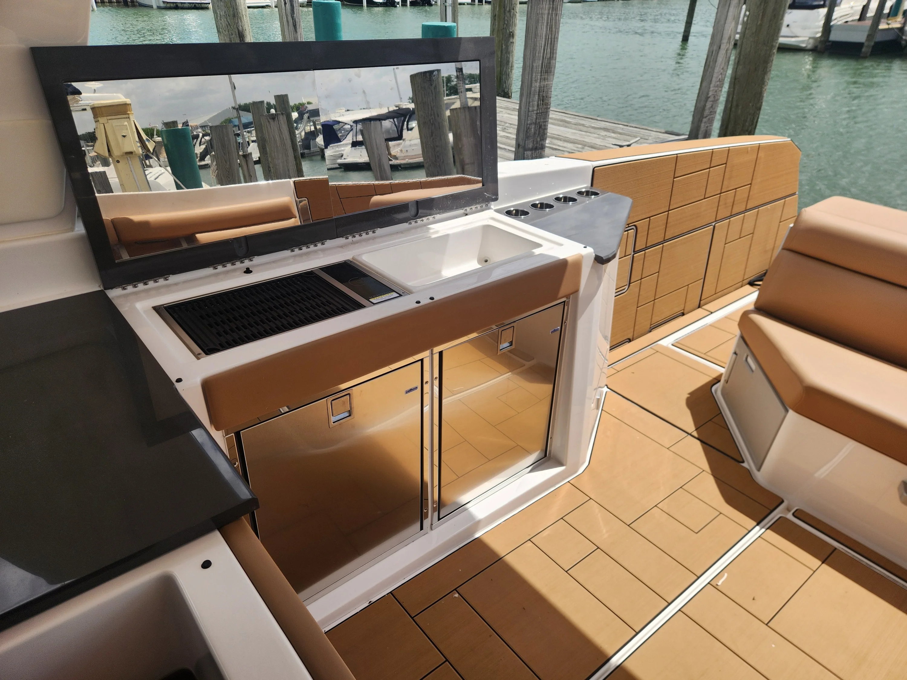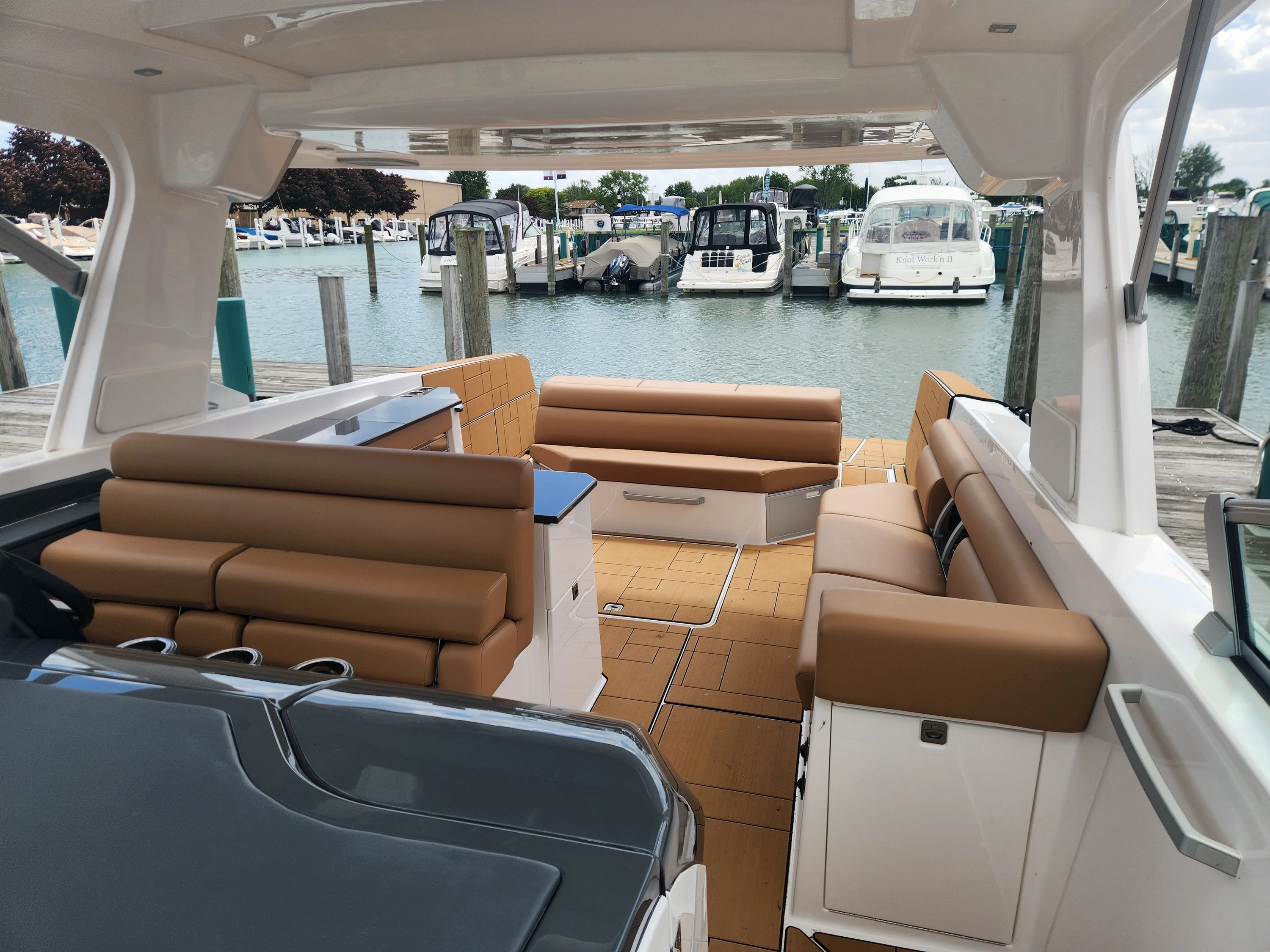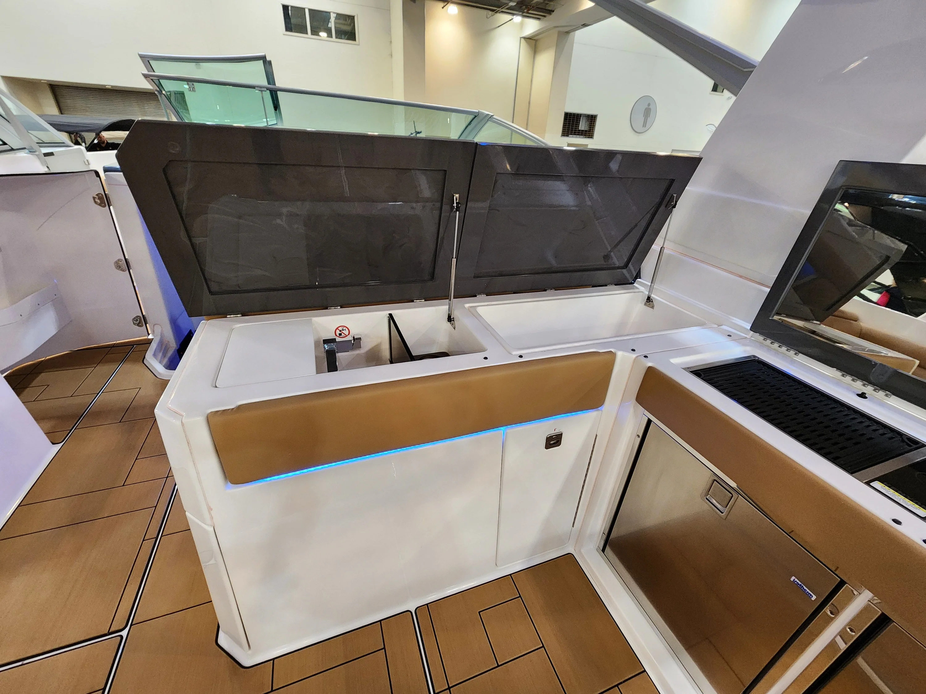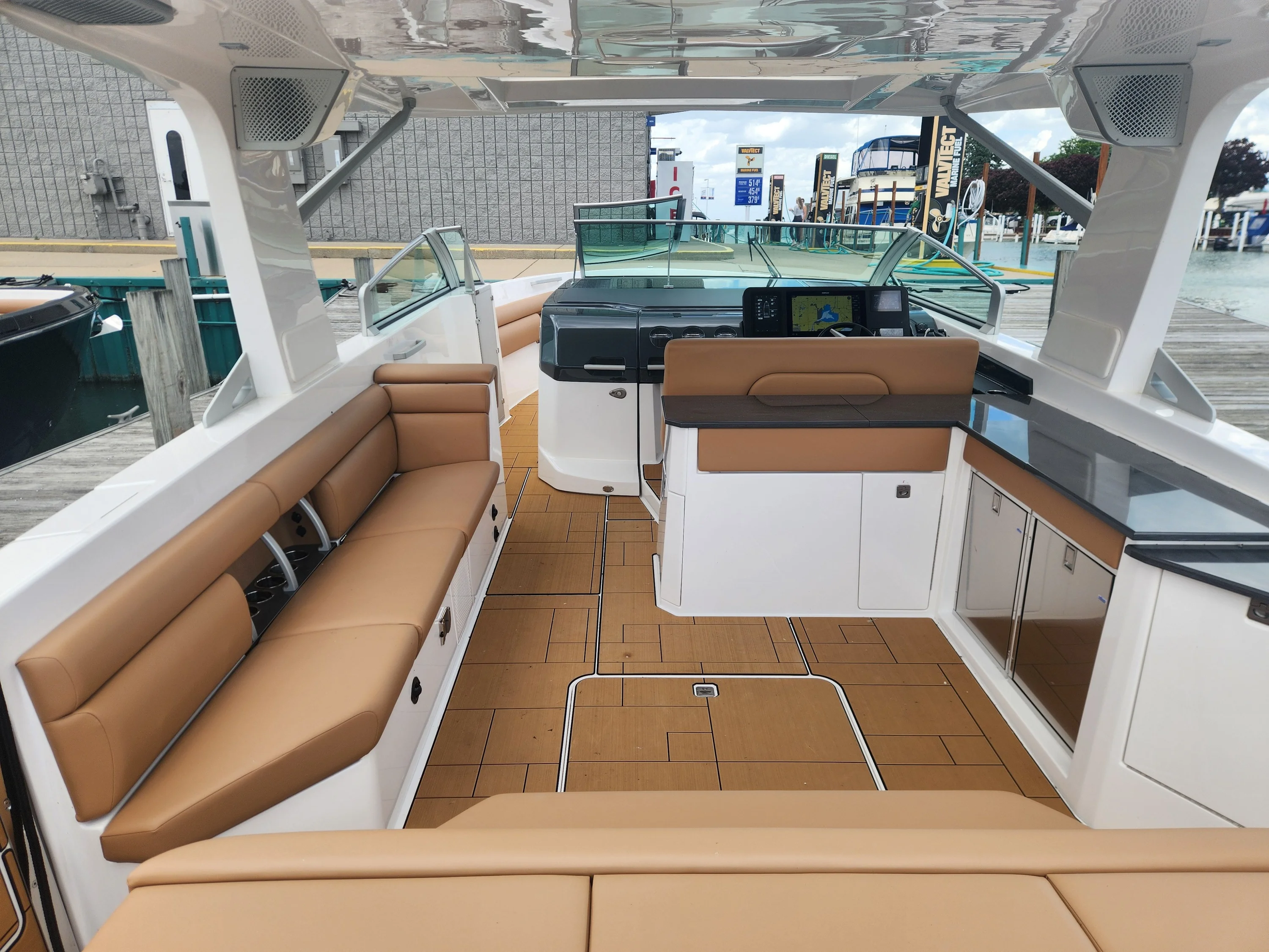 Contact us to findĀ out ALL available savings! The AV40 extends days on the water, together. Twin fold-down terraces convert into additional deck space to accommodate all the people you care about most. While a spacious cabin below that sleeps four includes a queen bed as well as a convertible lounger. Host a party from the premium helm, cook a gourmet meal, rest in the cabin, swim off the submersible platform, or just take in the beauty of the water from the convertible barstool-style seating - the AV40 can handle it all - on the same day.