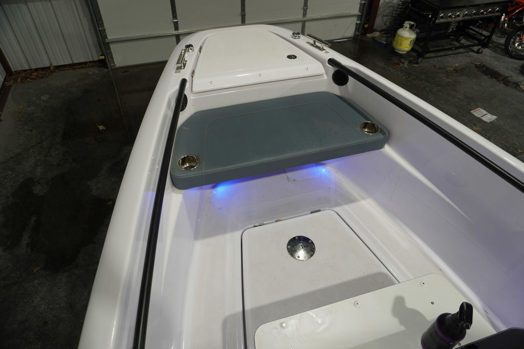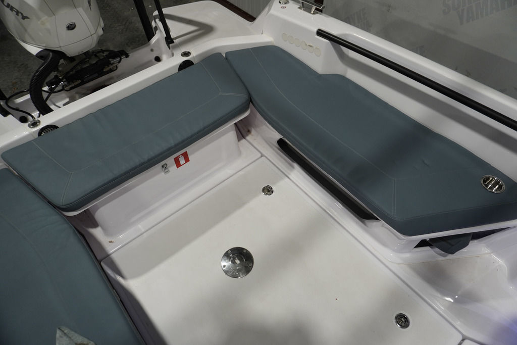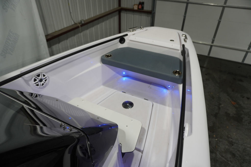 Hull and deck- Walk-around center console deck layout w. enclosed aft deck, T-Top roof with light mast, Large center console w. storage/optional toilet compartment, Mid sofa w. lockable storage below on aft deck, Hand laminated hull with Vinylester resin for the first coat for osmosis prevention of the hull in GRP material, Twin-stepped hull w. “sharp entry bow”, Integrated engine bracket in hull for outboard engines, Fixed aluminum fuel tank 230l w. overflow prevention, Anti-skid finishing on deck areas and hatches, Self-draining deck area w. quick drain aft deck, All hardware, locks, hinges, filler caps & grab rails in 316 stainless steel or powder coated black, 4 x cleats, Bow & stern eyes 316 stainless steel, LED navigation lights on fore deck, Removable anchor light, Spacious anchor locker w. drainage in bow, Rope holders in anchor locker on fore deck & aft sofa, Adjustable windscreen in plexi glass w. black rasterization, Wind deflectors on center console, In-floor fore deck storage, Large in floor aft deck storage compartment w. gas strut assisted hatch, Storage on side panels, Storage pocket for center console wall, Battery tray w. mount & splash proof main fuses in aft sofa storage, Signal horn, Two electric bilge pumps w. auto-function, Manual bilge pump, Integrated swim platforms and concealed telescopic bathing ladder.