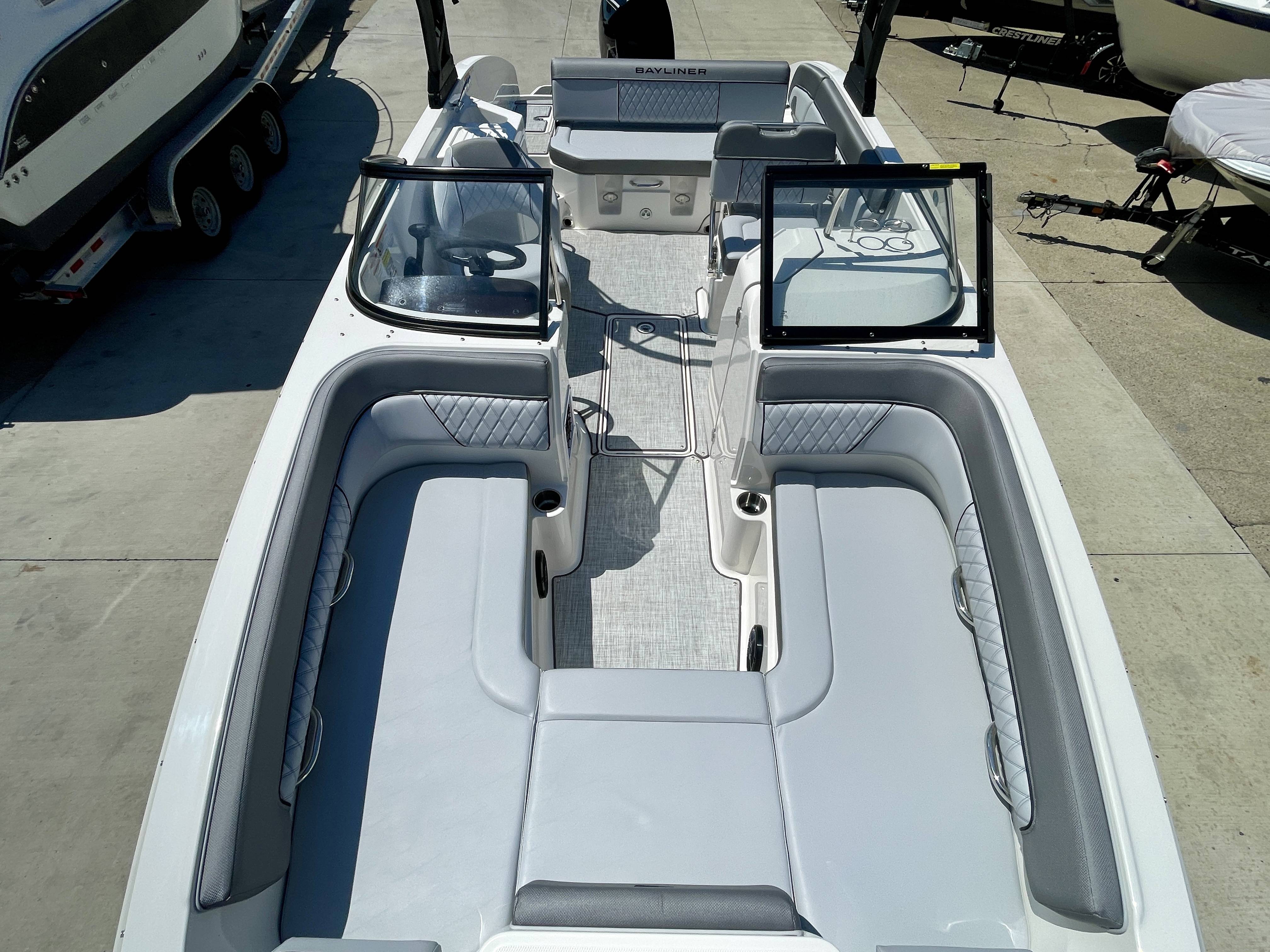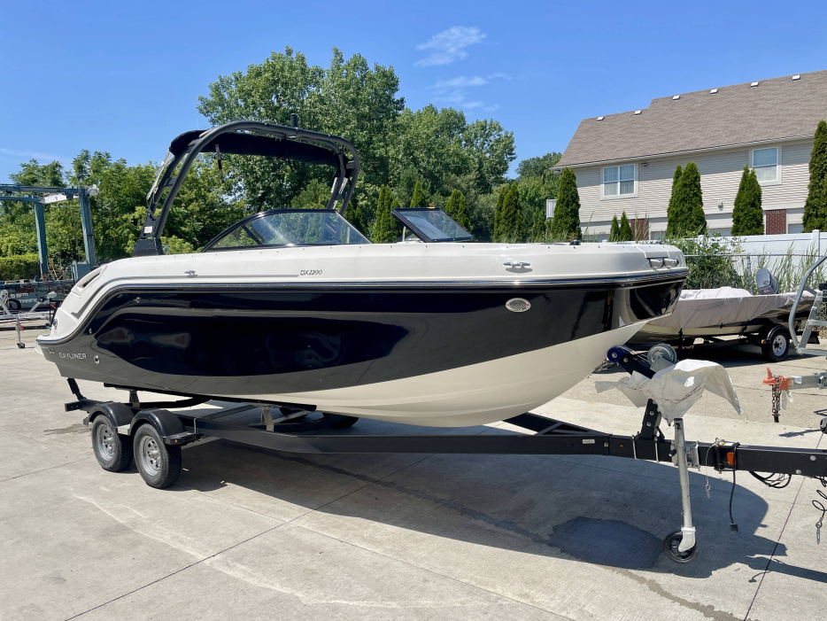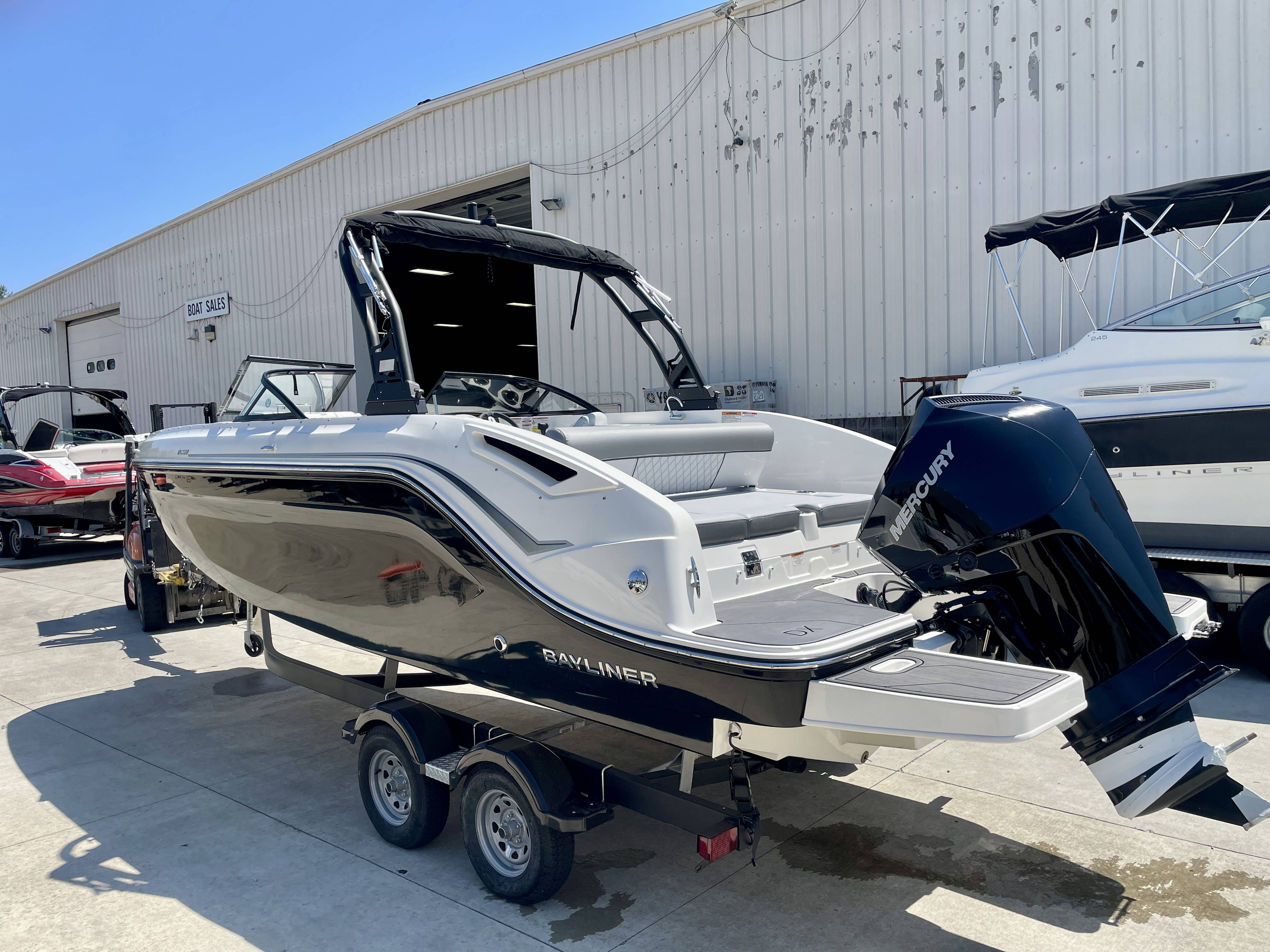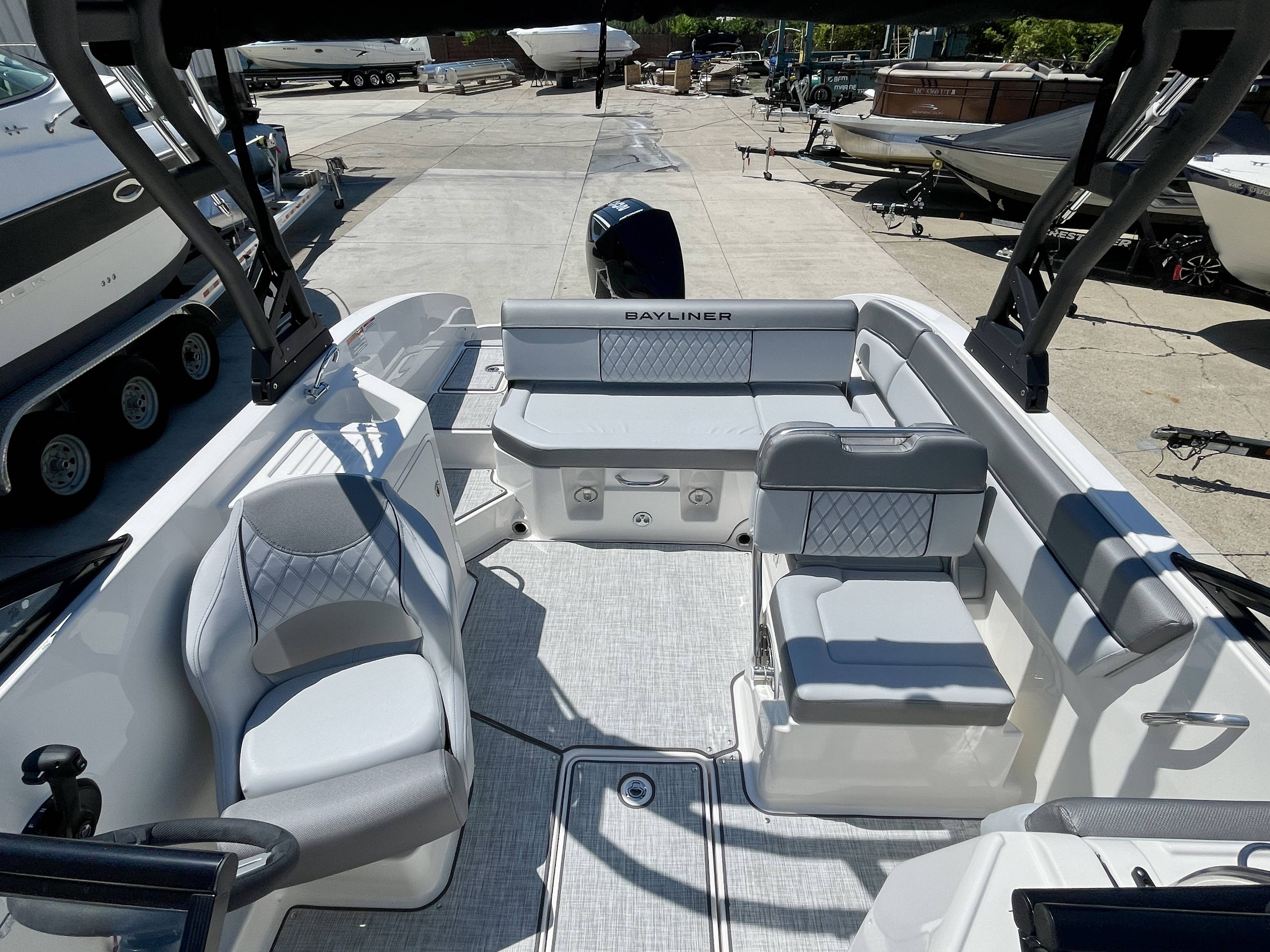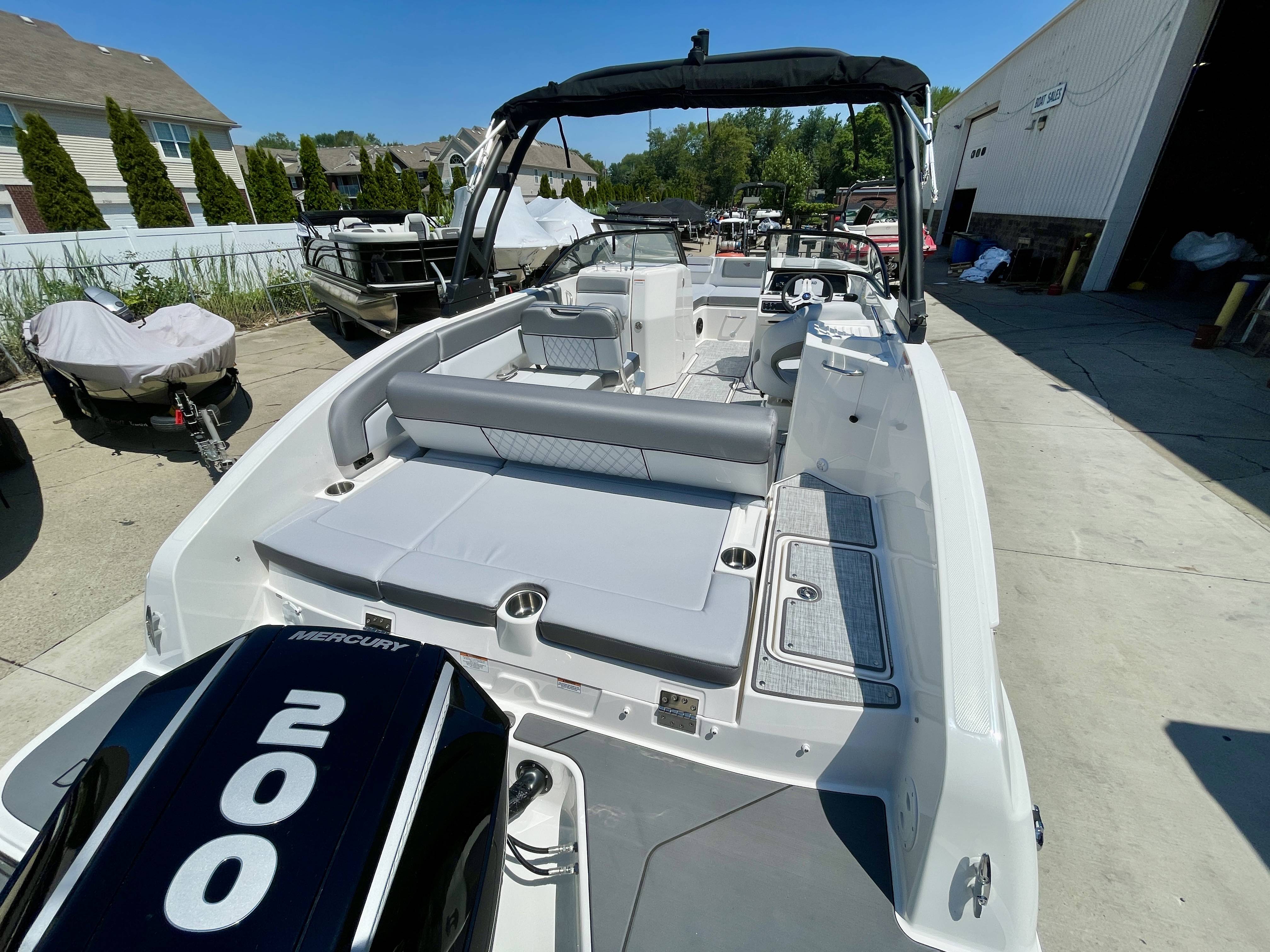 Factory Options:Mercury 200XLTrailer includedExterior- black hull sides with white bottomInterior- DX series graphitePower steeringStainless steel upgrade packageSki tow pylonProarc tower with integrated topFull windshield with opening center panelBow filler cushionBow well & cockpit coverSnap in seagrass flooring- graySwim platform gray matExtended swim platform gray matTransom shower with demand water systemDigital dash with mercury vessel view linkCockpit tableStereo- Rockford Fosgate