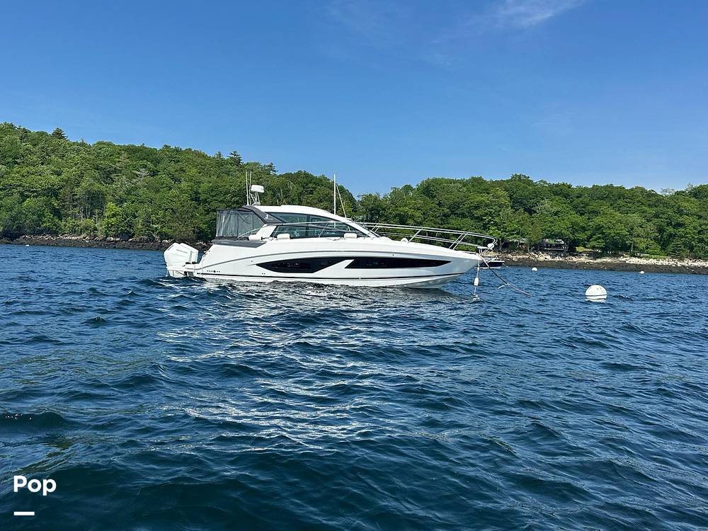 The vessel is powered by twin Mercury engines and includes Joystick control for effortless docking and maneuvering. Below deck, a bright and modern interior with impressive 6'5" headroom awaits with two private cabins.