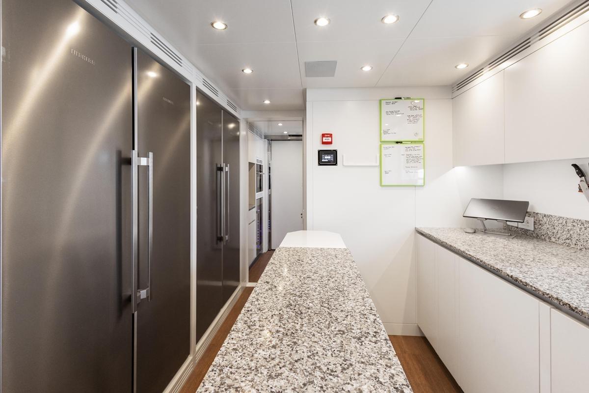 6 luxurious cabins sleeping up to 12 guests · expansive salon and dining areas · flybridge and beach club lounges · full galley with Miele appliances (oven, microwave, dishwasher, BBQ) · washer/dryer · multiple refrigerators & freezers (Frigomar, Isotherm) · entertainment suite with TVs and sound system