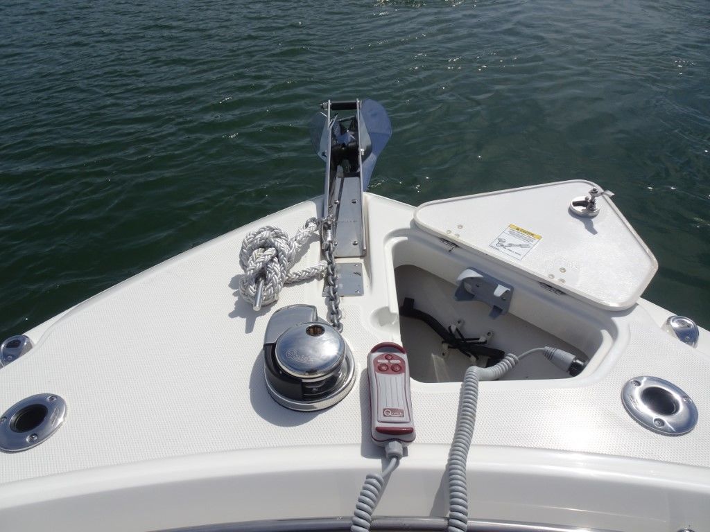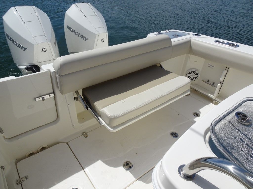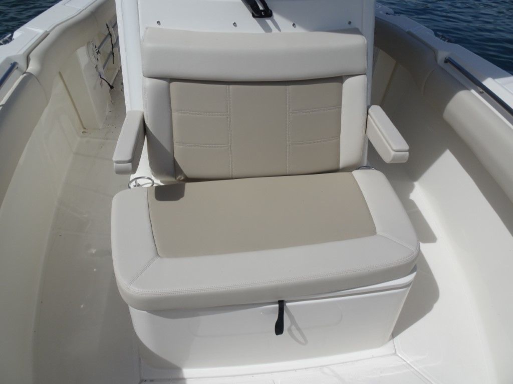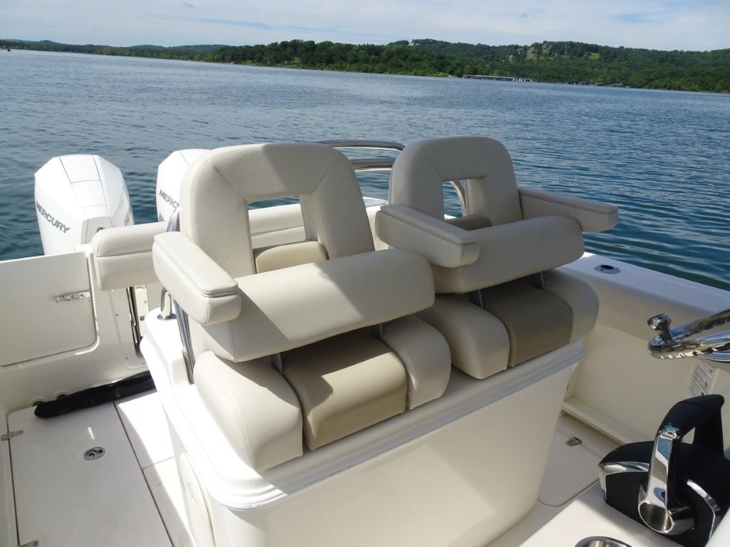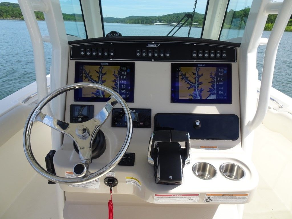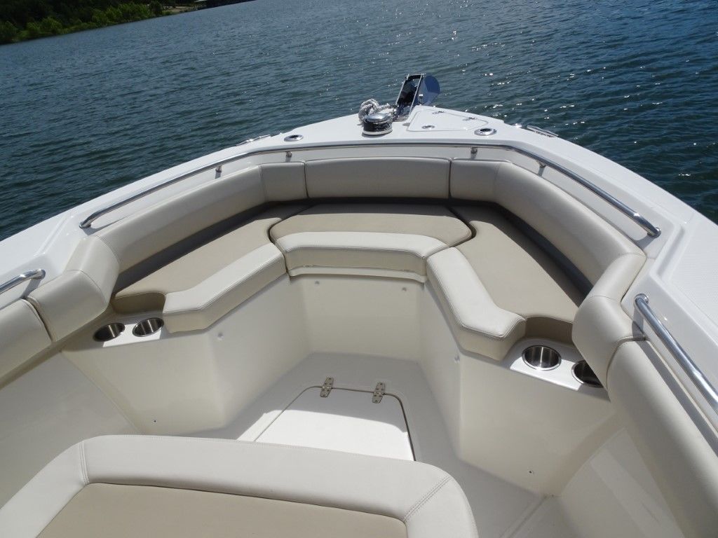 Premium Pkg (8" cross tie cleats at transom, bow cushions, cockpit line holders (4), deluxe helm seating: captain's chair with companion seat and armrests, drink holders (8) - stainless steel, forward coaming bolsters, pullout sprayer in console (under gunnel storage shelves), Vessel View 4” display (network connections to Simrad with navigation package), fender clips – stainless steel, pull-out, flush mounted (Qty 4), Vacu-Flush toilet, holding tank, overboard discharge and dockside pump-out)