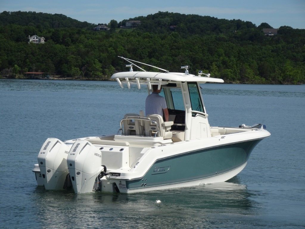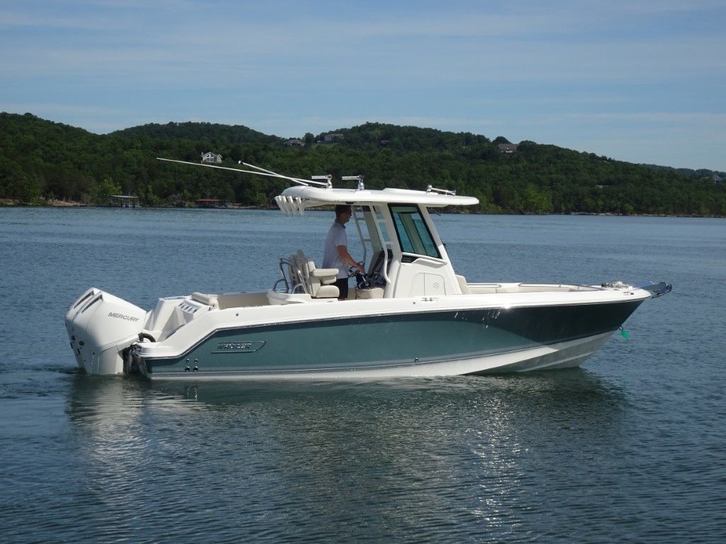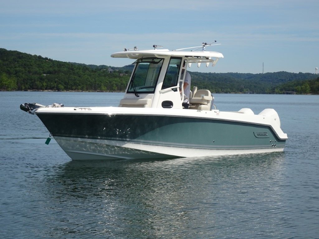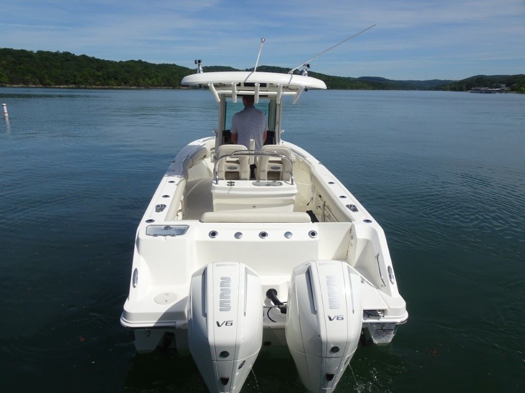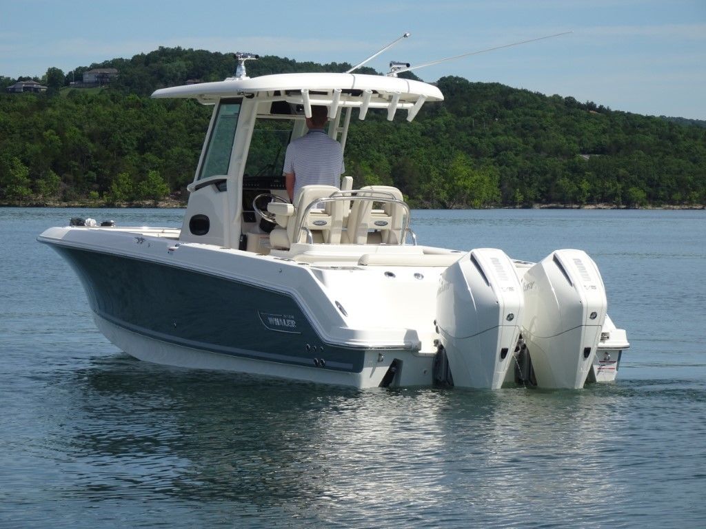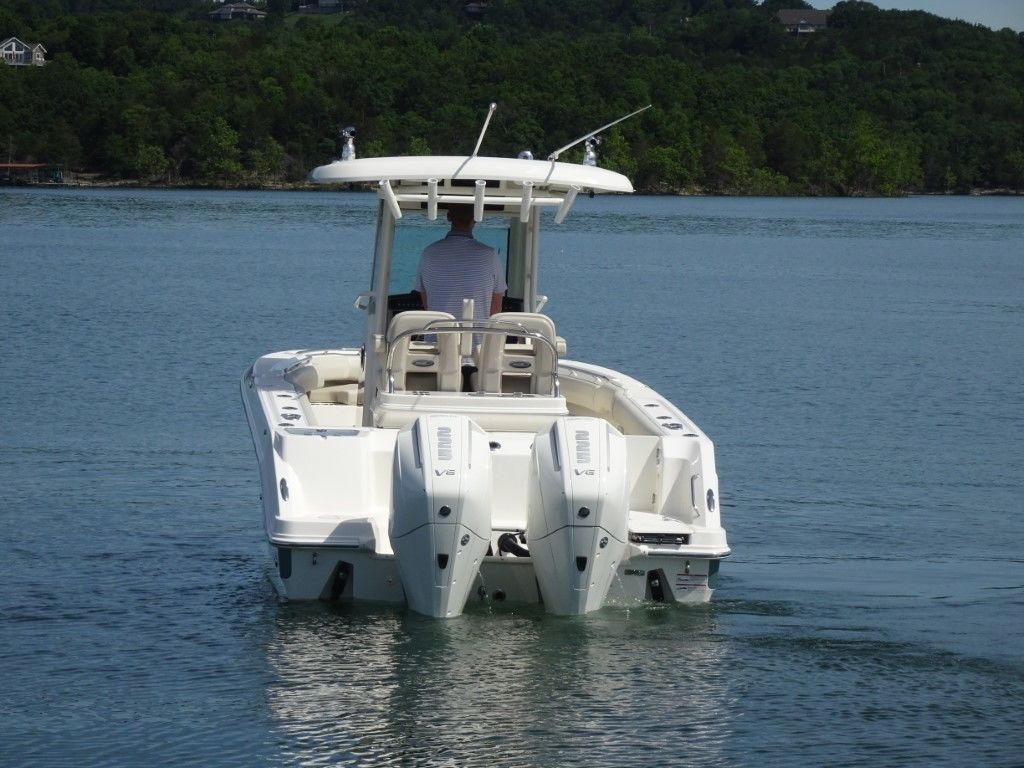 Premium Pkg (8" cross tie cleats at transom, bow cushions, cockpit line holders (4), deluxe helm seating: captain's chair with companion seat and armrests, drink holders (8) - stainless steel, forward coaming bolsters, pullout sprayer in console (under gunnel storage shelves), Vessel View 4” display (network connections to Simrad with navigation package), fender clips – stainless steel, pull-out, flush mounted (Qty 4), Vacu-Flush toilet, holding tank, overboard discharge and dockside pump-out)