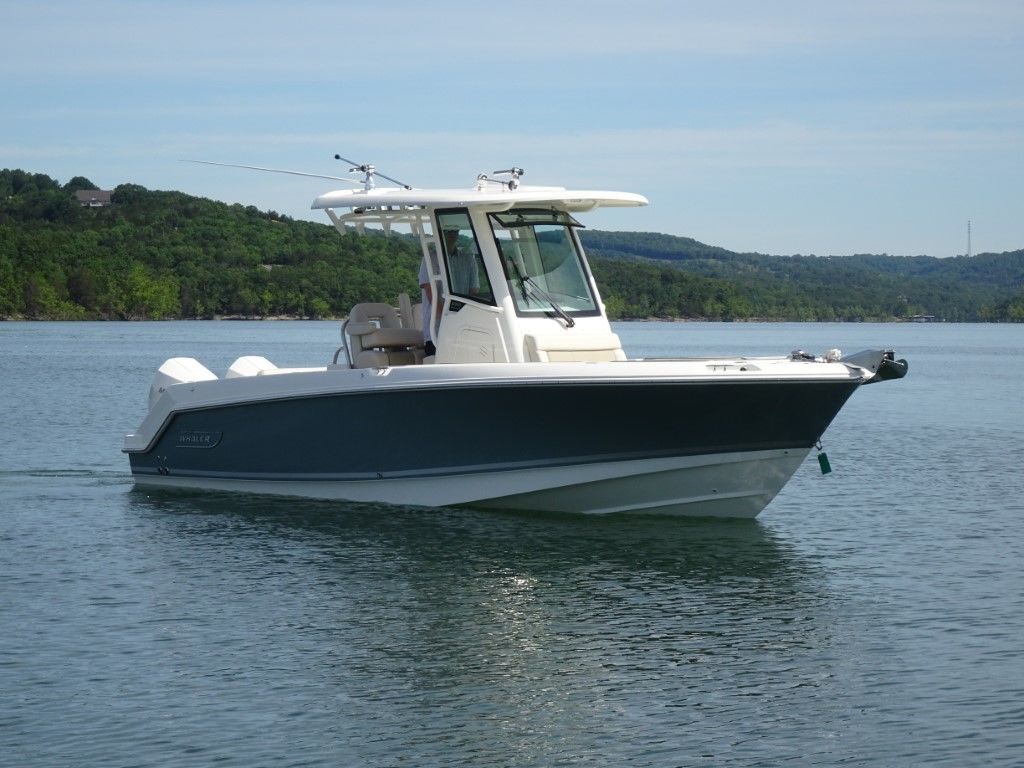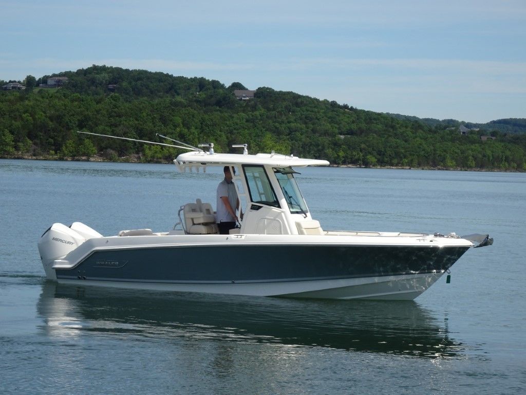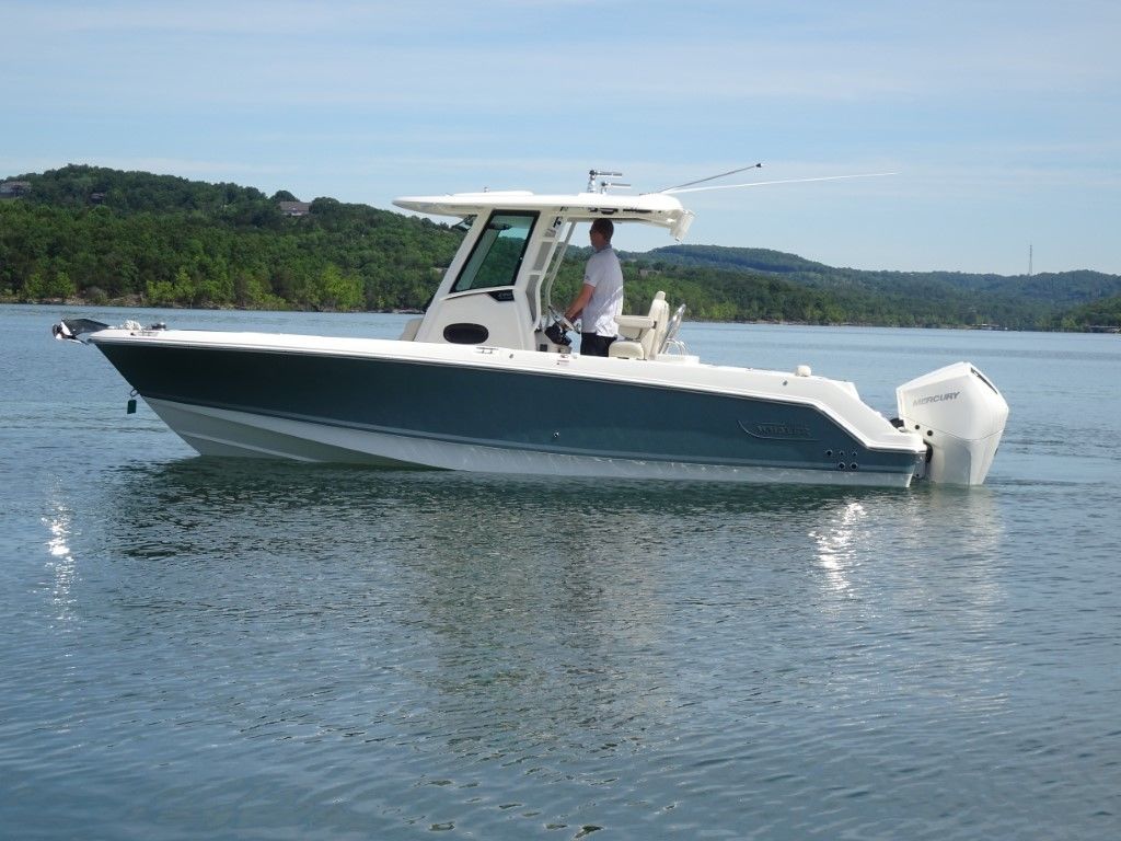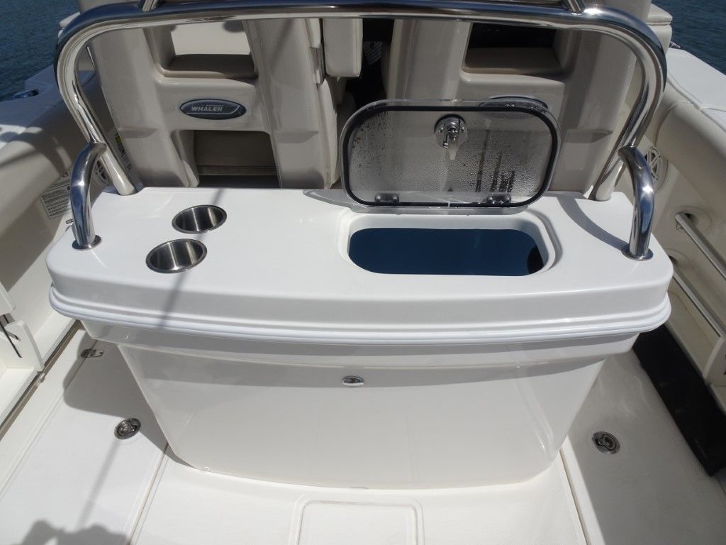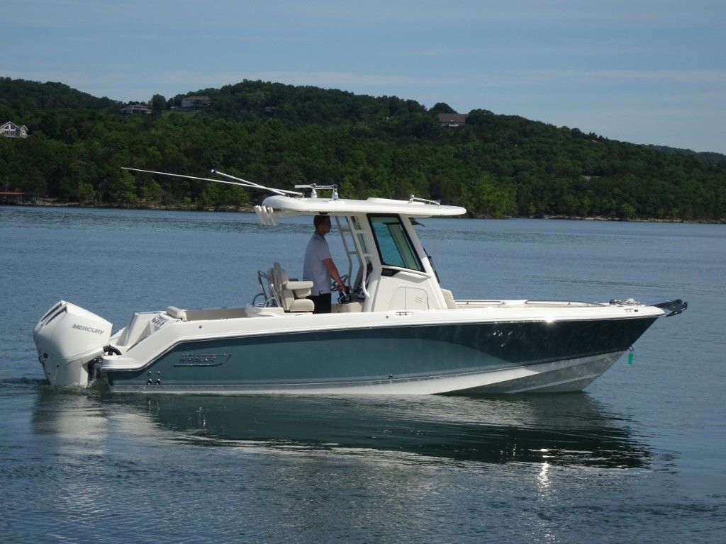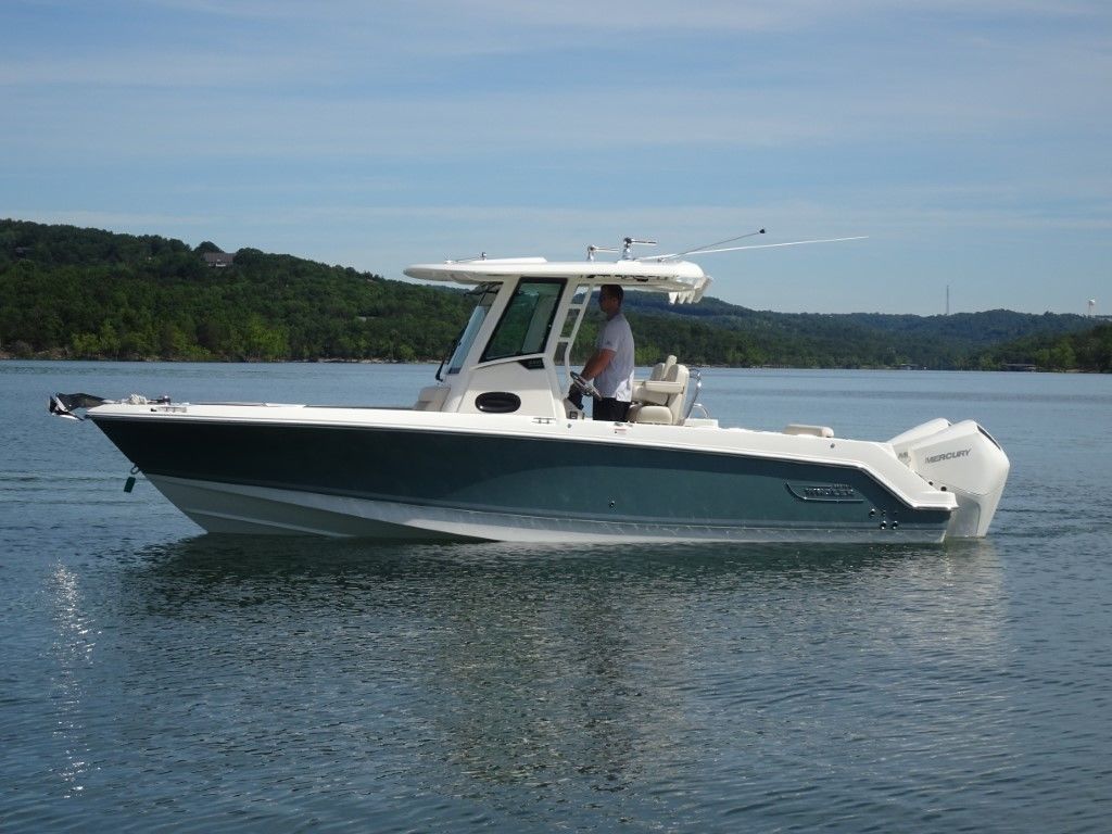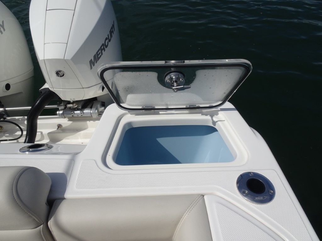 Premium Pkg (8" cross tie cleats at transom, bow cushions, cockpit line holders (4), deluxe helm seating: captain's chair with companion seat and armrests, drink holders (8) - stainless steel, forward coaming bolsters, pullout sprayer in console (under gunnel storage shelves), Vessel View 4” display (network connections to Simrad with navigation package), fender clips – stainless steel, pull-out, flush mounted (Qty 4), Vacu-Flush toilet, holding tank, overboard discharge and dockside pump-out)