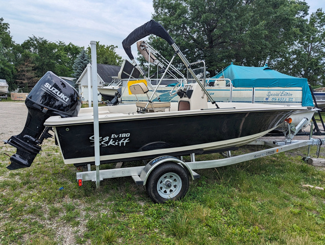 Carolina Skiff used 18' Sea Skiff boat. It was well maintained and a new entry to our rental fleet last year. We are now looking to sell it at reduced cost and put a new one in the fleet! A skiff with a deep V design, will be perfect for the Lagoons and Rivers of Ohio with the ability to still run well out on the Great Lakes. With unbelievable introductory package price, boat, motor and trailer! This one is equipped with 115HP Suzuki and hyd. tilt steering and beautiful black hull side color. Of course equipped for fishing and trolling - its a Carolina Skiff! Includes 70 quart cooler and rod holders. Contact anytime to discuss this or any other Carolina Skiff Models ranging from 16' to 35' Sea Chaser blue water center consoles. Covered with confidence by Carolina Skiff's best in class warranty program - Dare to compare! The value and build quality is unparalleled. Everything a Boston Whaler can do for a fraction of the price. Built here in the United States.