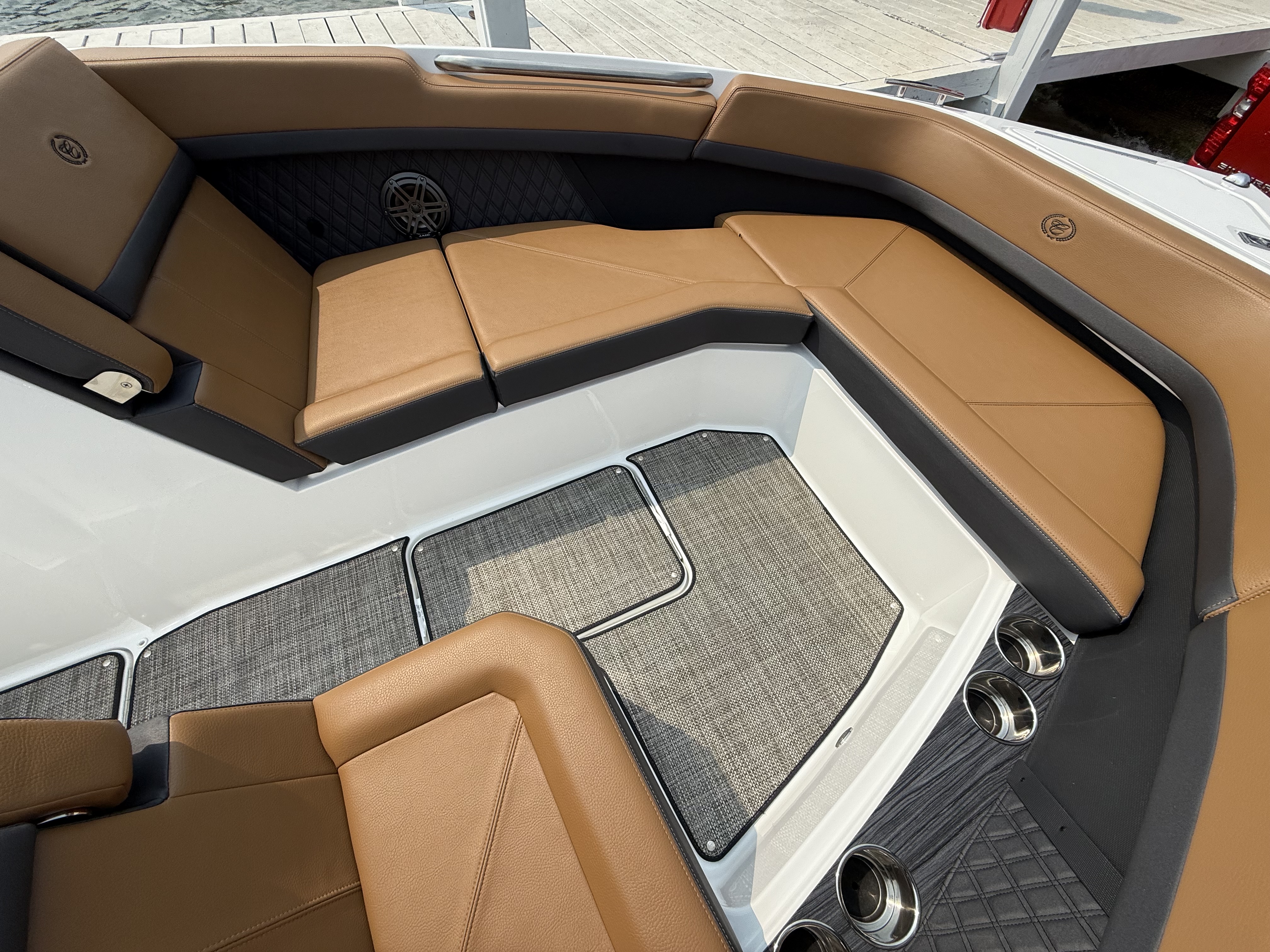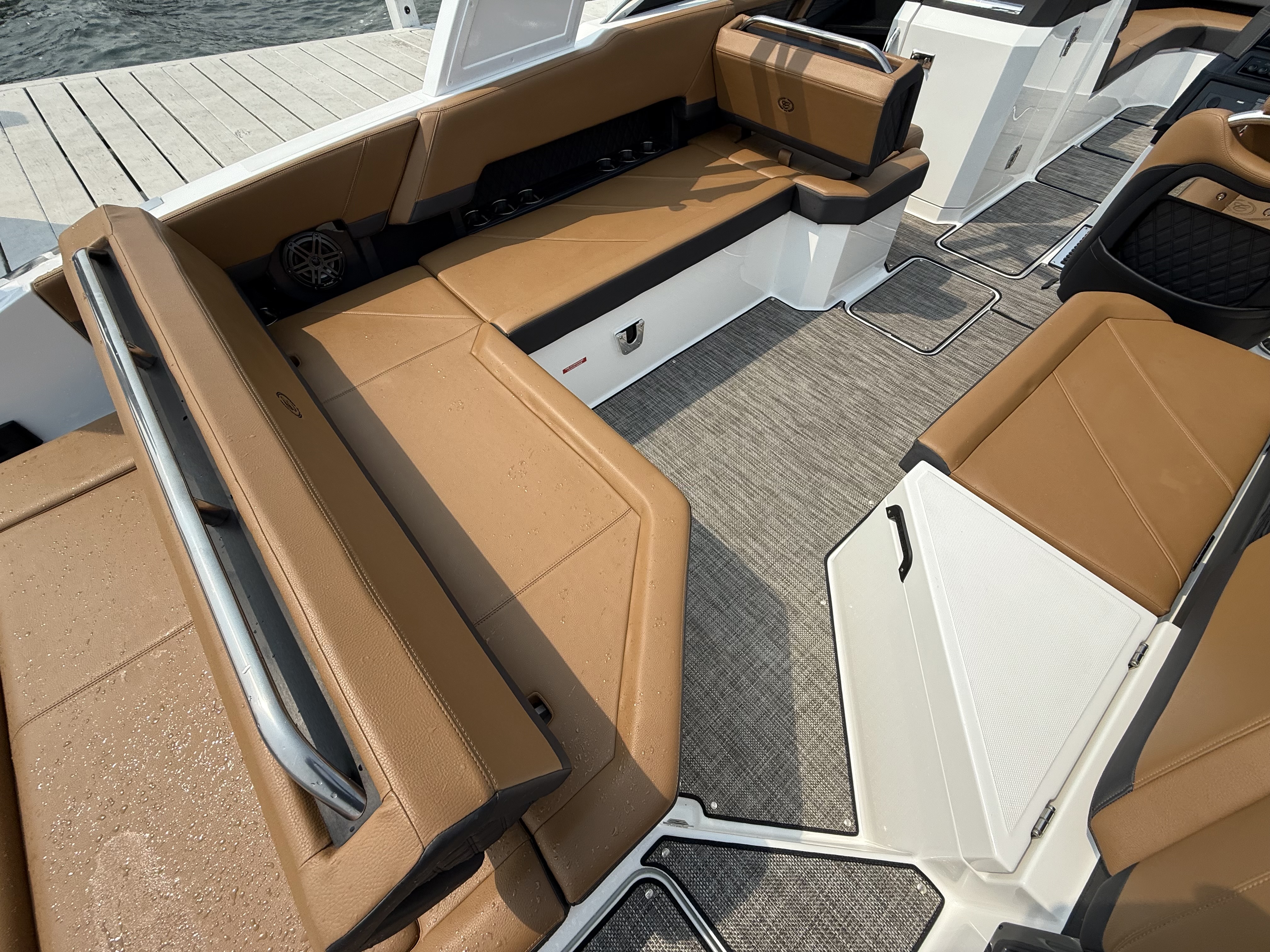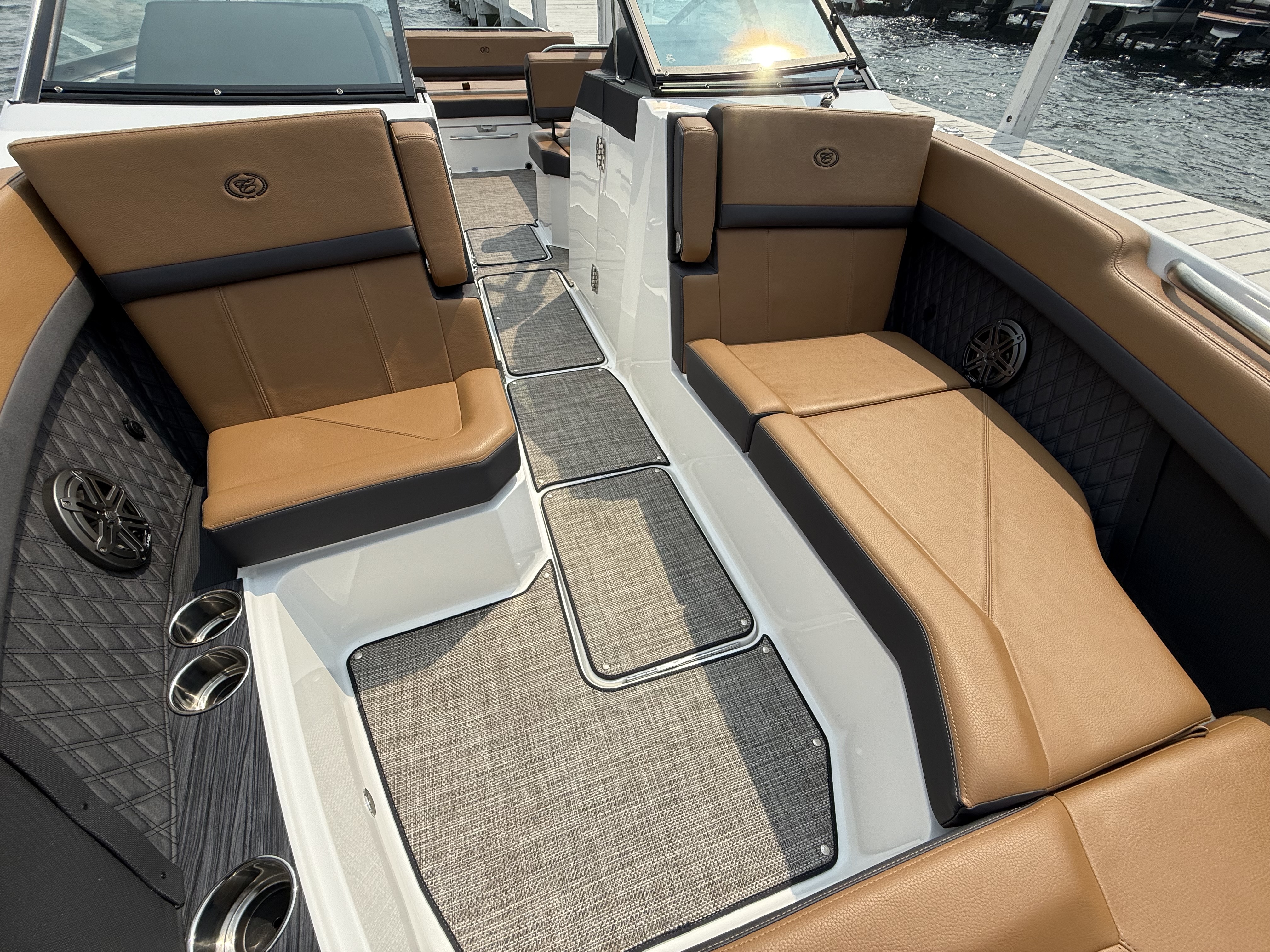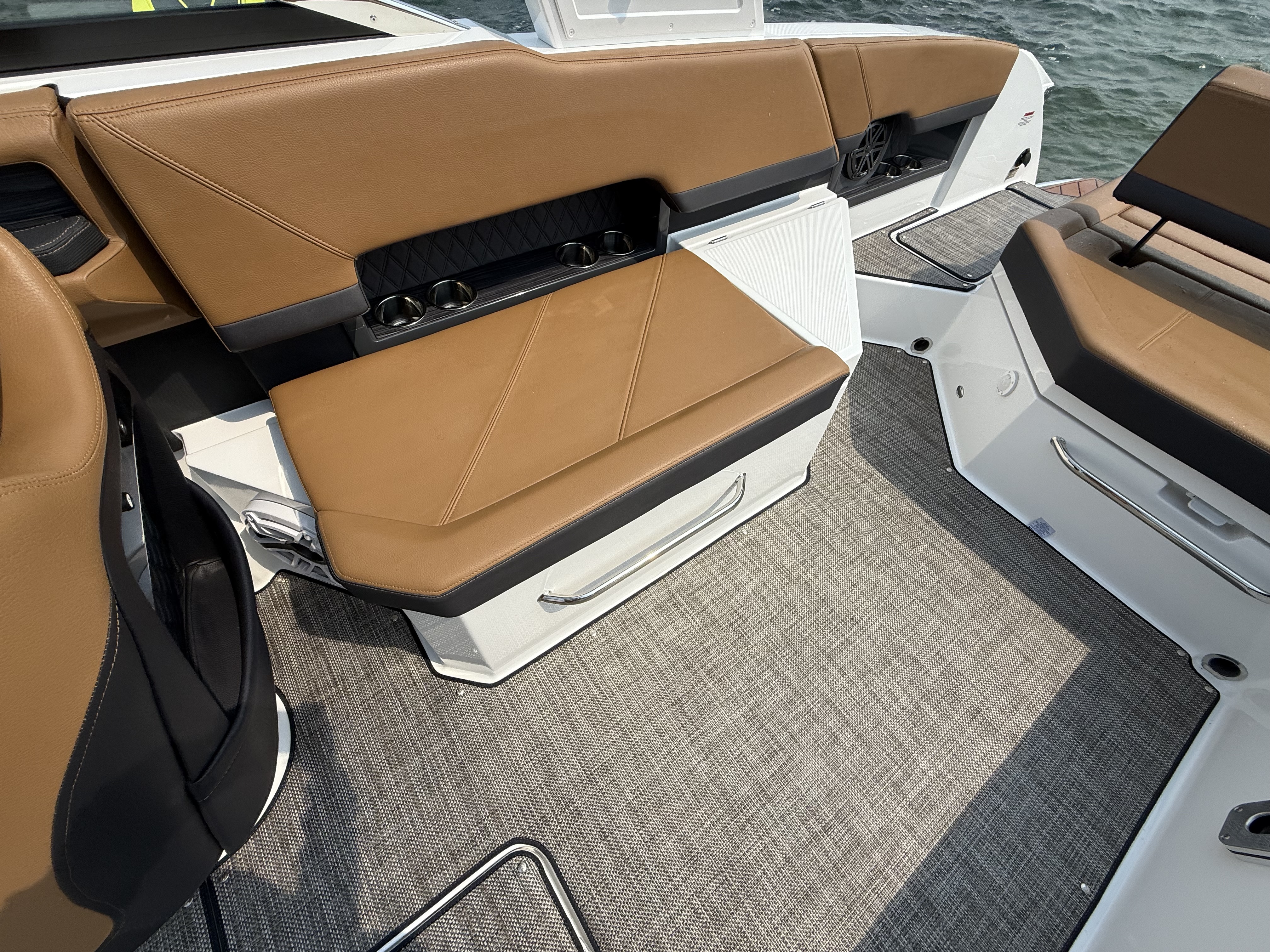 The folding arch in pristine white, coupled with the ebony bimini, sets the stage for your aquatic escapades. Lounge in comfort on the Caramel & Carbon interior seating, surrounded by the sea grass flooring that adds a touch of opulence to every step. The soft-trac mats on the swim platform provide a secure footing, whether you're enjoying water activities or simply soaking up the sun.