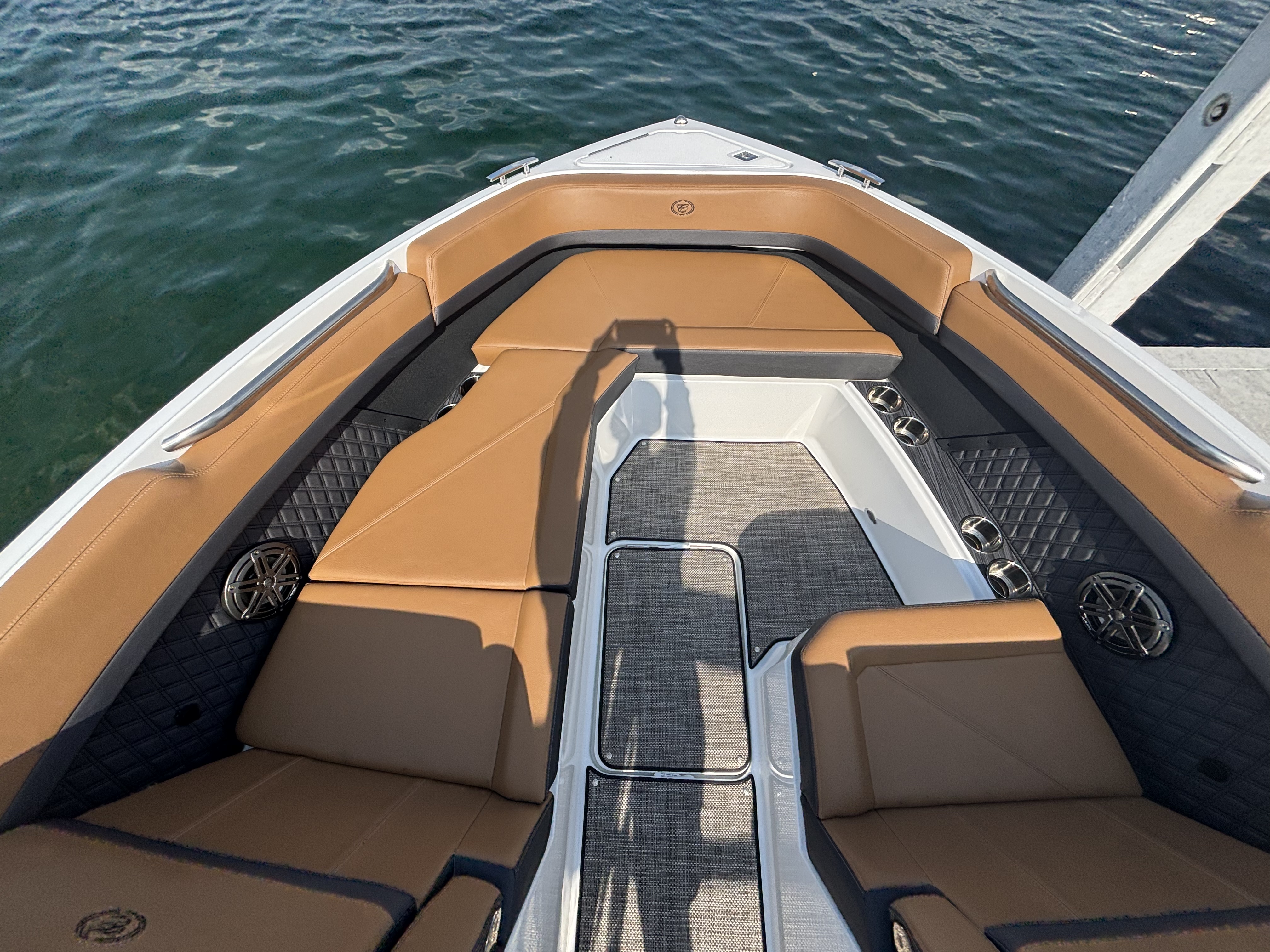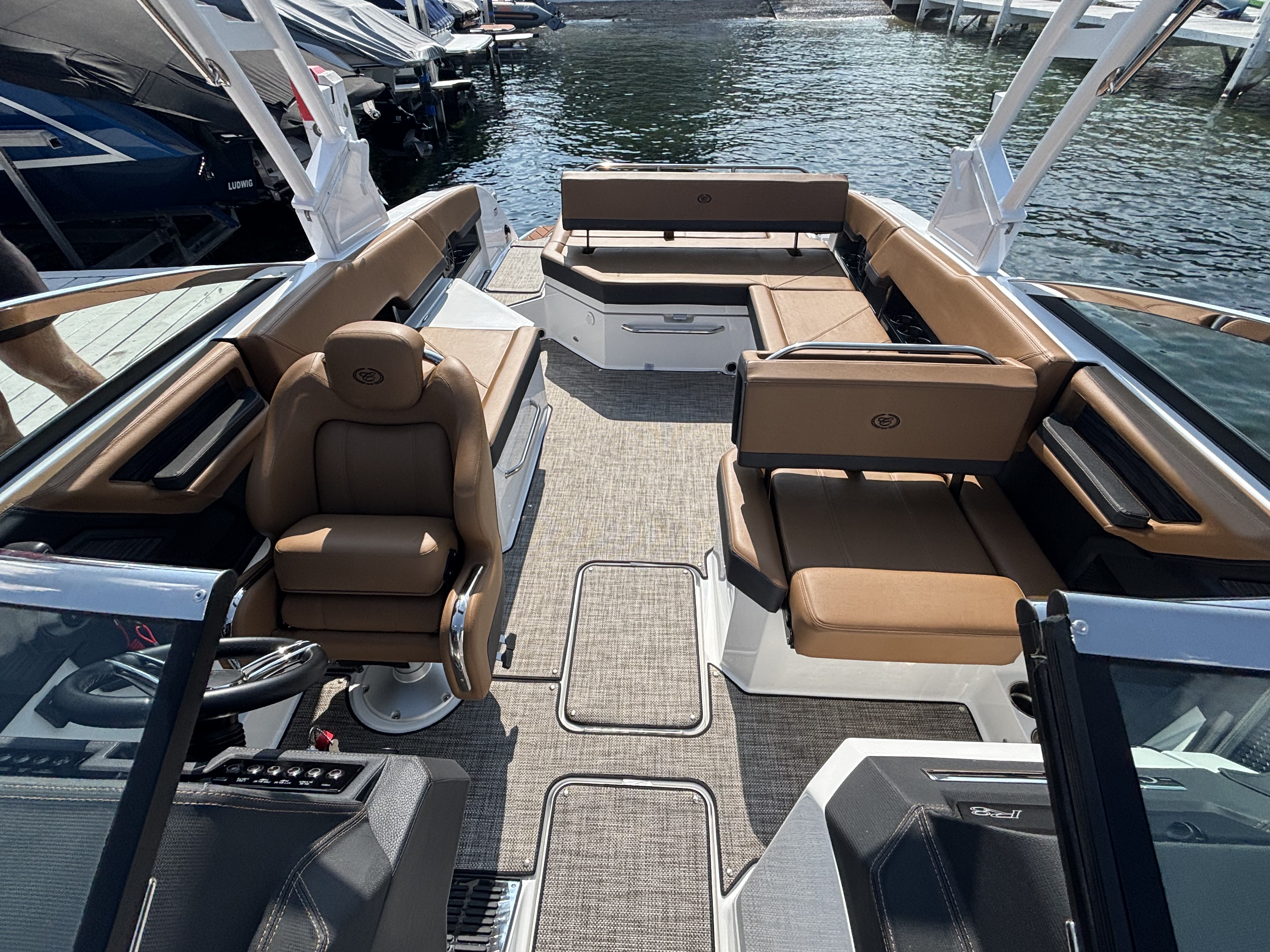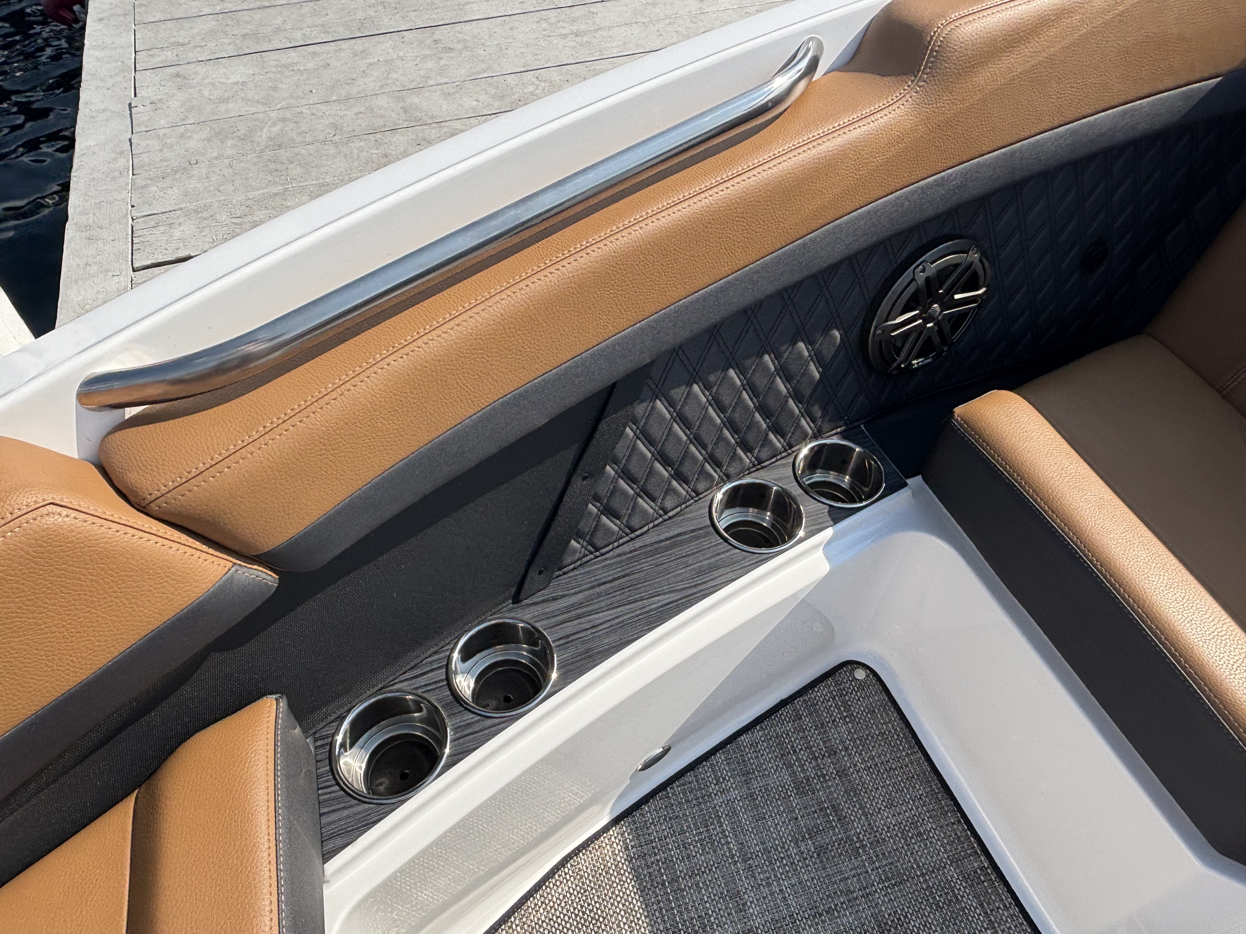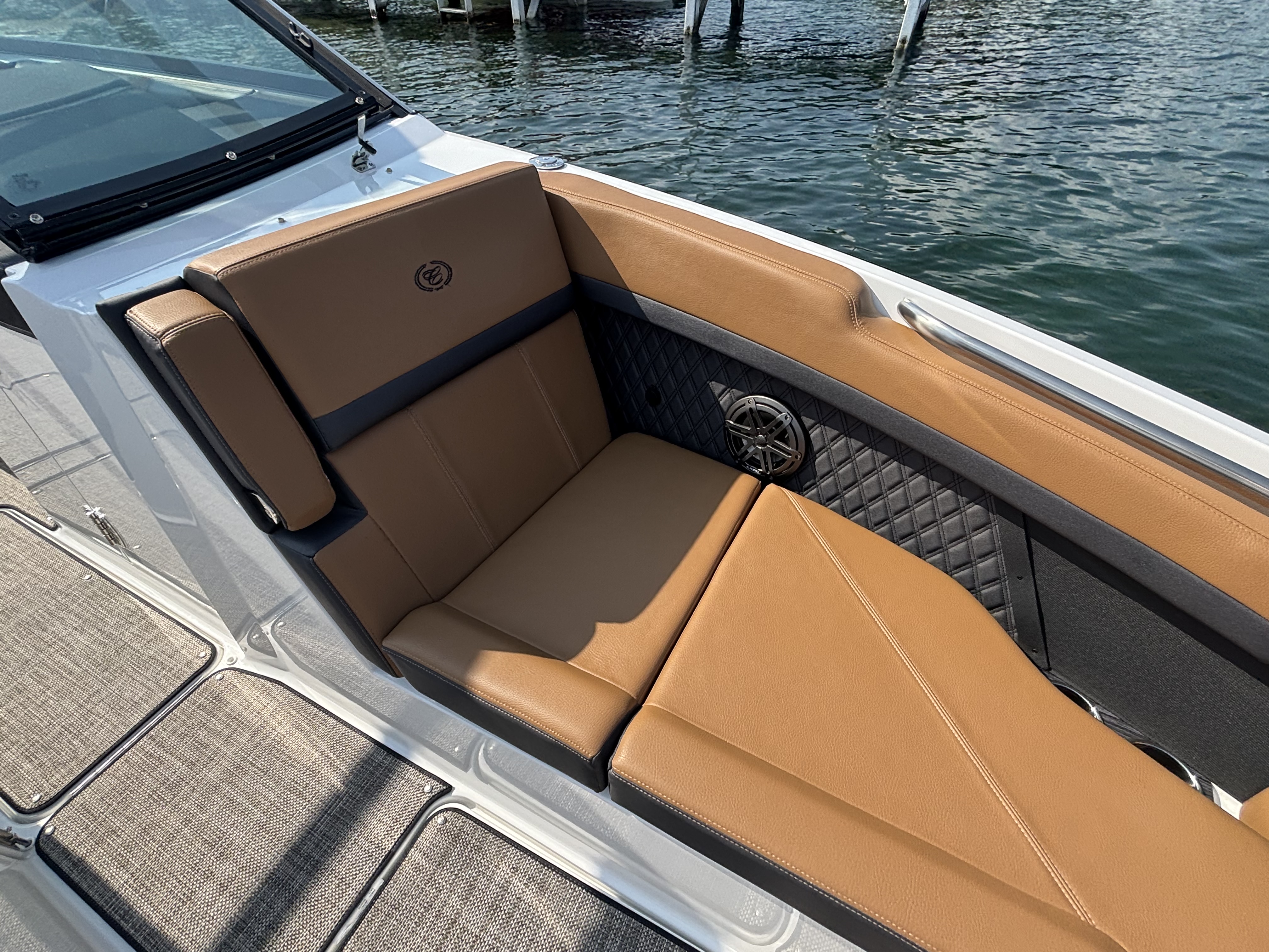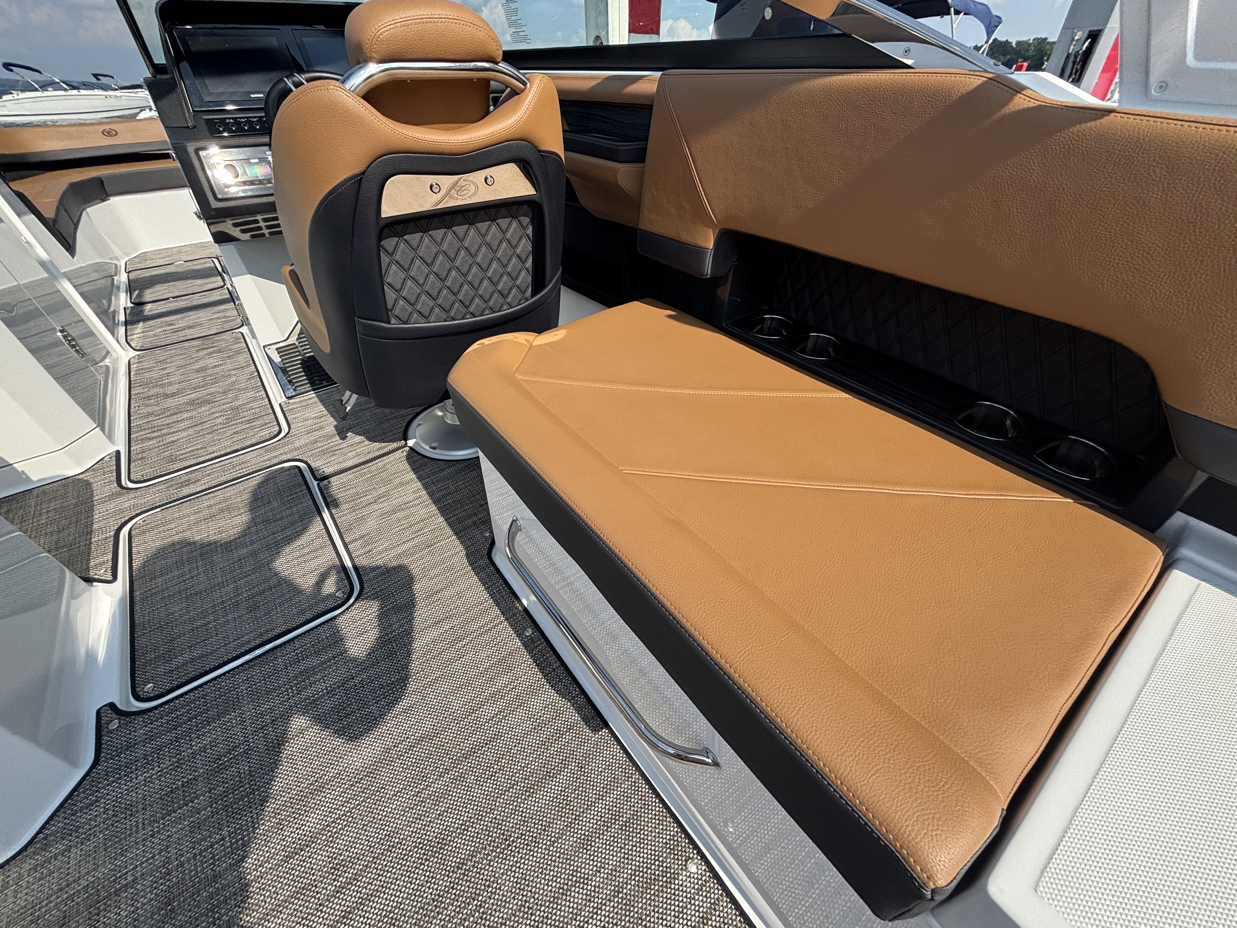 The folding arch in pristine white, coupled with the ebony bimini, sets the stage for your aquatic escapades. Lounge in comfort on the Caramel & Carbon interior seating, surrounded by the sea grass flooring that adds a touch of opulence to every step. The soft-trac mats on the swim platform provide a secure footing, whether you're enjoying water activities or simply soaking up the sun.