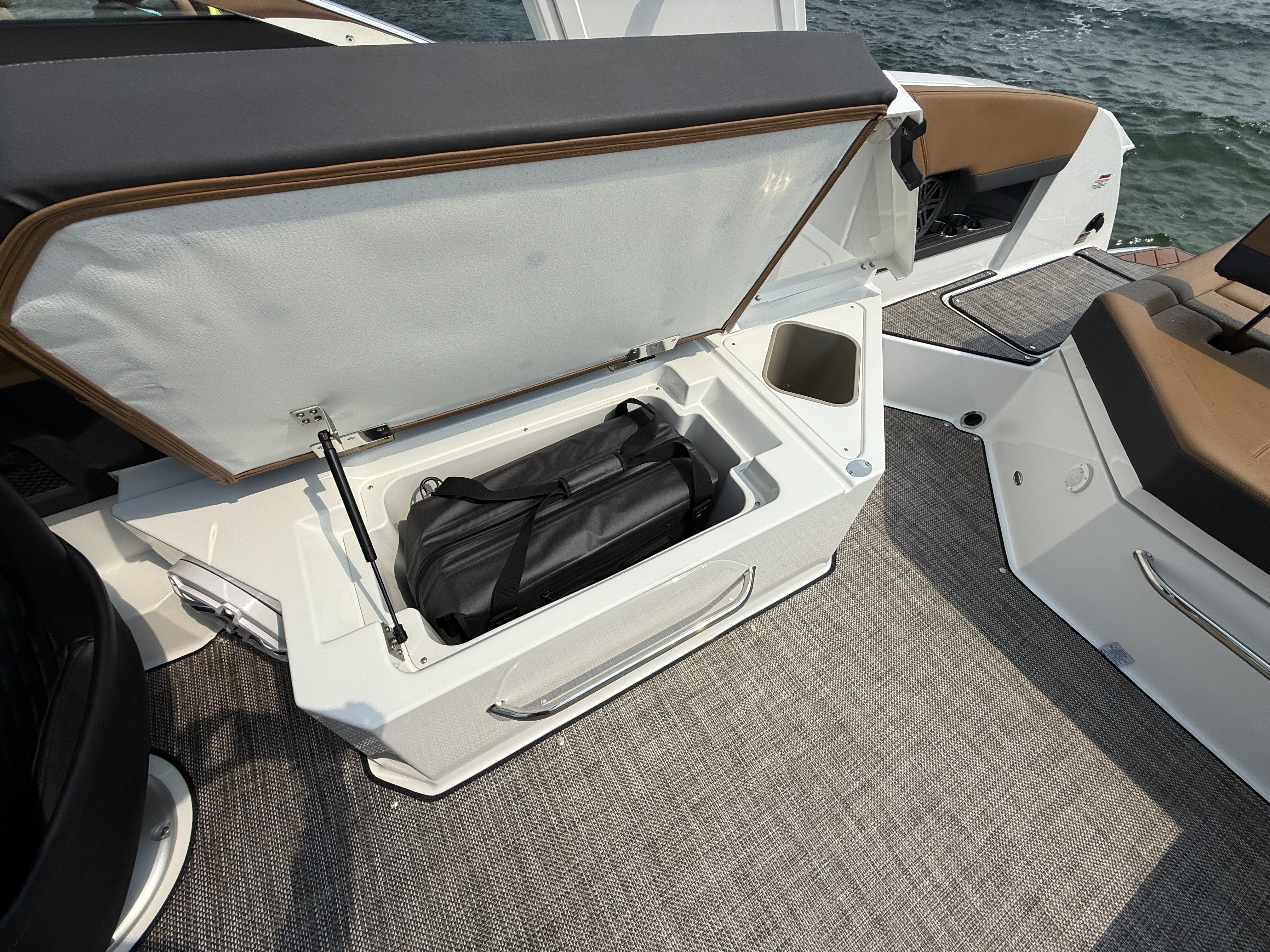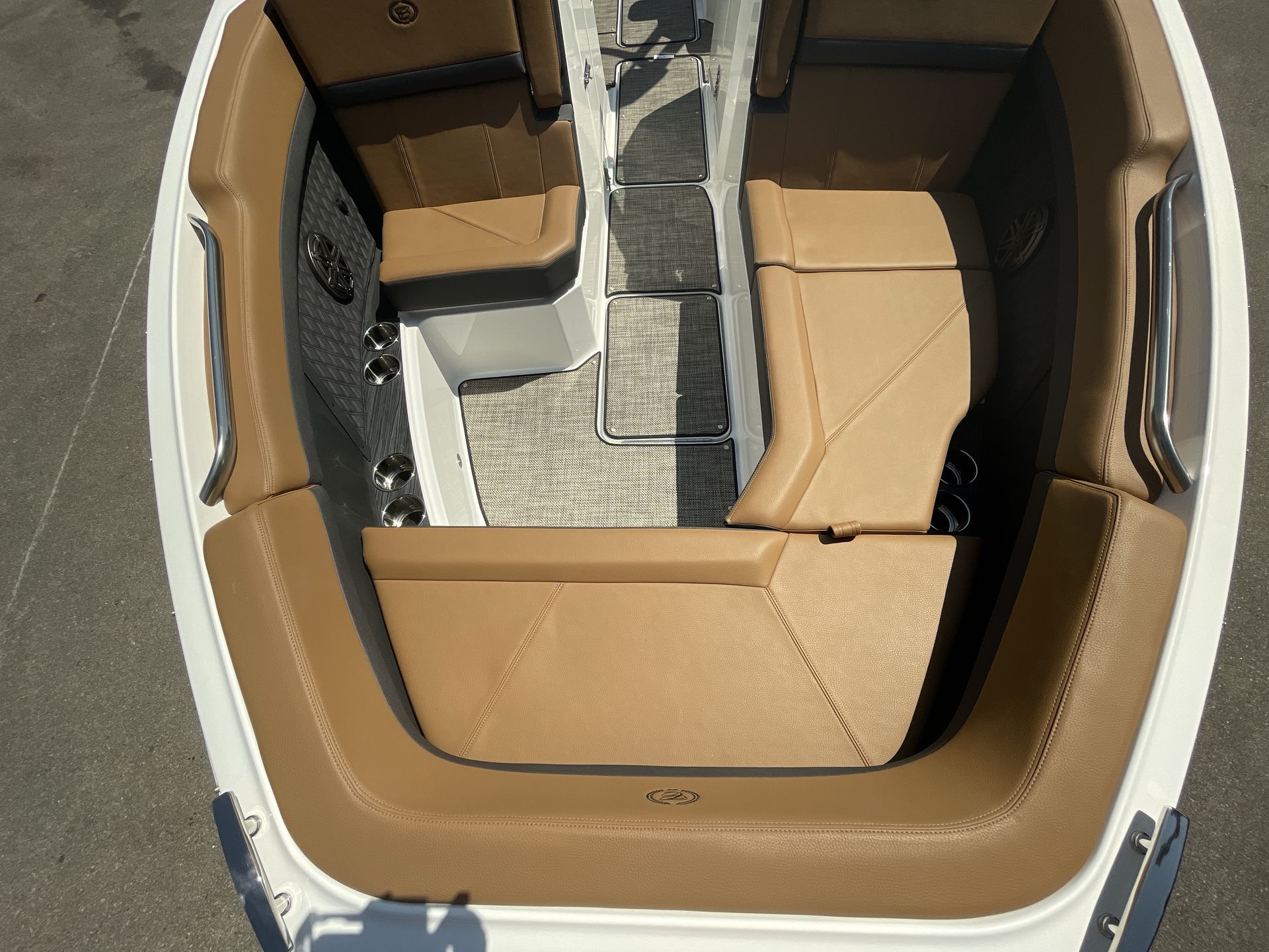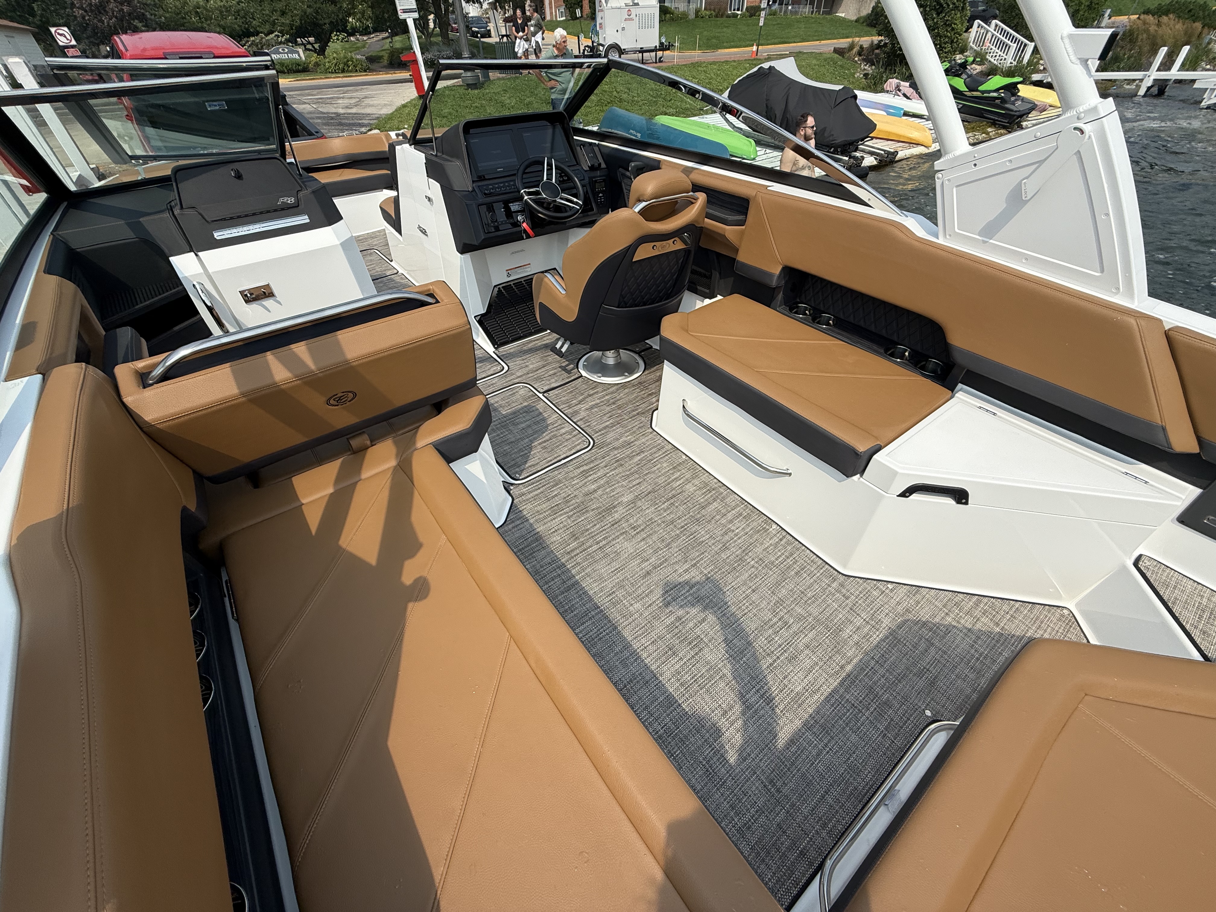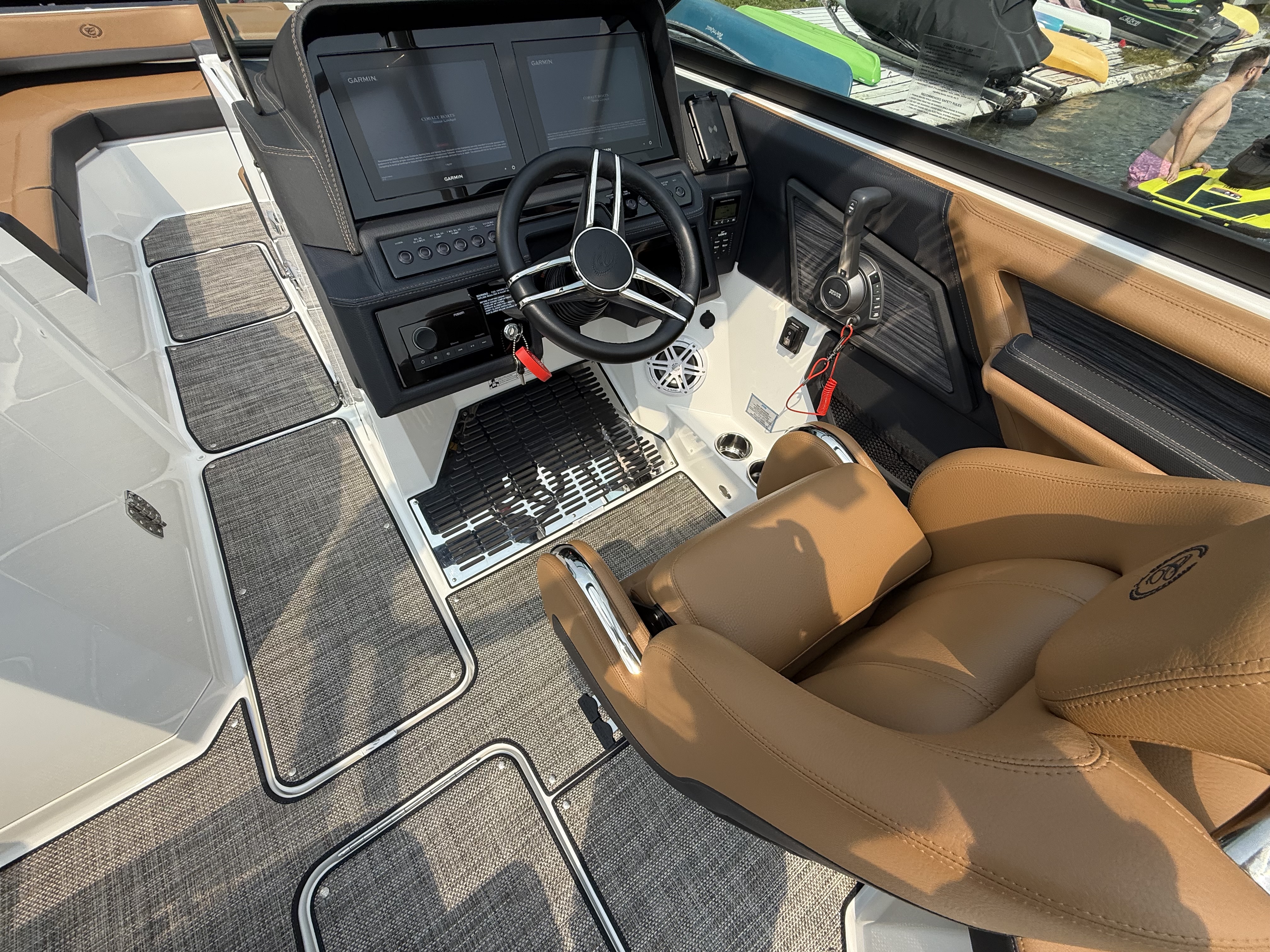 The folding arch in pristine white, coupled with the ebony bimini, sets the stage for your aquatic escapades. Lounge in comfort on the Caramel & Carbon interior seating, surrounded by the sea grass flooring that adds a touch of opulence to every step. The soft-trac mats on the swim platform provide a secure footing, whether you're enjoying water activities or simply soaking up the sun.