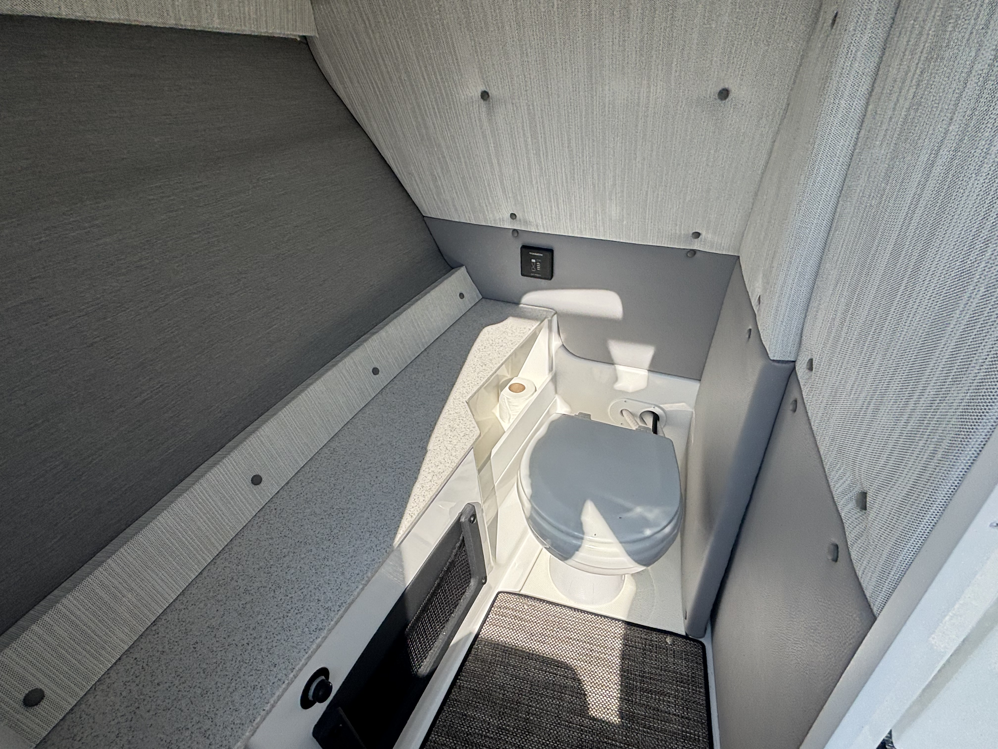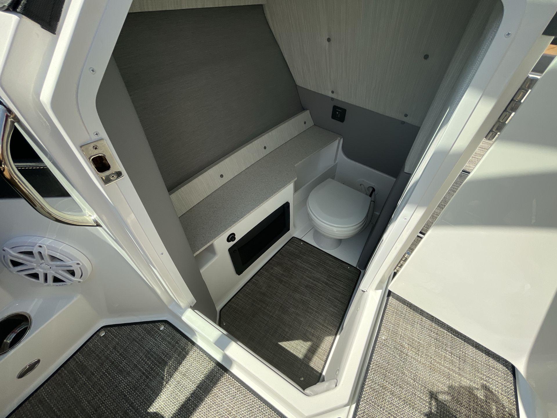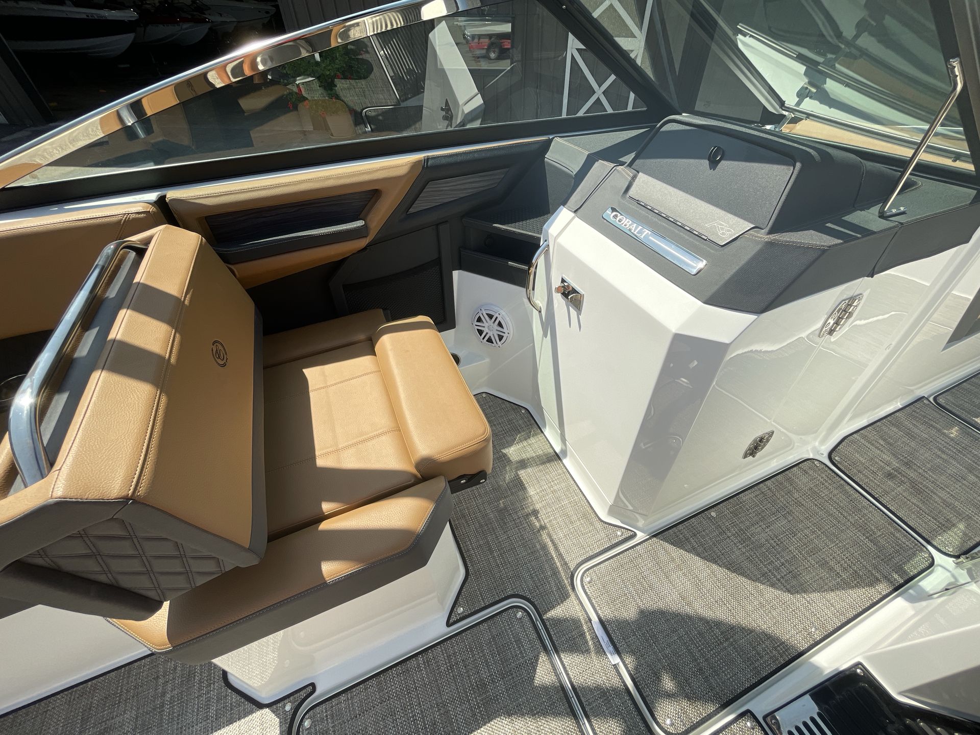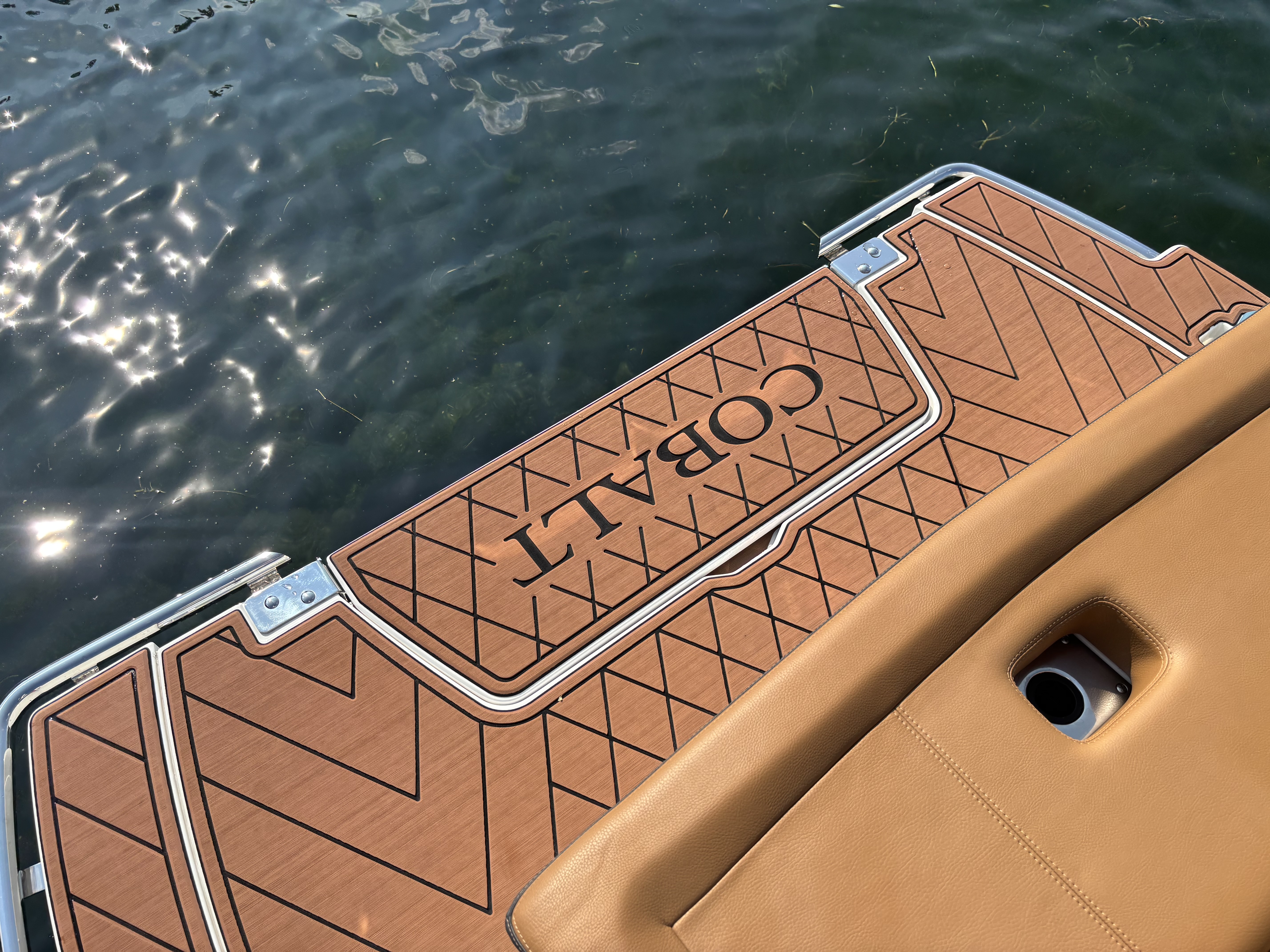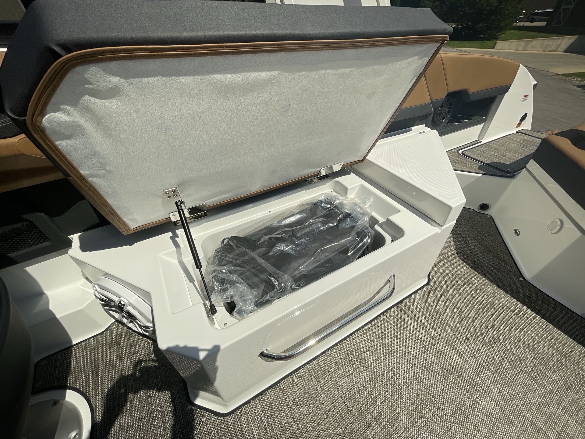 The folding arch in pristine white, coupled with the ebony bimini, sets the stage for your aquatic escapades. Lounge in comfort on the Caramel & Carbon interior seating, surrounded by the sea grass flooring that adds a touch of opulence to every step. The soft-trac mats on the swim platform provide a secure footing, whether you're enjoying water activities or simply soaking up the sun.
