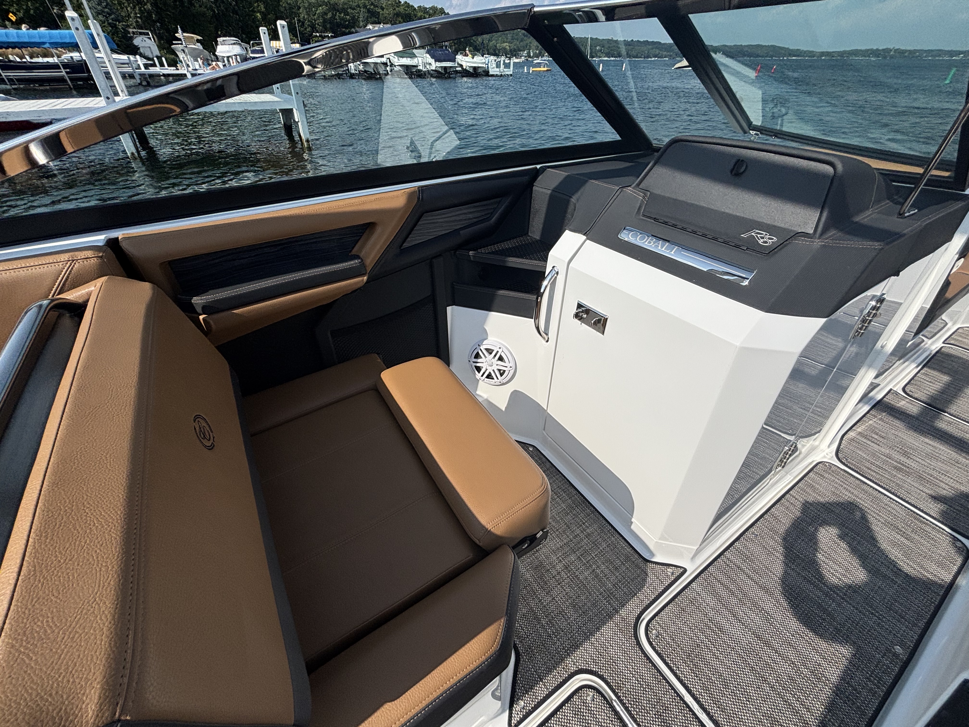 The solid teak dinette table invites you to indulge in culinary delights while surrounded by the breathtaking views of open waters. Stainless steel docking lights not only enhance safety during nighttime maneuvers but also accentuate the Cobalt R8's timeless elegance. The electric porcelain head ensures convenience and comfort for all aboard, while the wireless phone charger/holder keeps you connected without interruption.