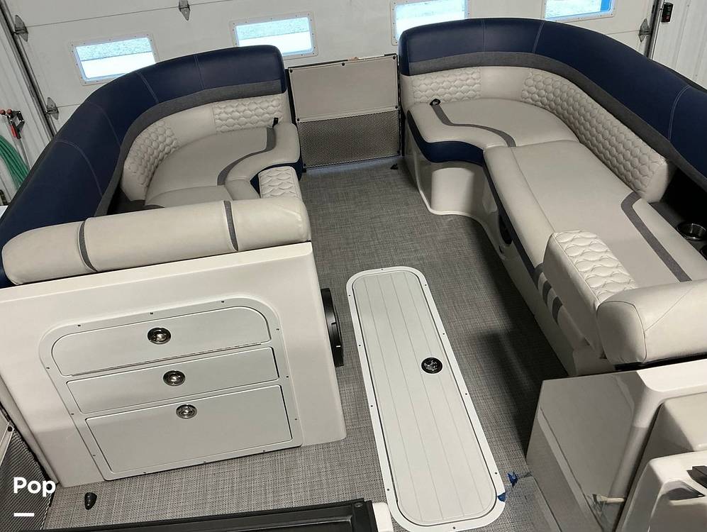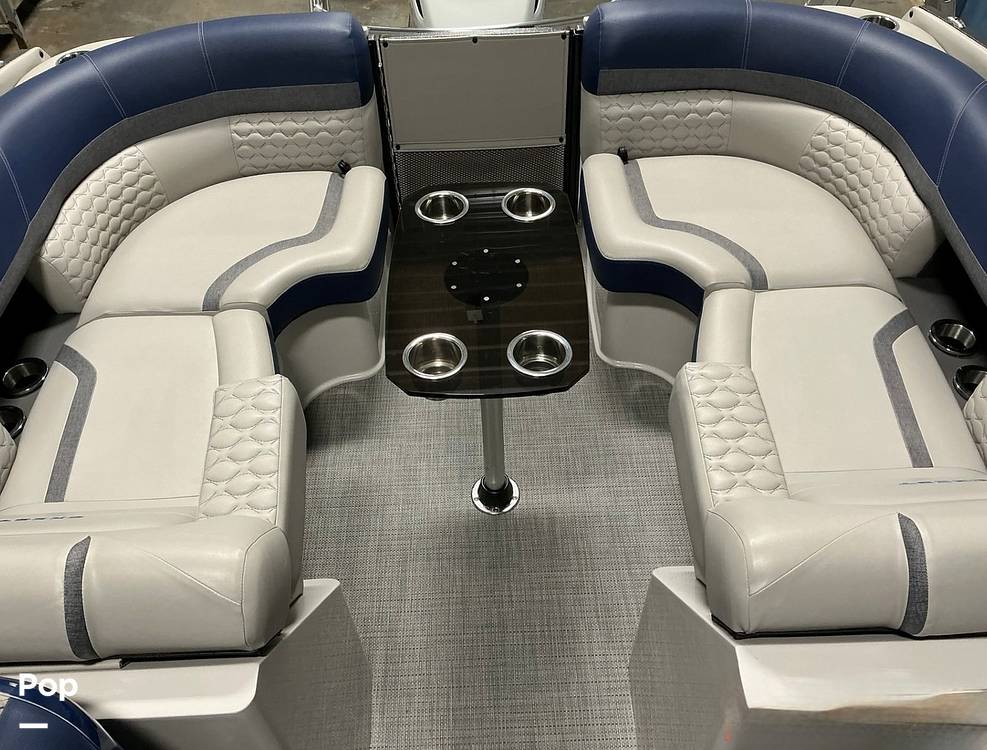 The defining feature of this flagship model is its sleek, integrated full-walkthrough windshield, which offers superior wind protection and a sophisticated automotive aesthetic not found on standard pontoons.