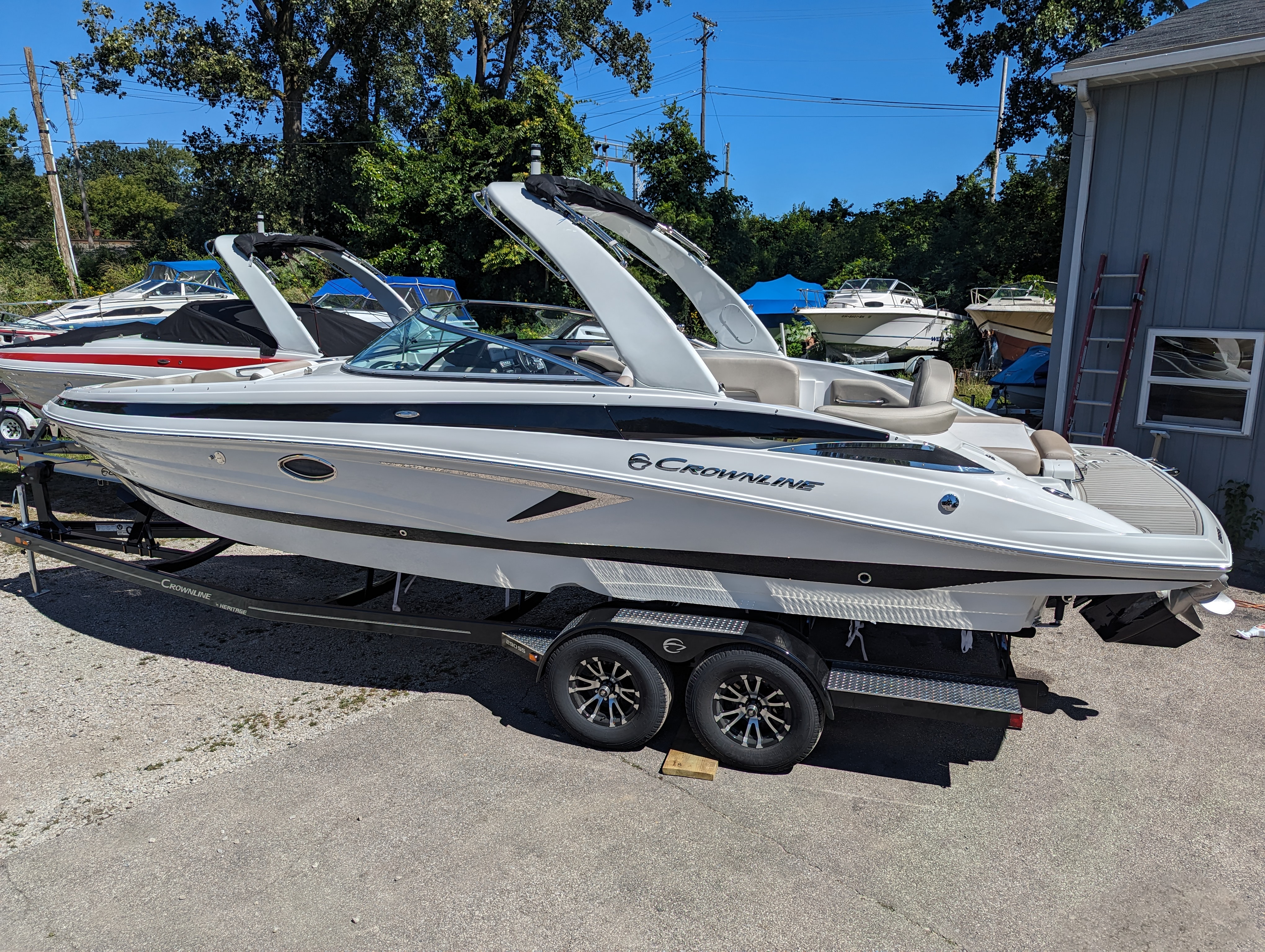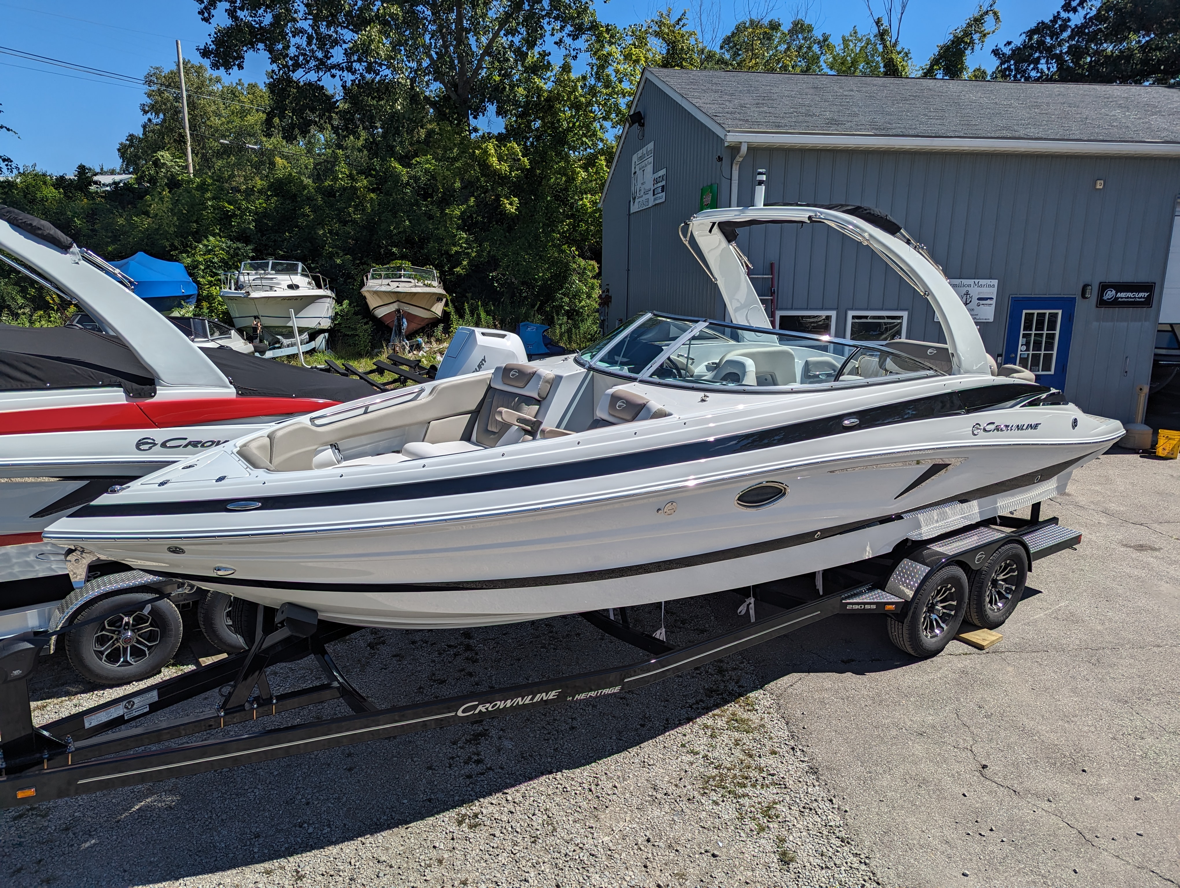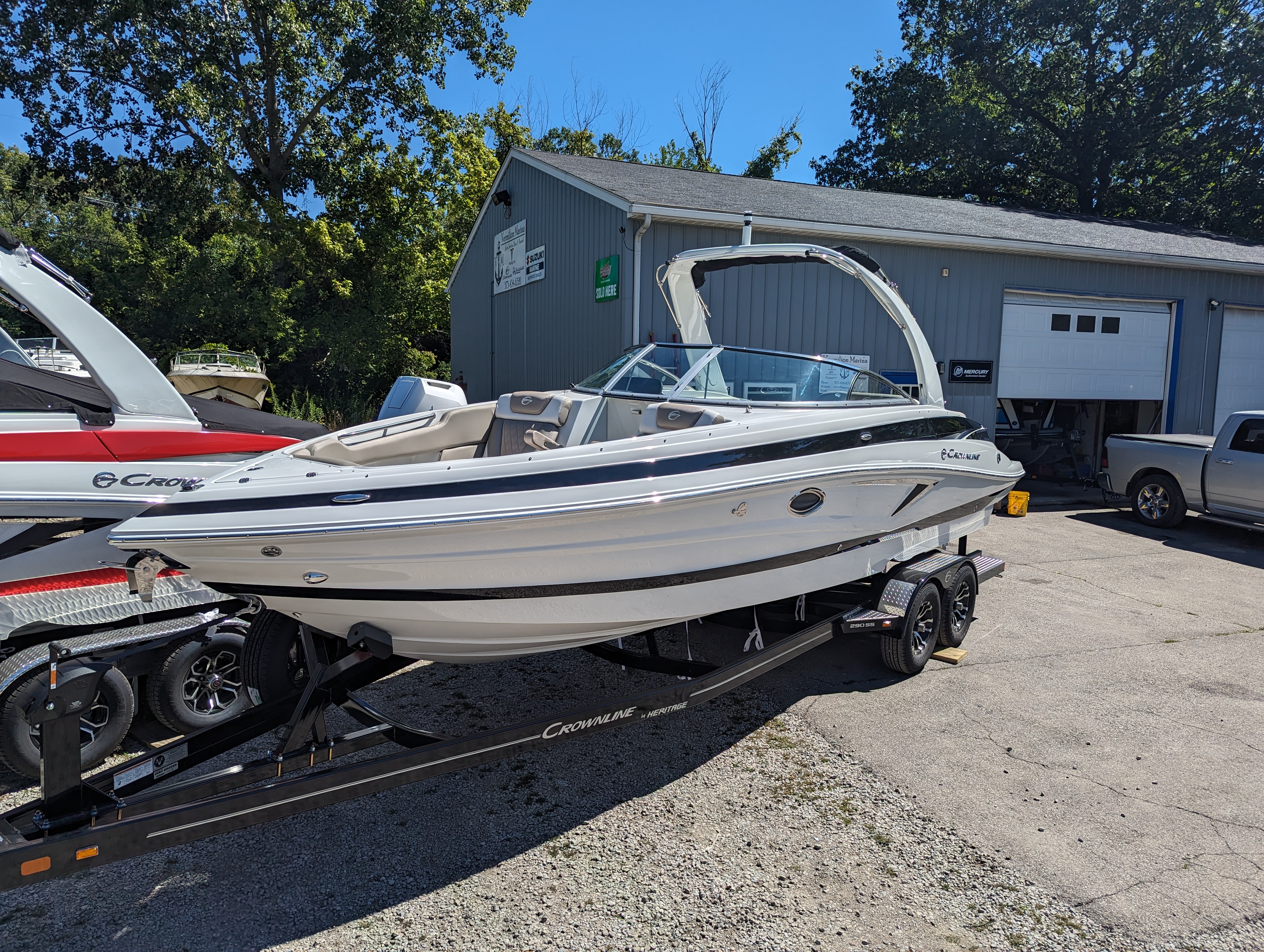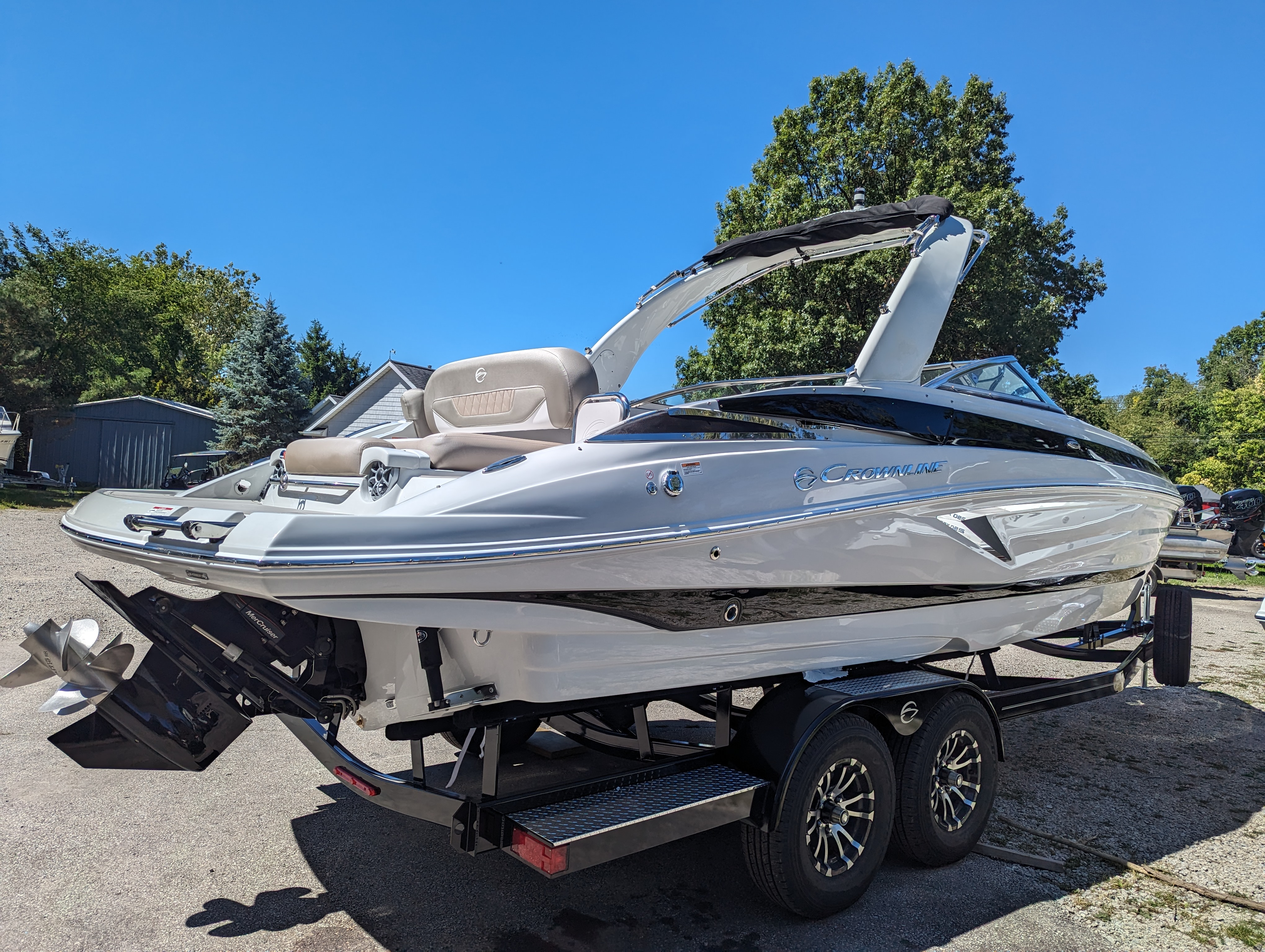 Beautiful boat with standard Crownline options. Also added to this boat: Big Block 8.2L Mercruiser, Black double stiched shroud w SS switches and billet, black bow & cockpit cover, deluxe color matched Steel Trailer w/LED Lighting, Brakes, Deluxe Tire & Rims with Spare, Diamond Plate Fenders & V-block for Windlass.