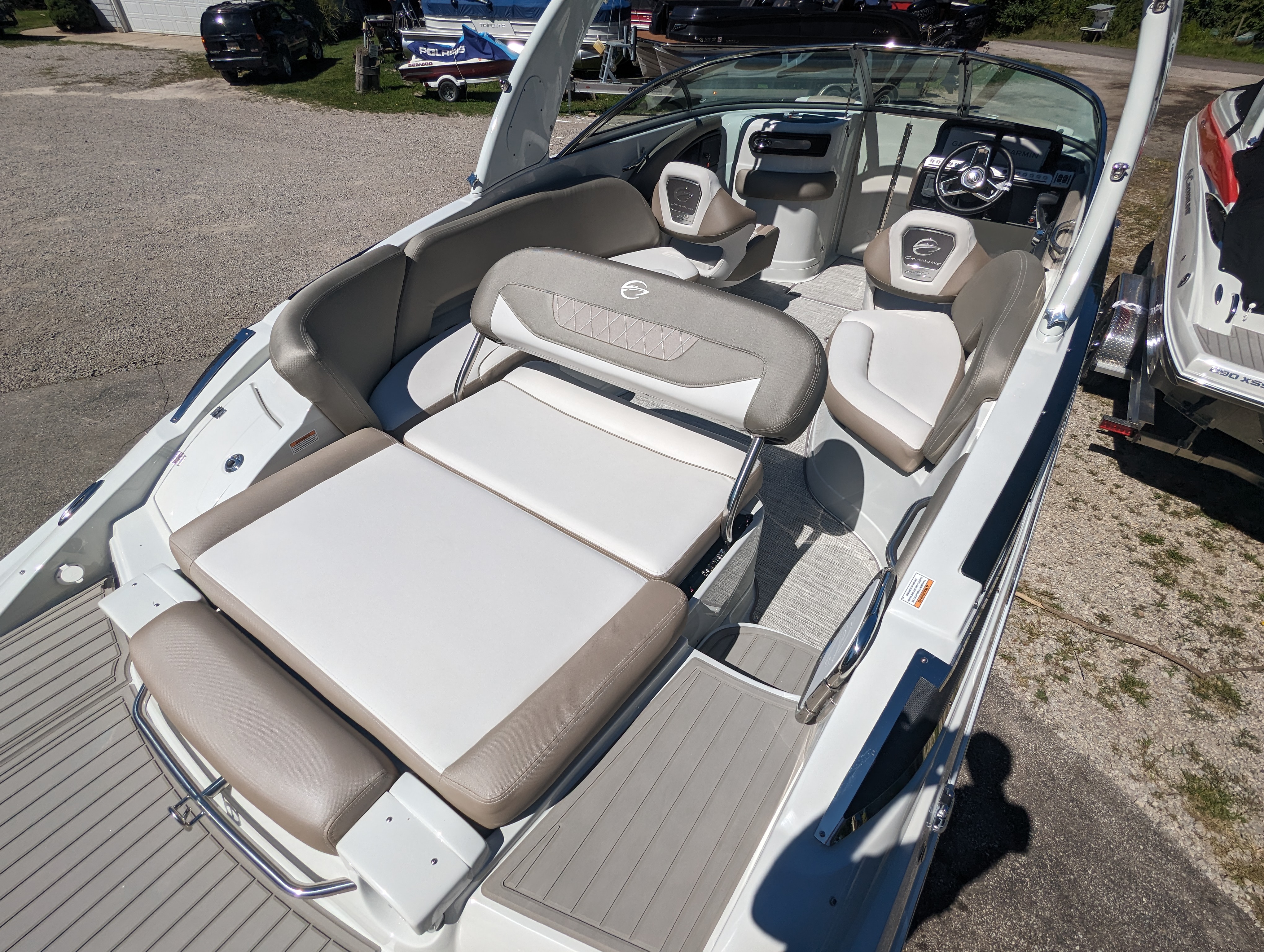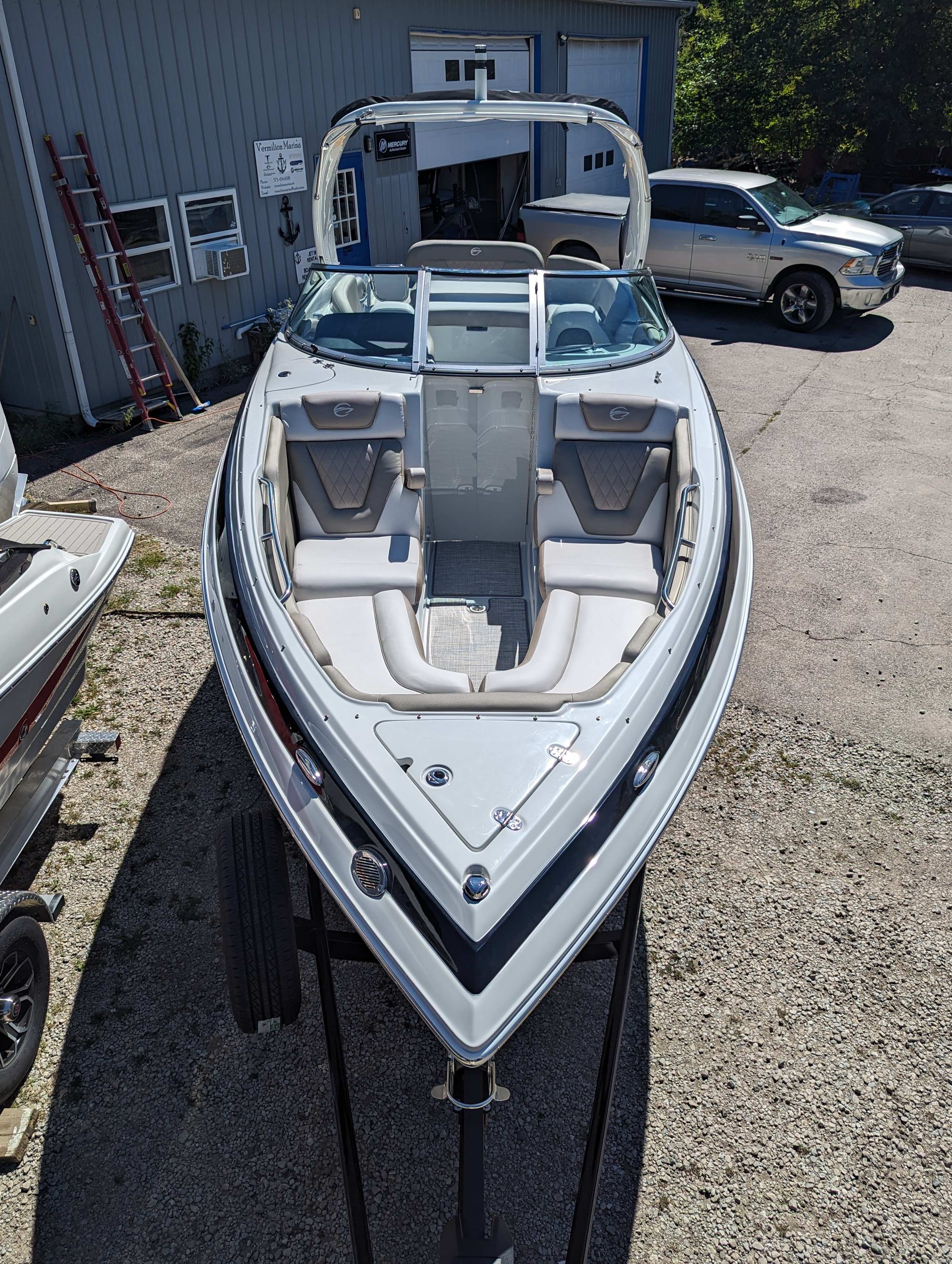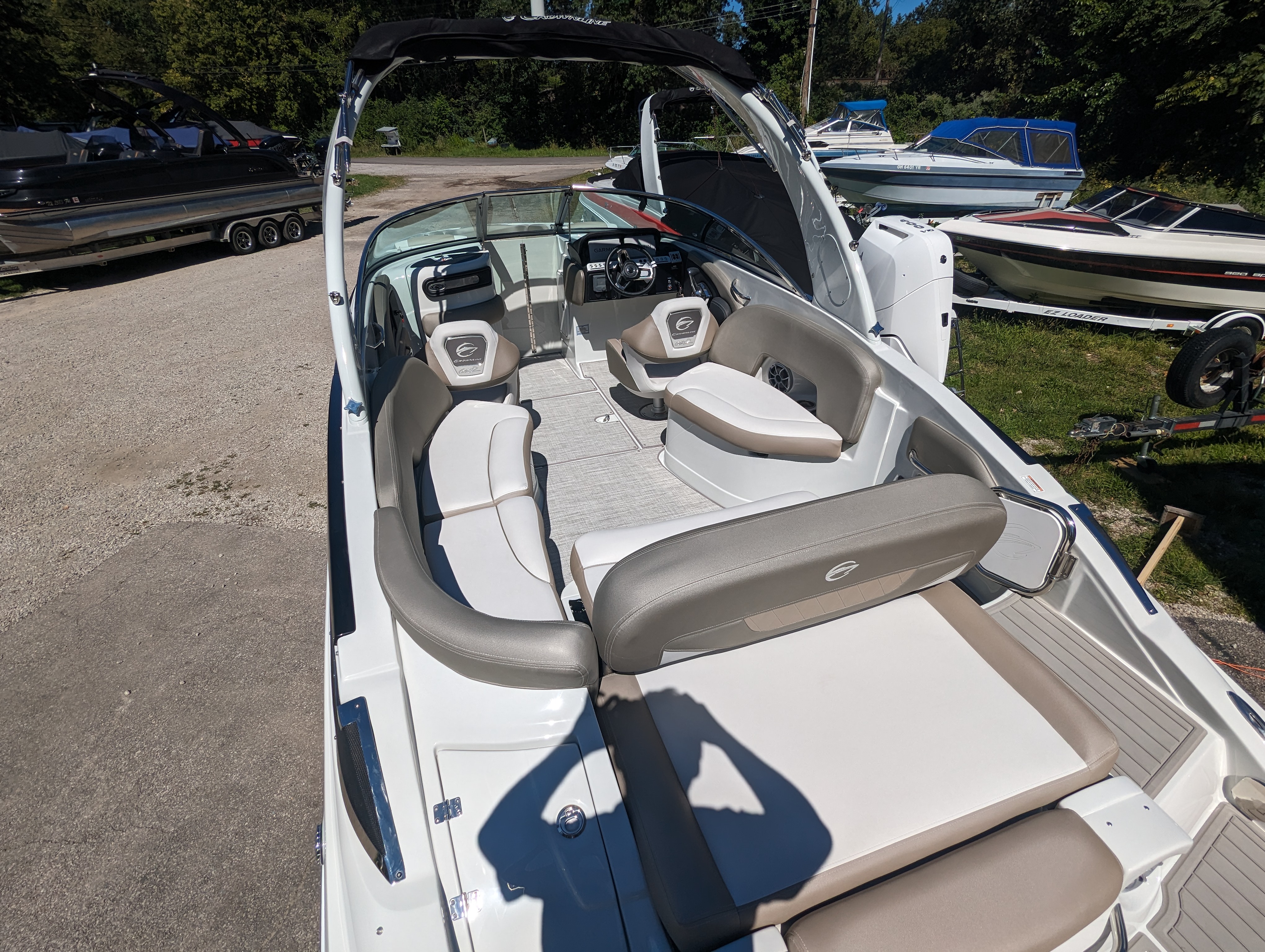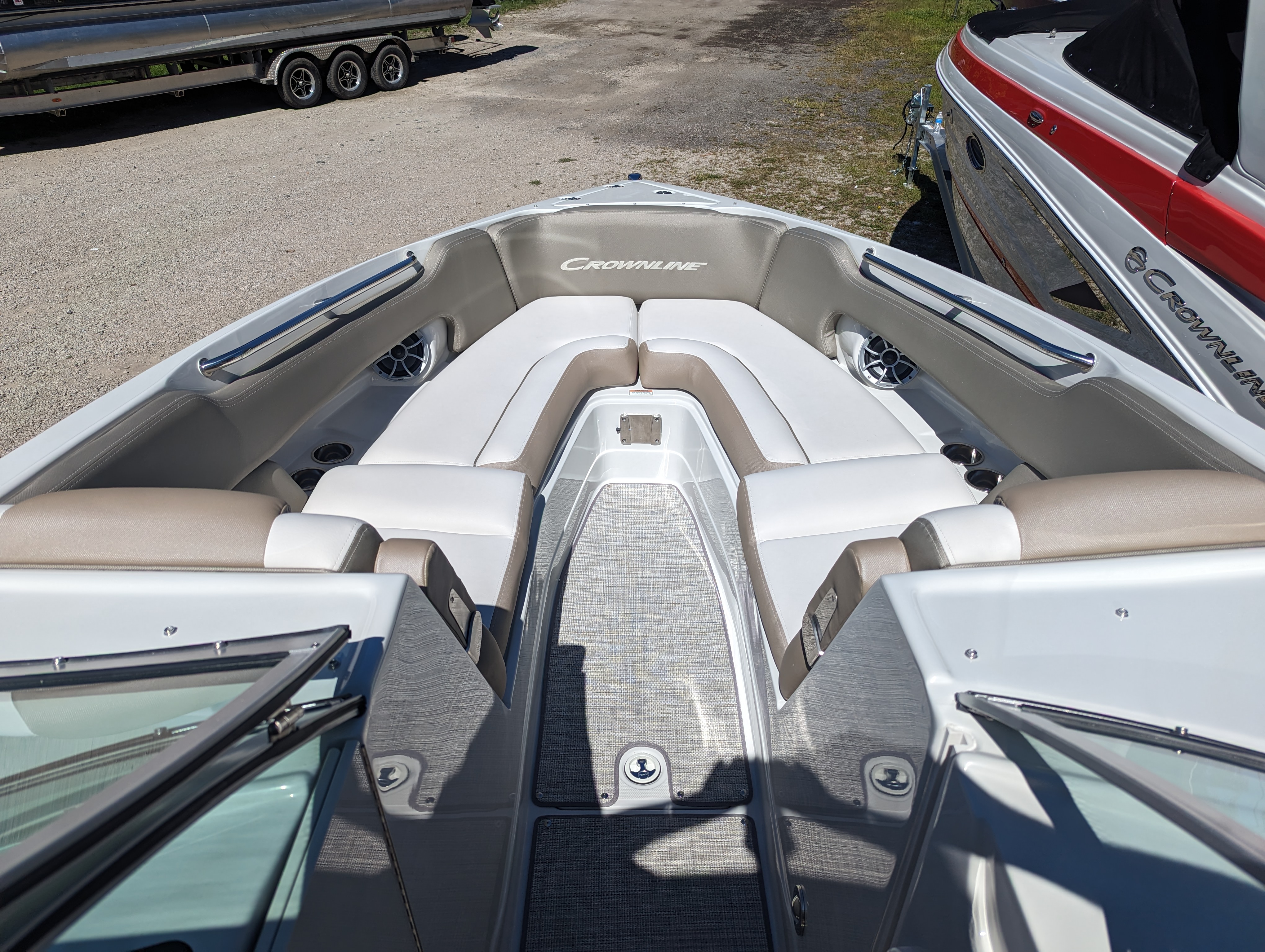 Beautiful boat with standard Crownline options. Also added to this boat: Big Block 8.2L Mercruiser, Black double stiched shroud w SS switches and billet, black bow & cockpit cover, deluxe color matched Steel Trailer w/LED Lighting, Brakes, Deluxe Tire & Rims with Spare, Diamond Plate Fenders & V-block for Windlass.
