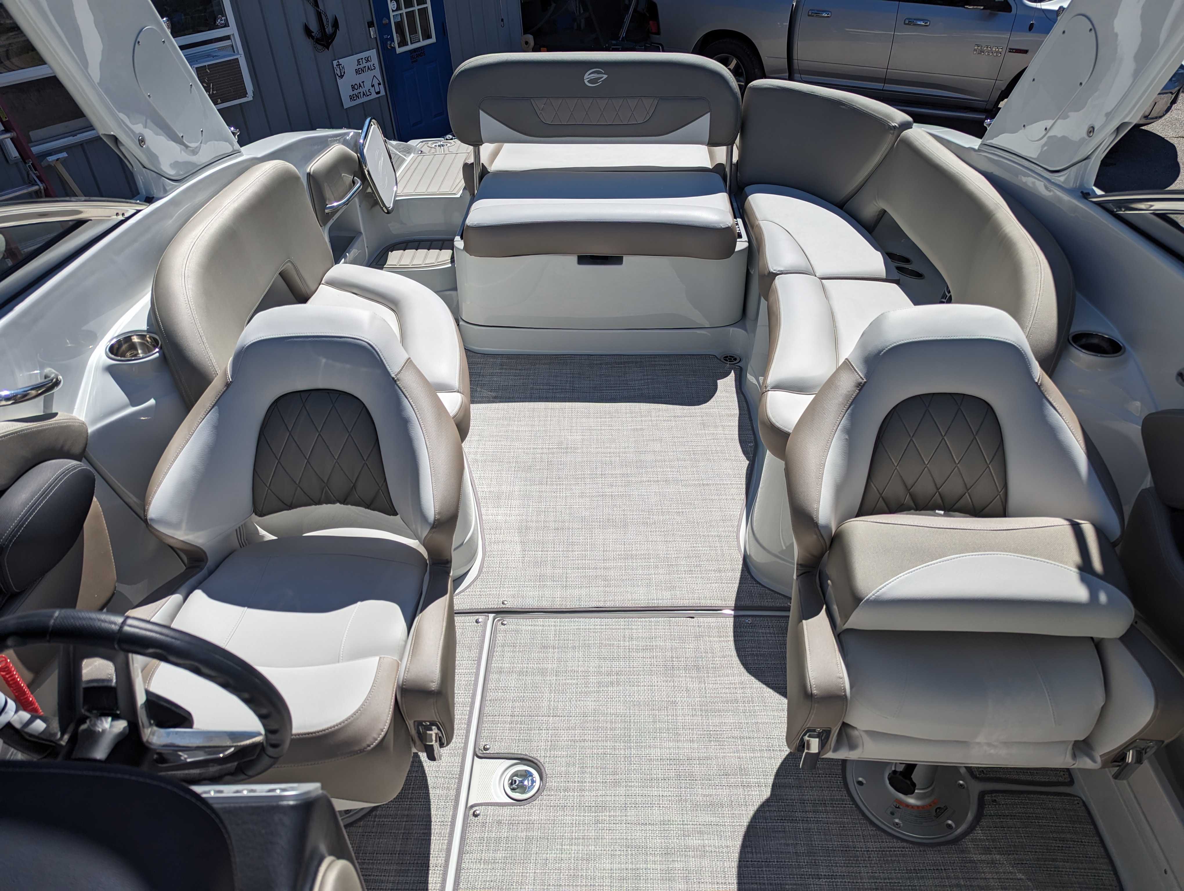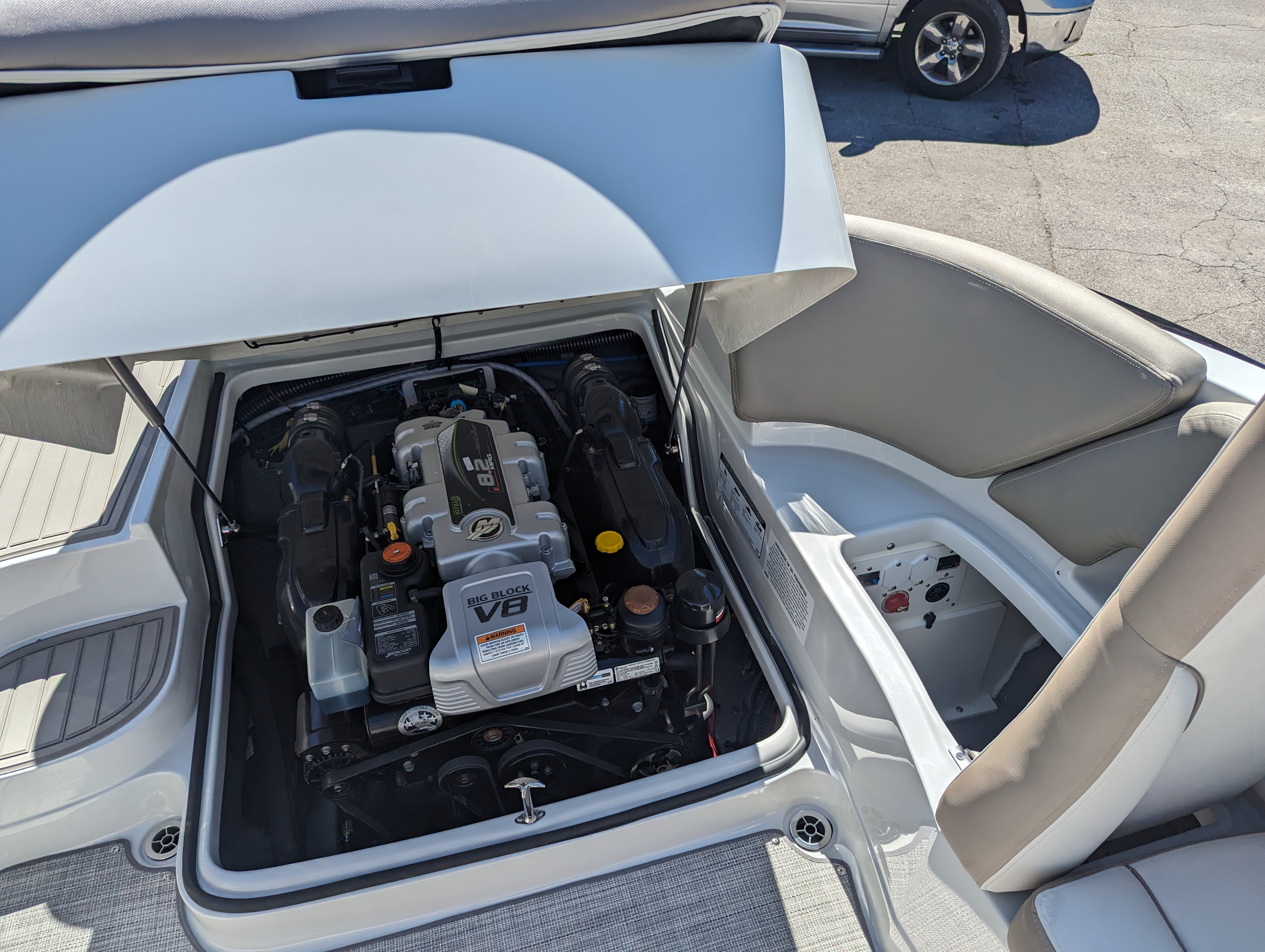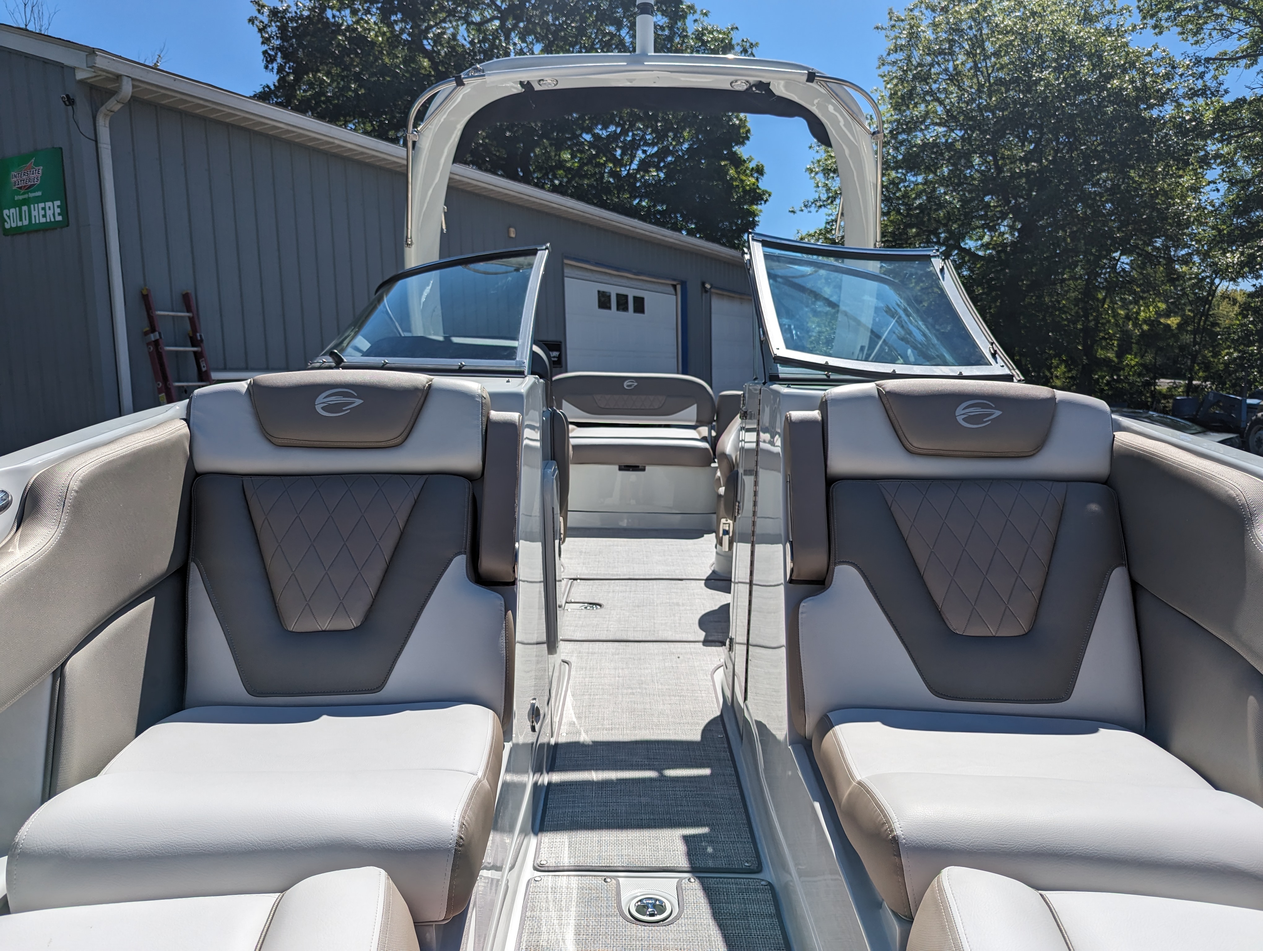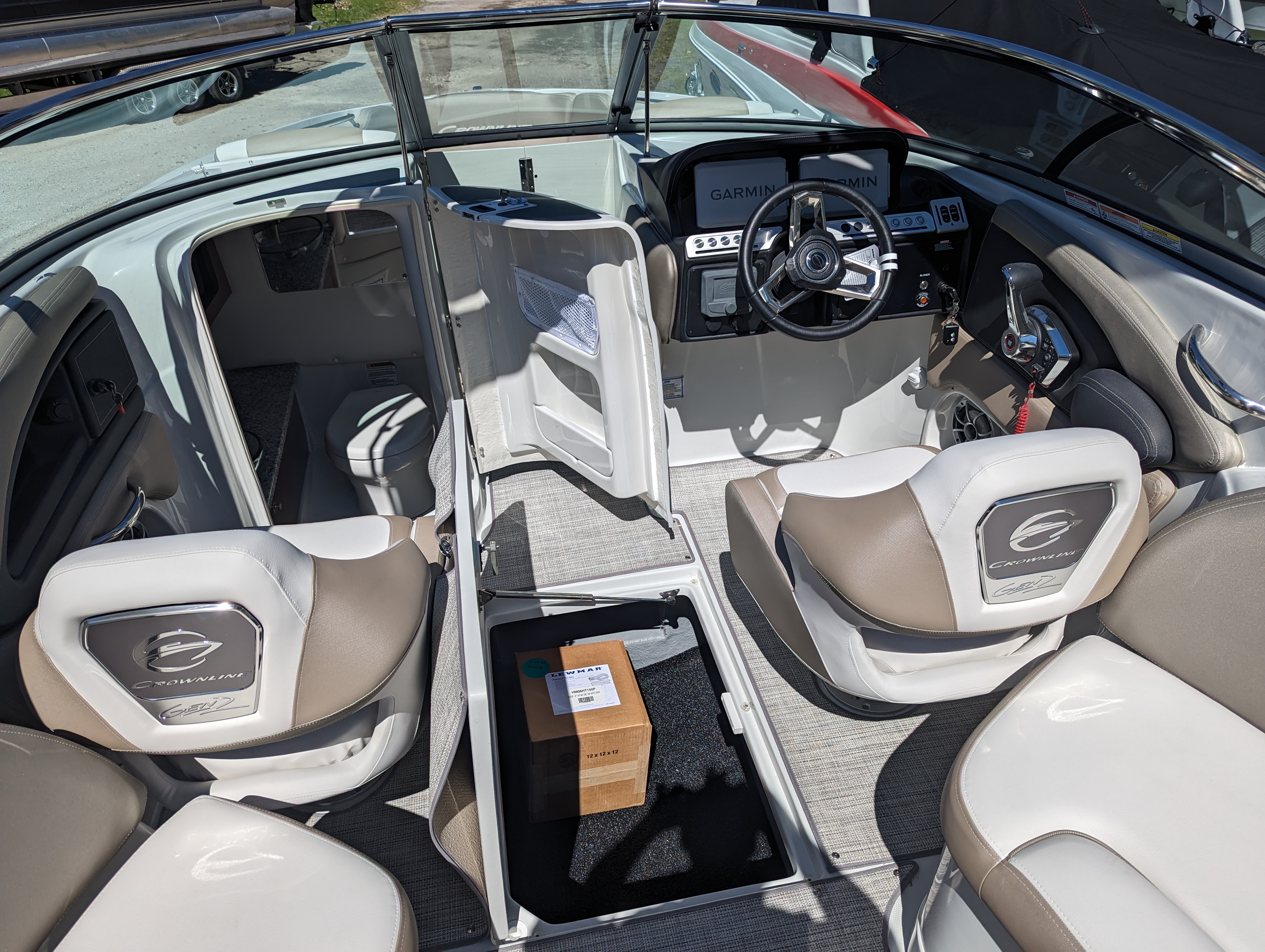 Beautiful boat with standard Crownline options. Also added to this boat: Big Block 8.2L Mercruiser, Black double stiched shroud w SS switches and billet, black bow & cockpit cover, deluxe color matched Steel Trailer w/LED Lighting, Brakes, Deluxe Tire & Rims with Spare, Diamond Plate Fenders & V-block for Windlass.