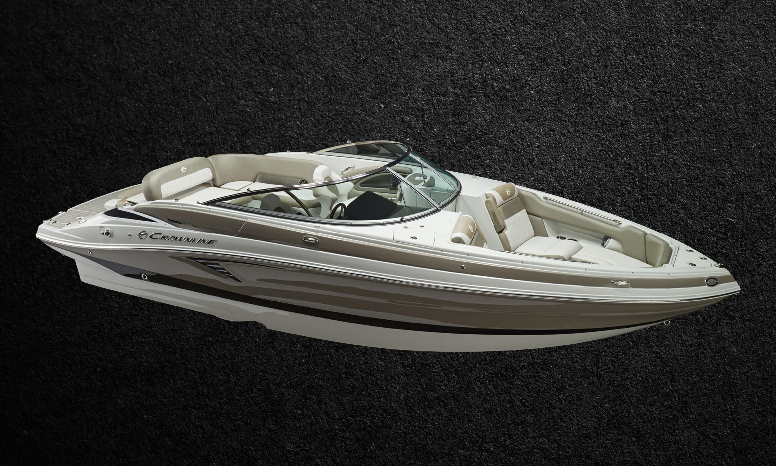 The 260 SS features an updated hull, deck, upholstery, and seating layout, and it’s built on Crownline’s signature F.A.S.T. Tab® hull design. This model is loaded with amenities including a standard Moonstone aluminum arch (not pictured), large swim platform with soft touch mat and boarding ladder, Social Swim™ transom design, eight Wet Sounds speakers, 7″ twin Garmin touchscreen Gen-2 dash, up to 430 HP, aft electric sun lounge seat with dual actuator, under-mount cockpit storage drawer, electric flush head with holding tank and handheld shower, cabinetry with sink and granite countertop, and screened portlight.