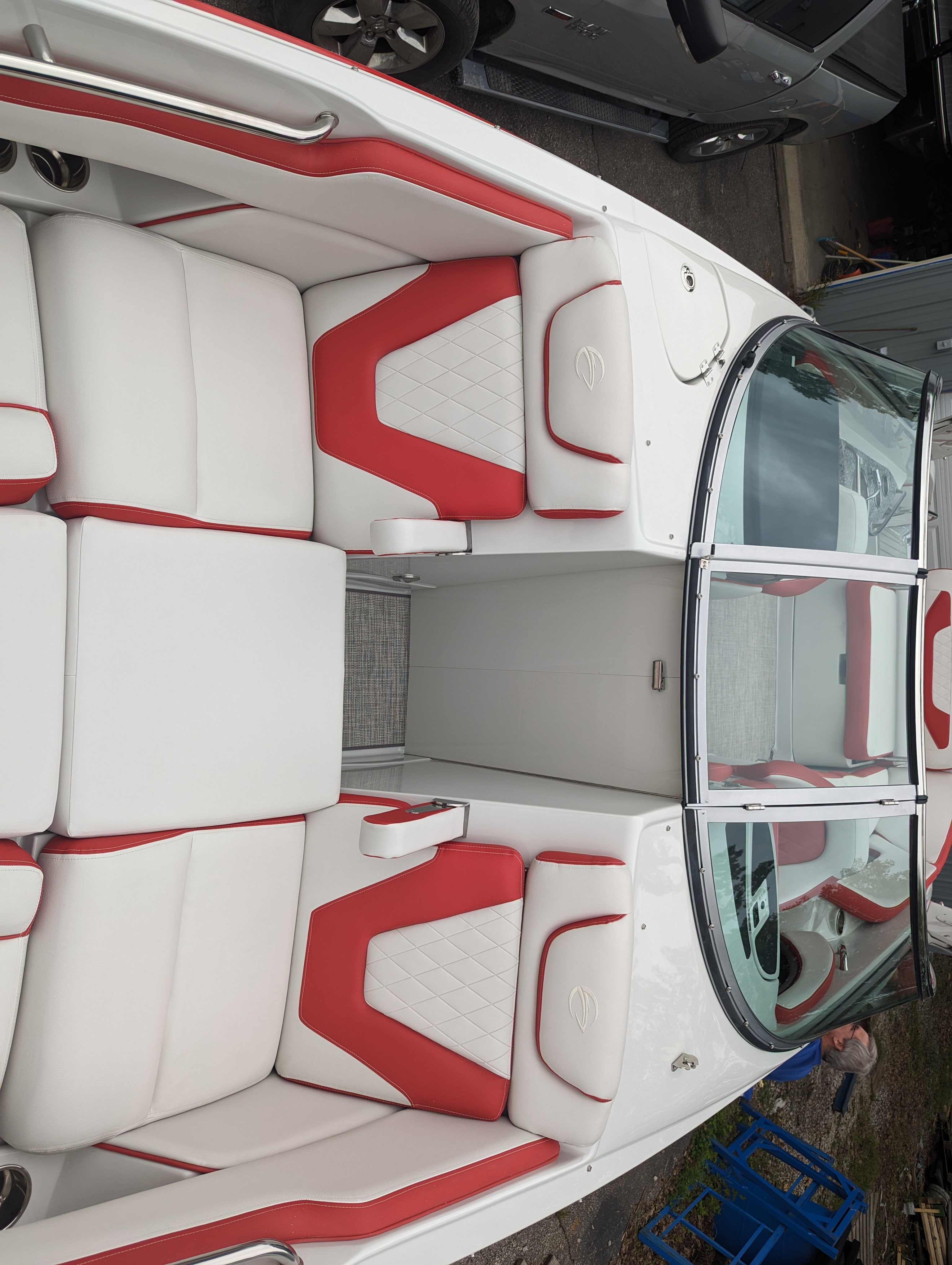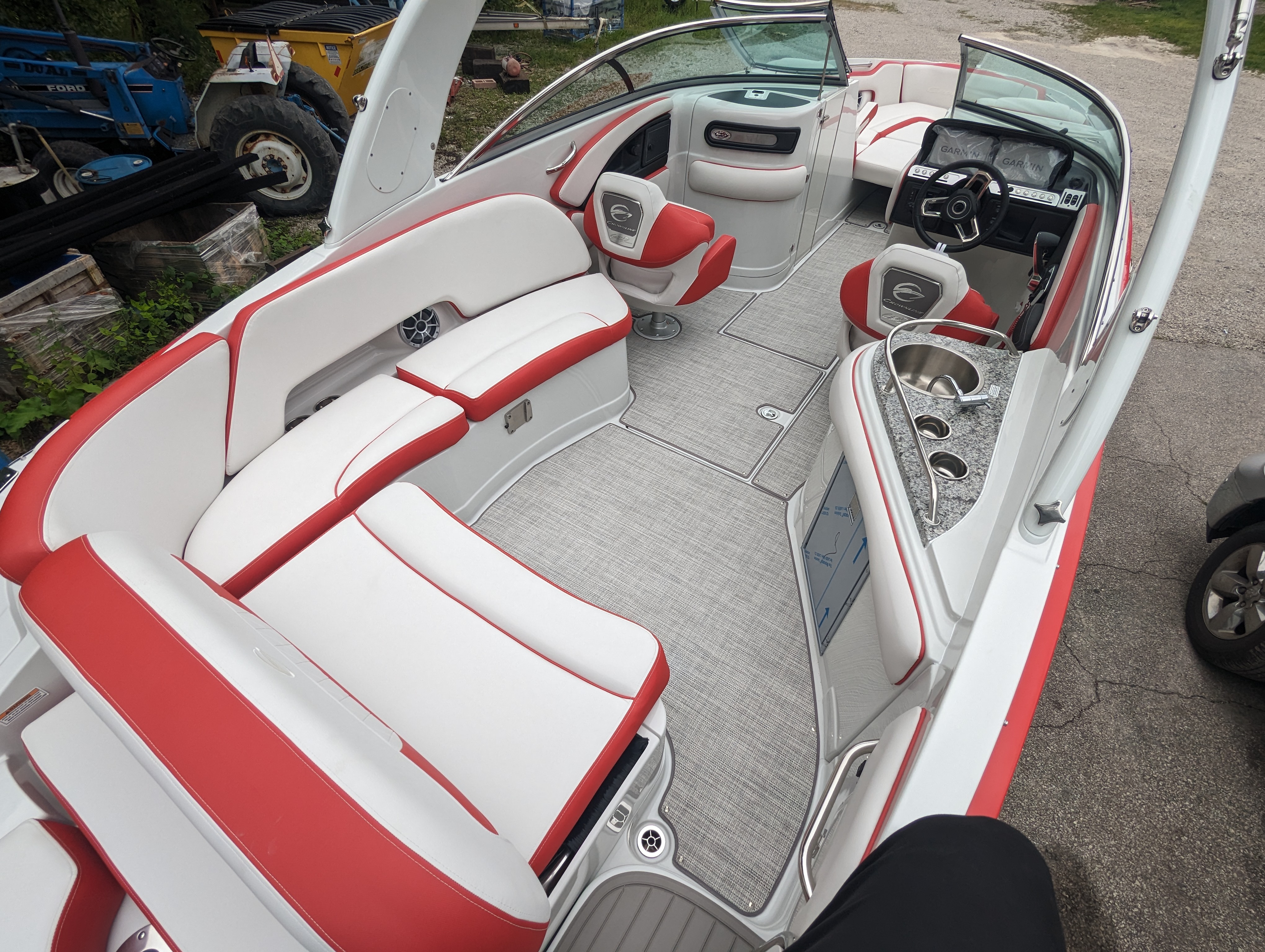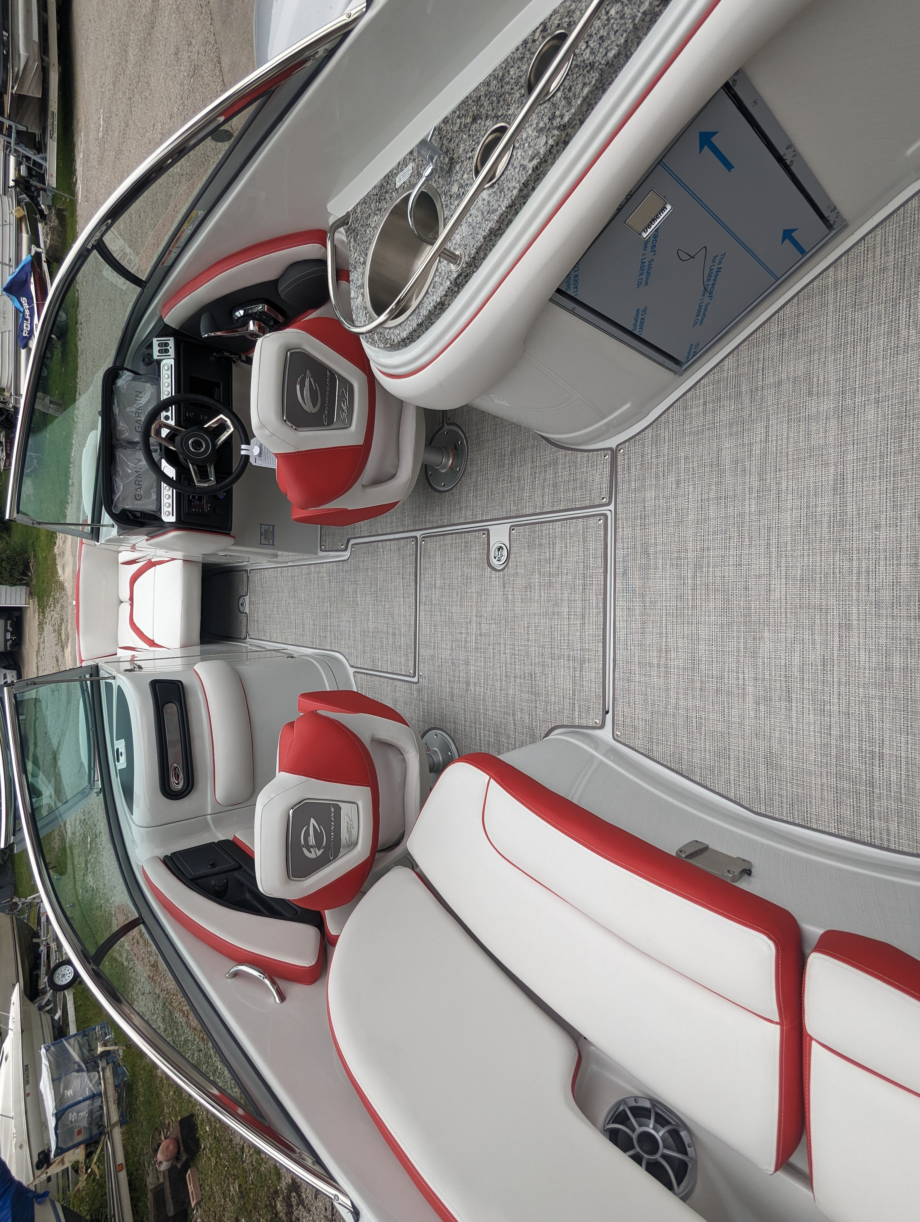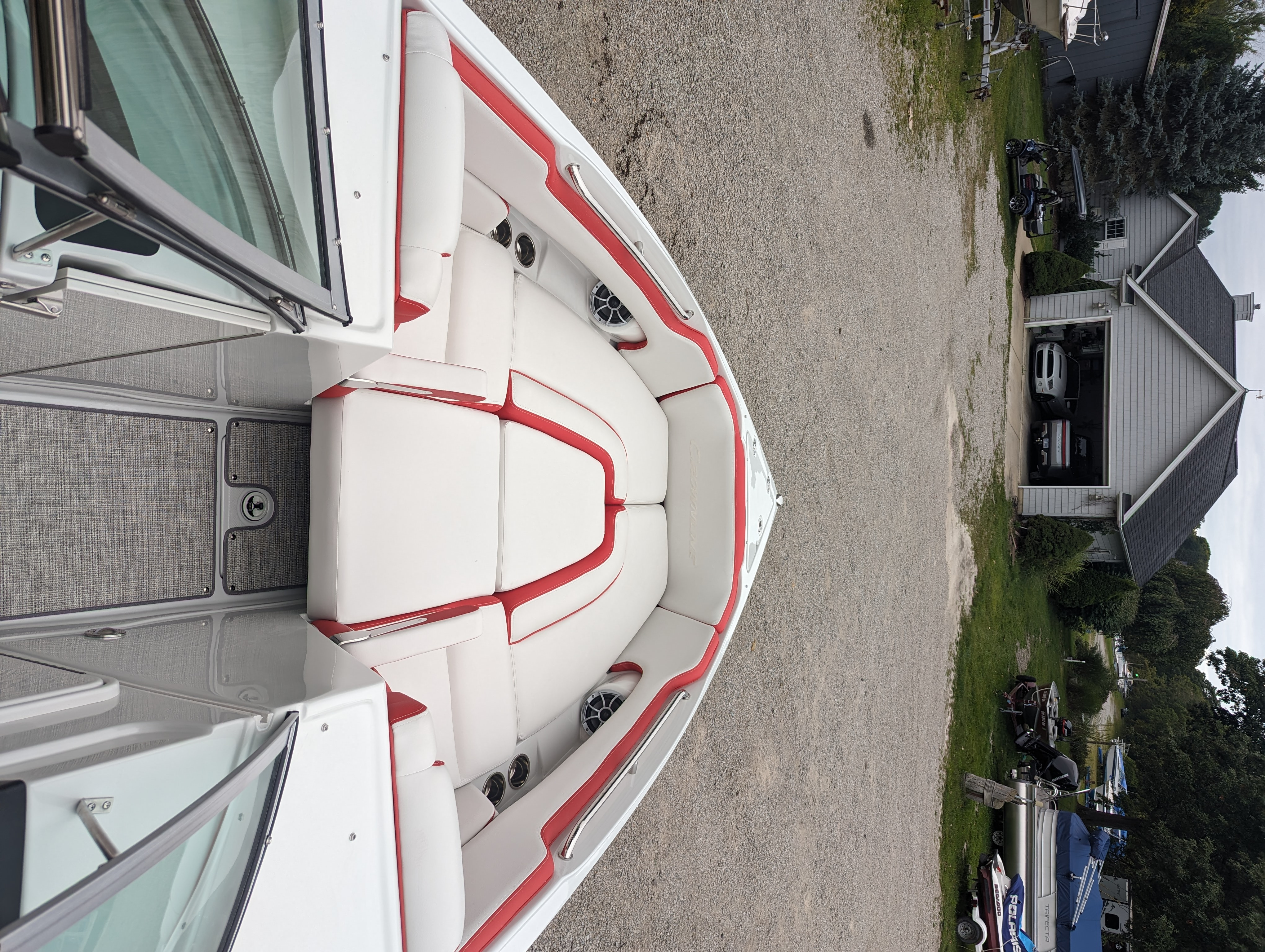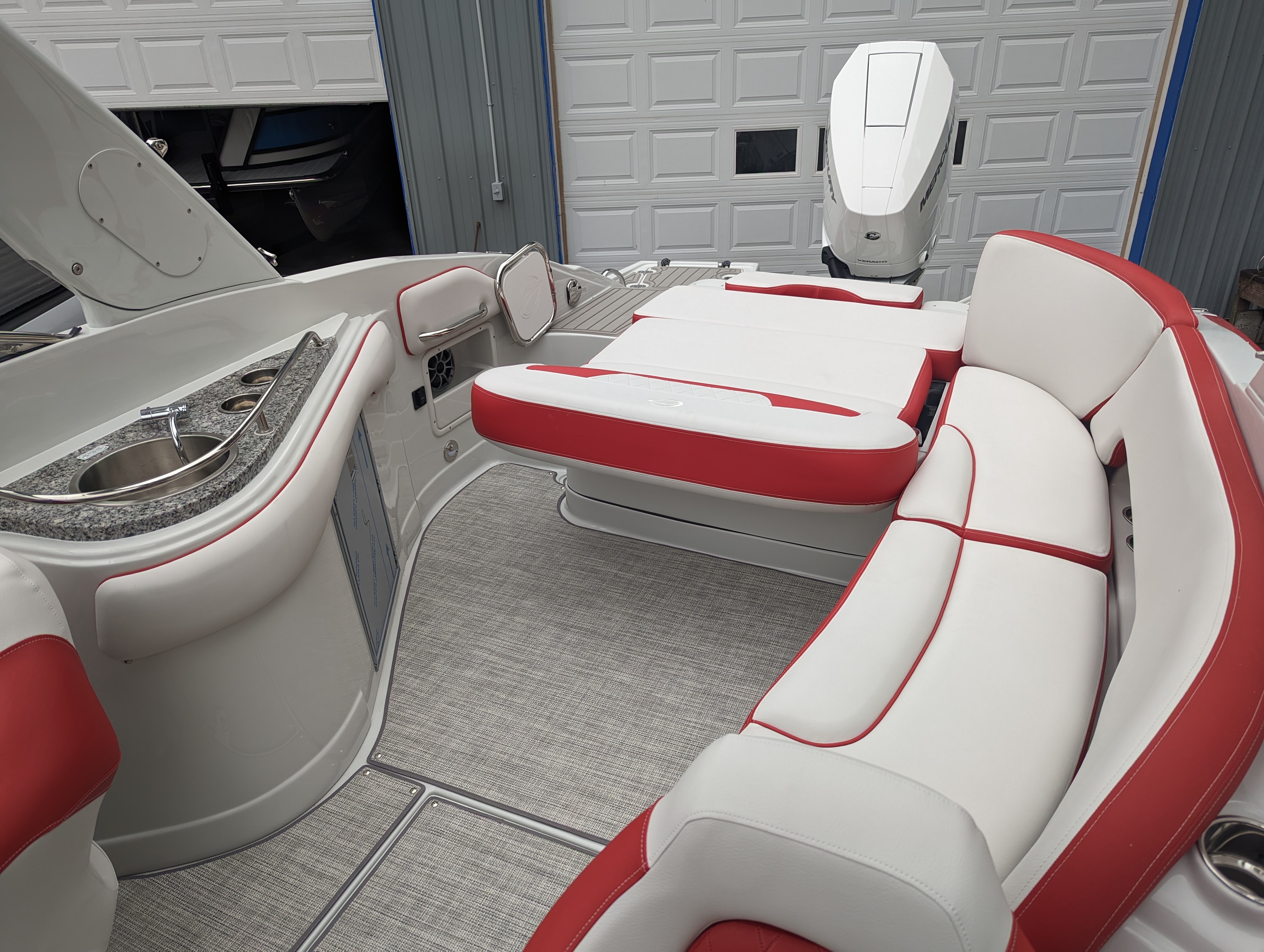 This beautiful deluxe boat, with 400 HP is Red and White. It includes color matched interior, galley with granite top, sink & fridge, black stitch & Stainless Dash, Bow & Cockpit Cover, Bow Filler Cushions, Fender Clips, Ski Tow Pylon-Motor, White & Stainless Prop and the Aluminum Trailer.