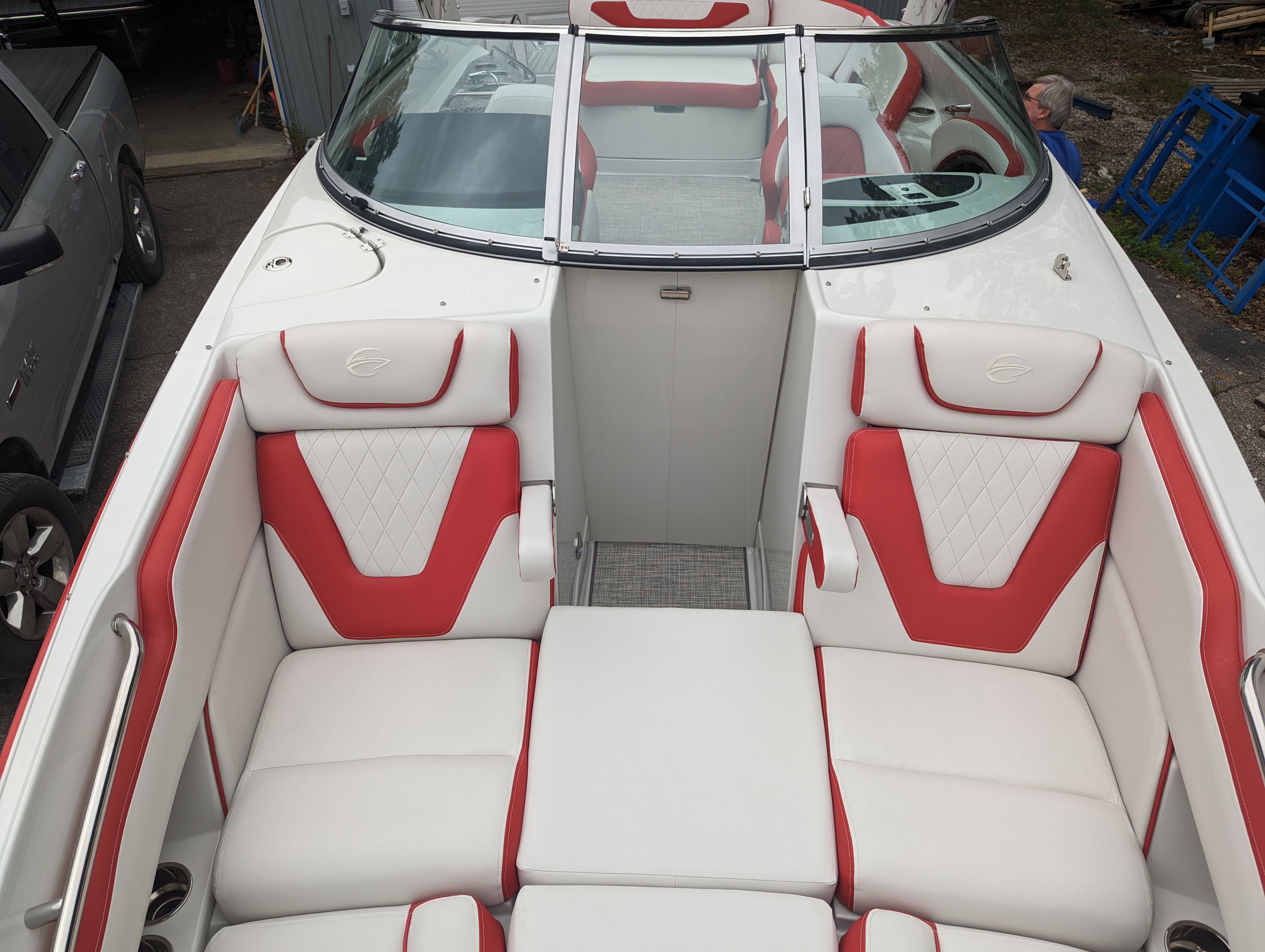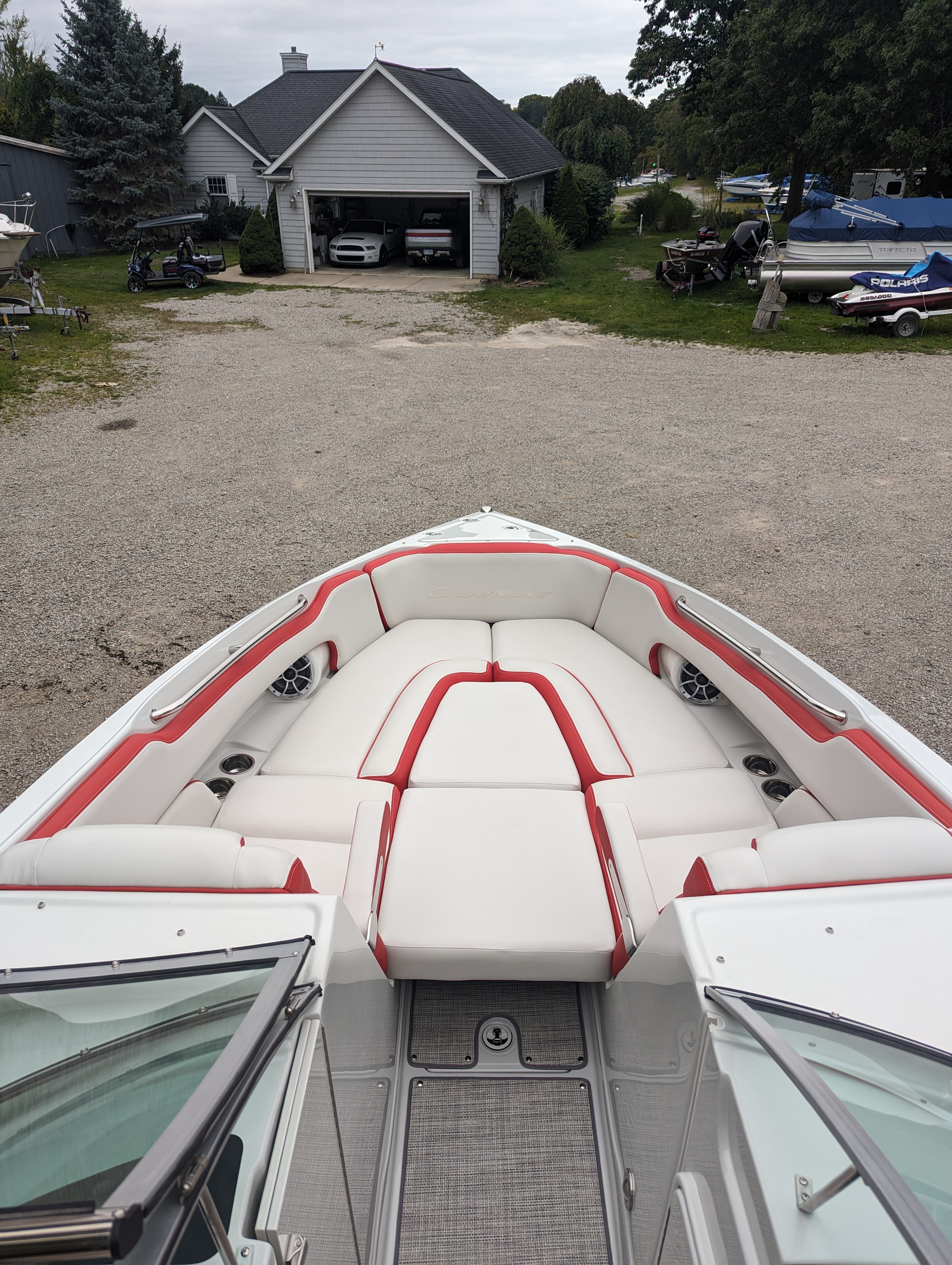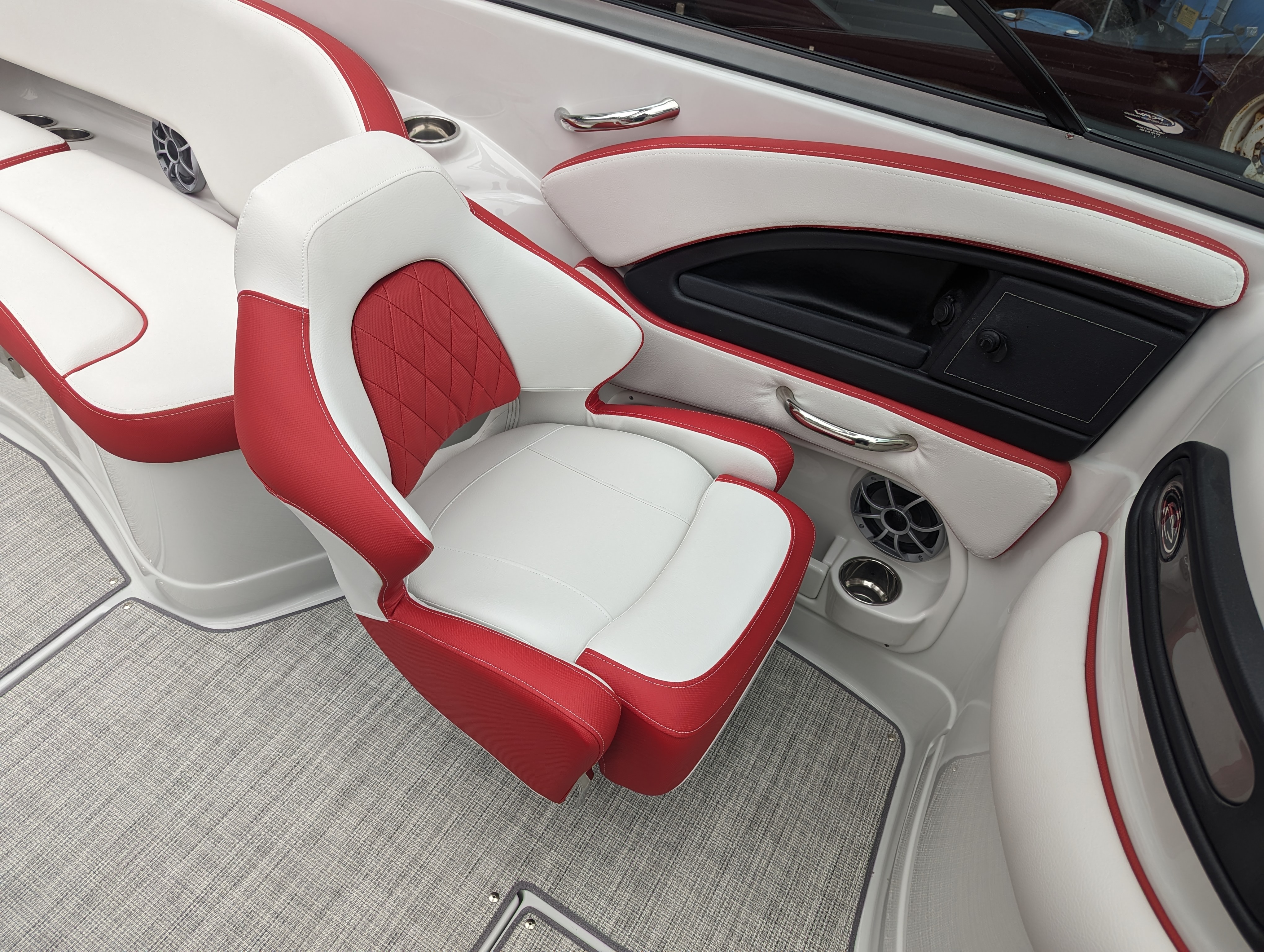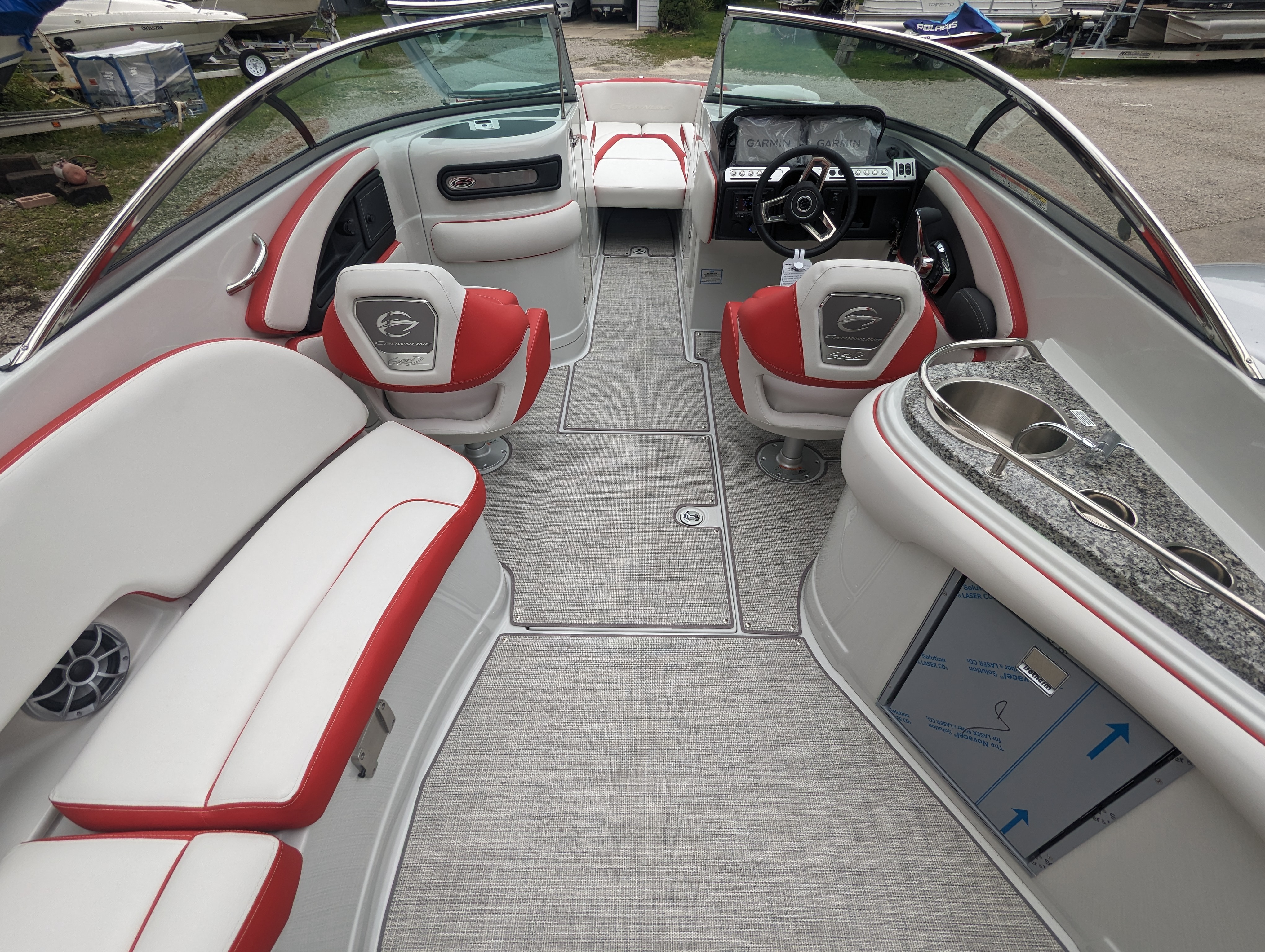 This beautiful deluxe boat, with 400 HP is Red and White. It includes color matched interior, galley with granite top, sink & fridge, black stitch & Stainless Dash, Bow & Cockpit Cover, Bow Filler Cushions, Fender Clips, Ski Tow Pylon-Motor, White & Stainless Prop and the Aluminum Trailer.