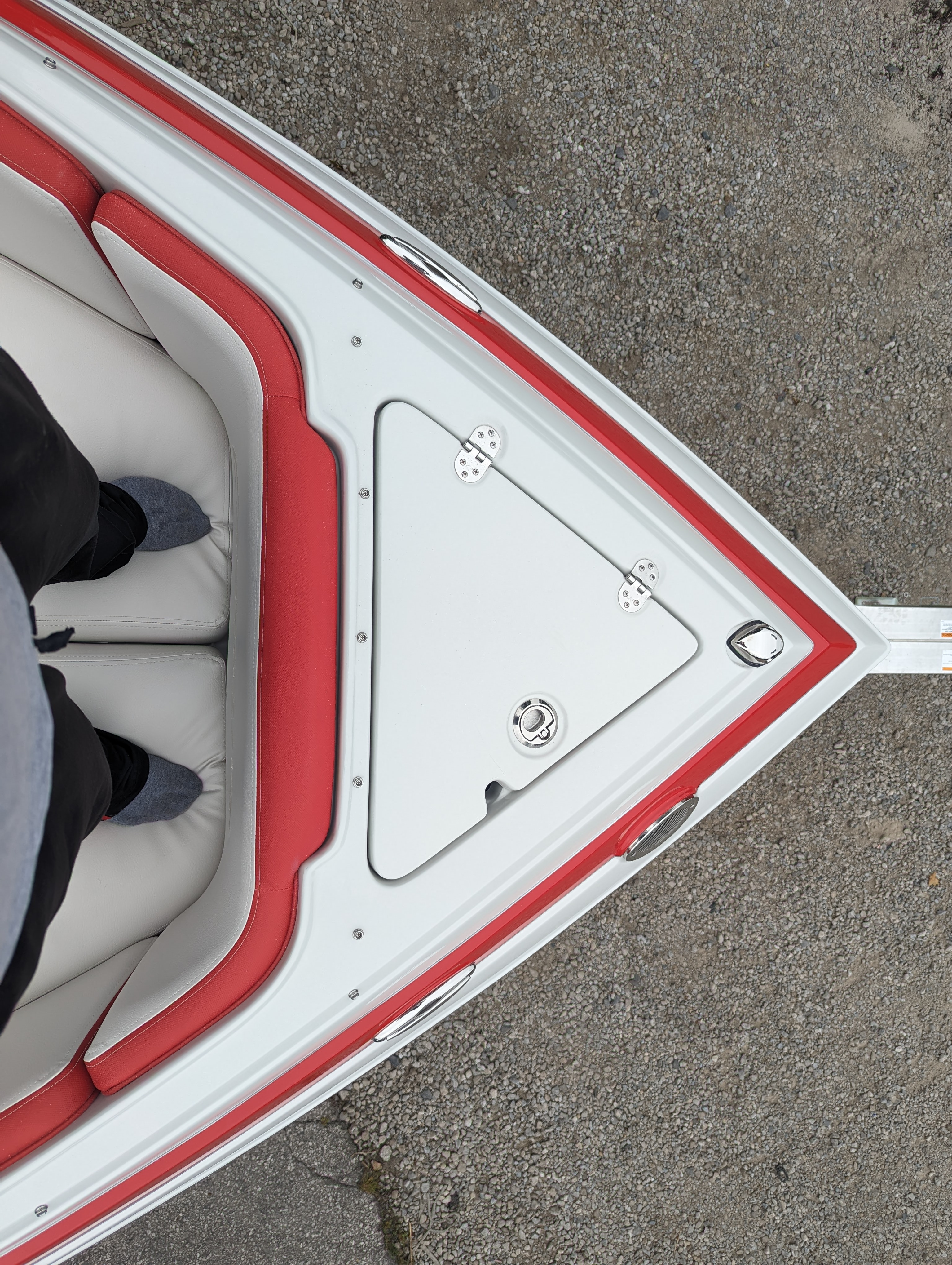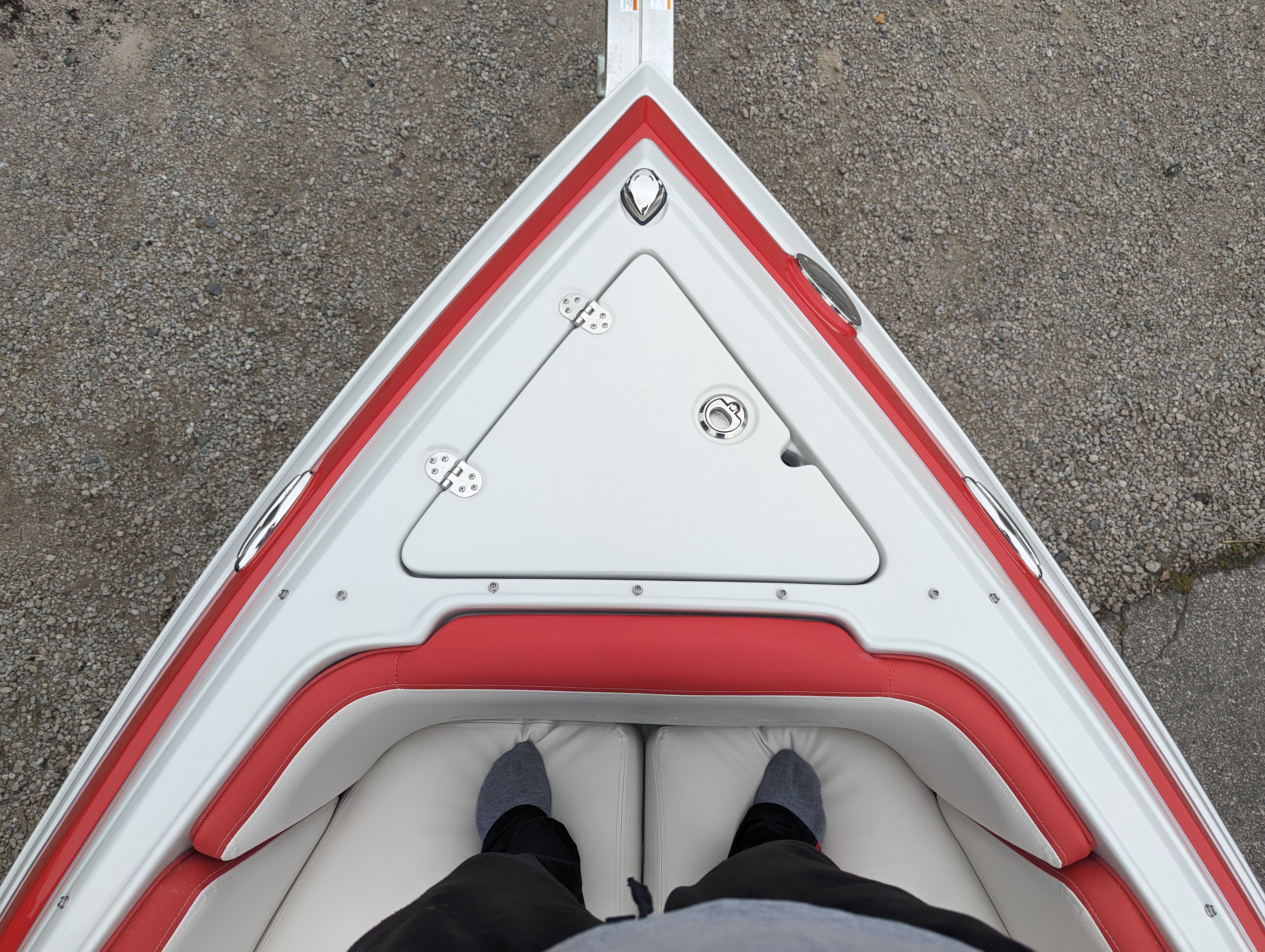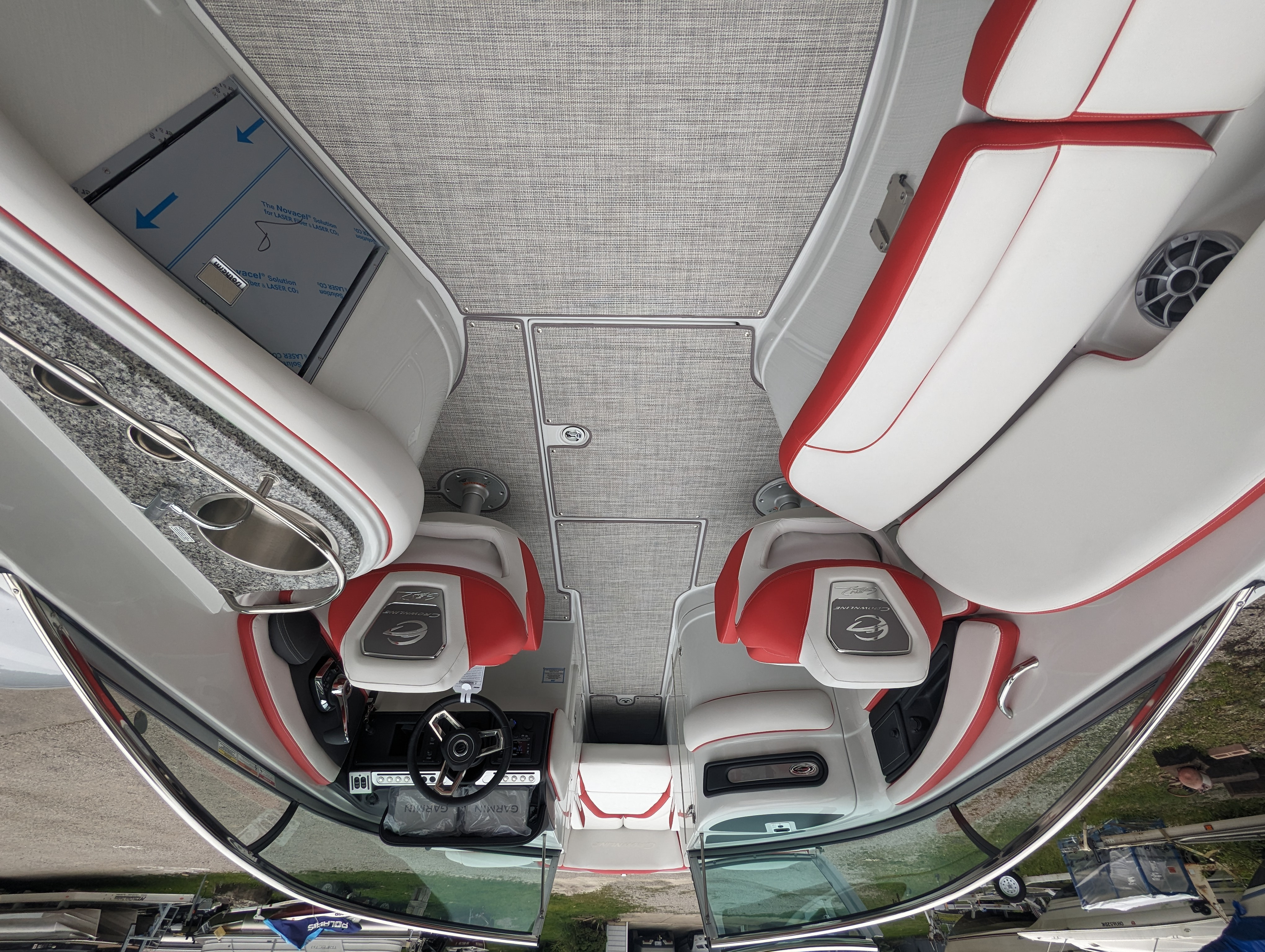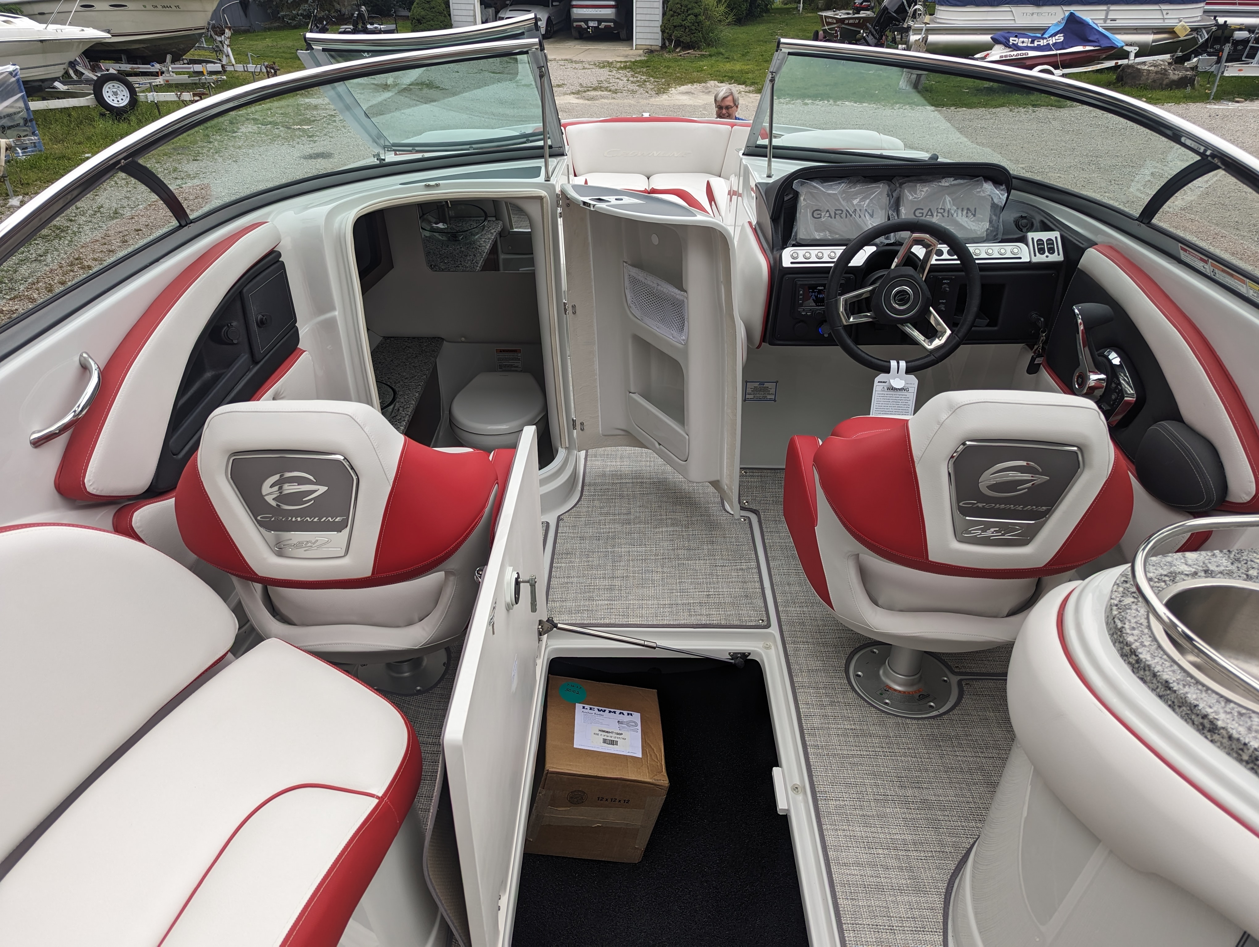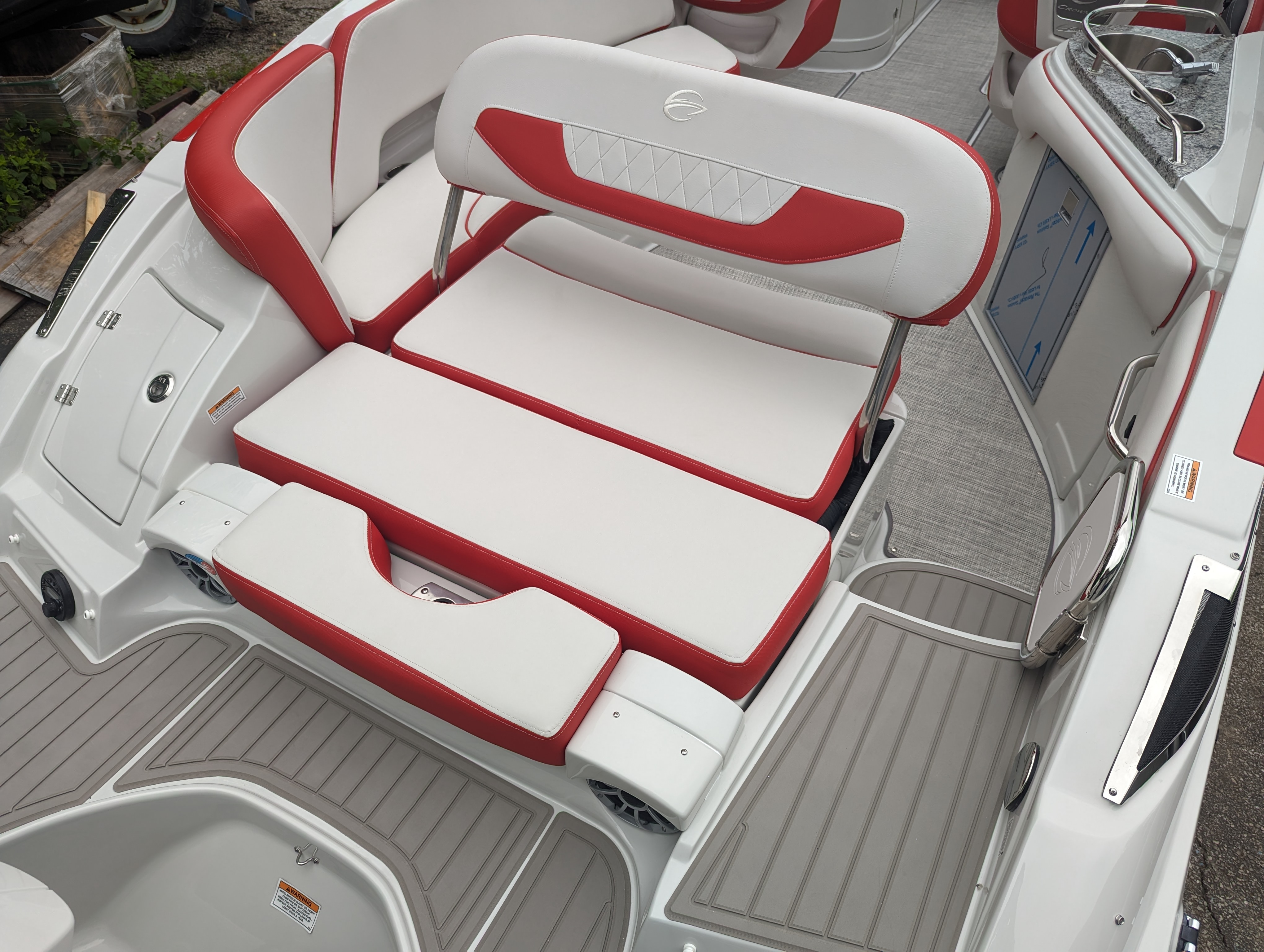 This beautiful deluxe boat, with 400 HP is Red and White. It includes color matched interior, galley with granite top, sink & fridge, black stitch & Stainless Dash, Bow & Cockpit Cover, Bow Filler Cushions, Fender Clips, Ski Tow Pylon-Motor, White & Stainless Prop and the Aluminum Trailer.