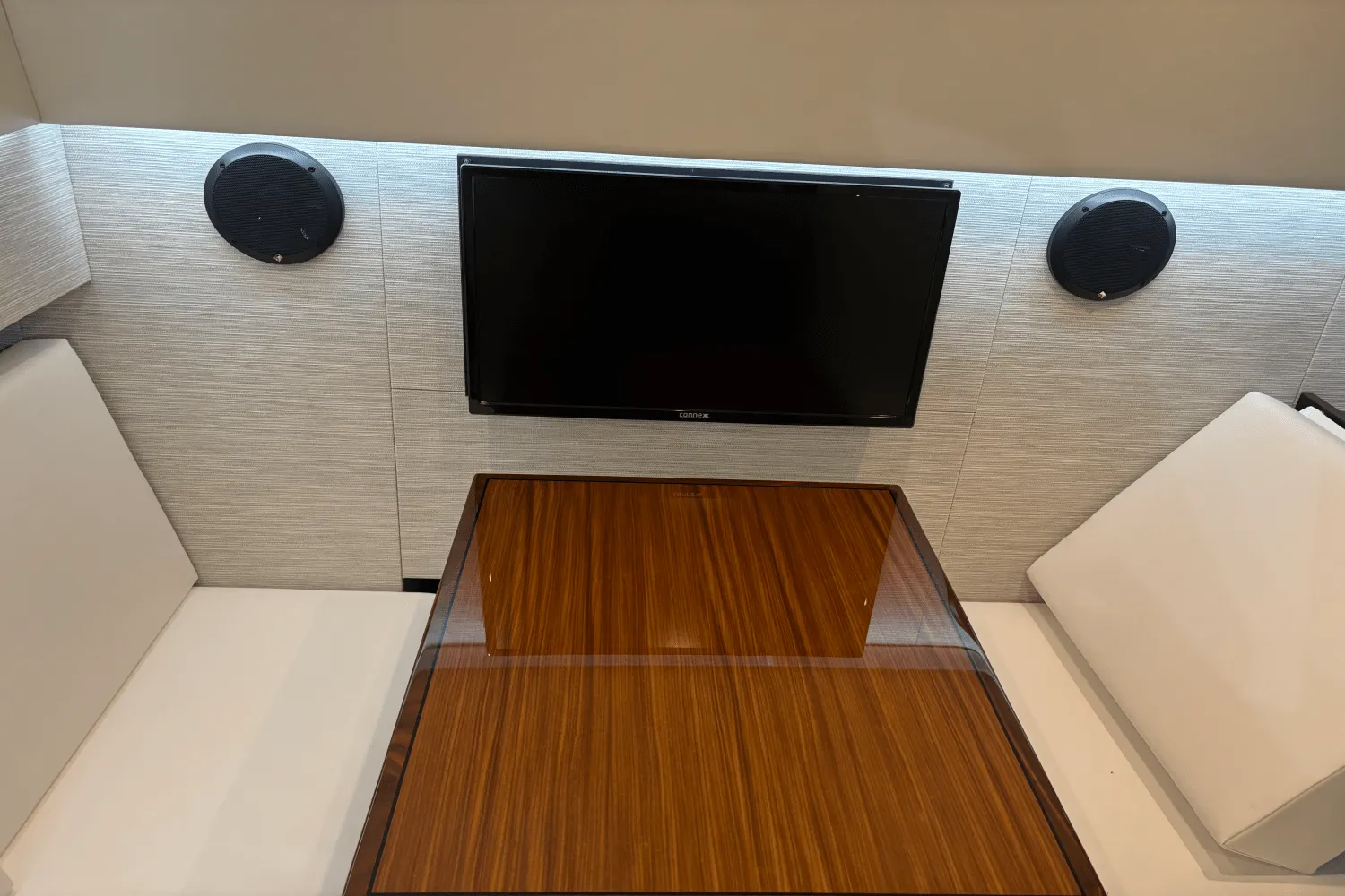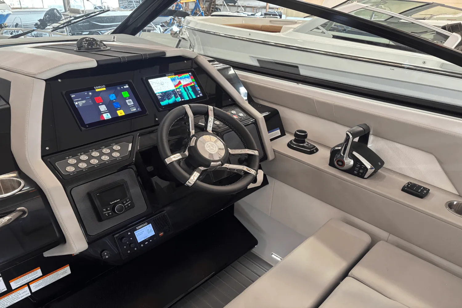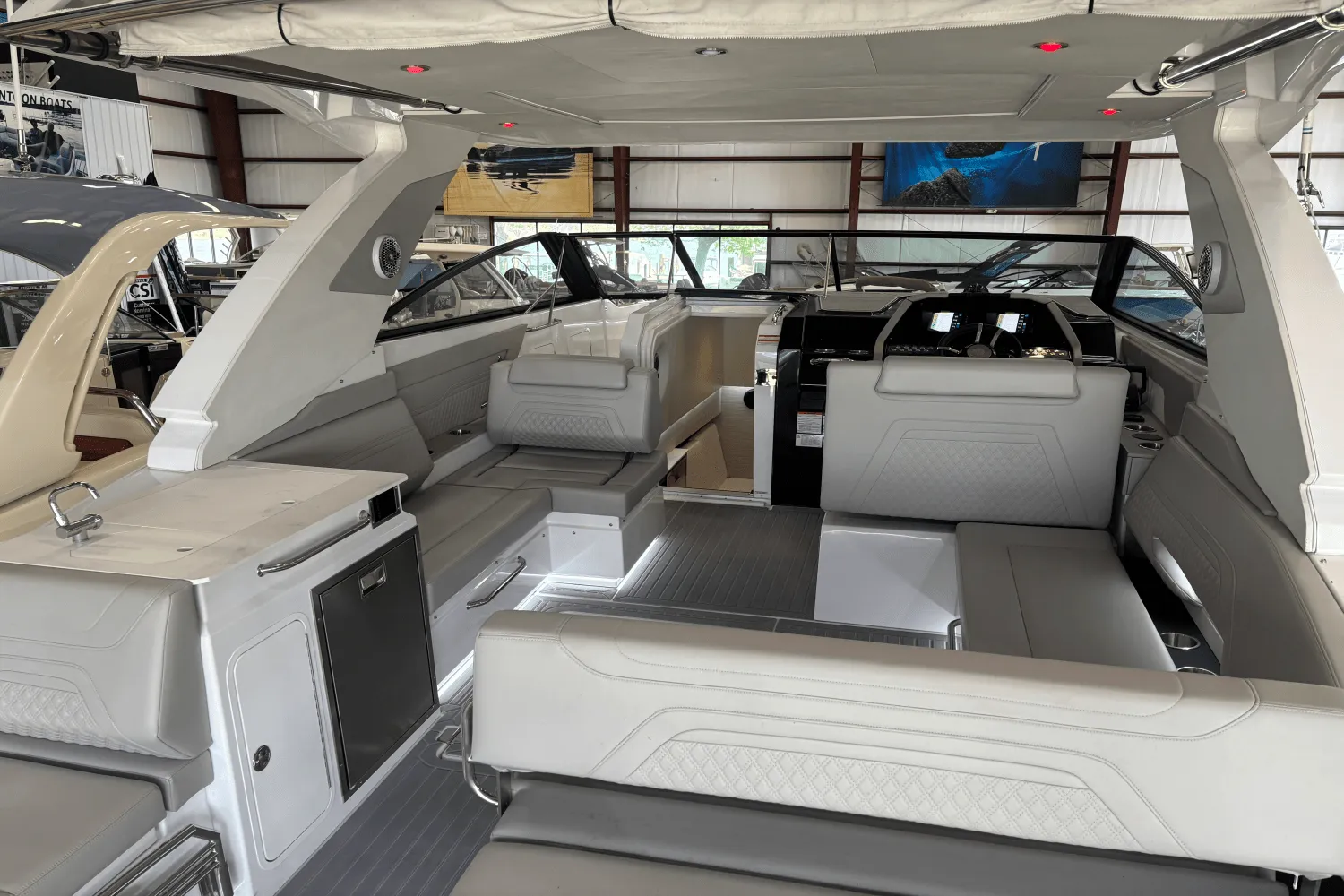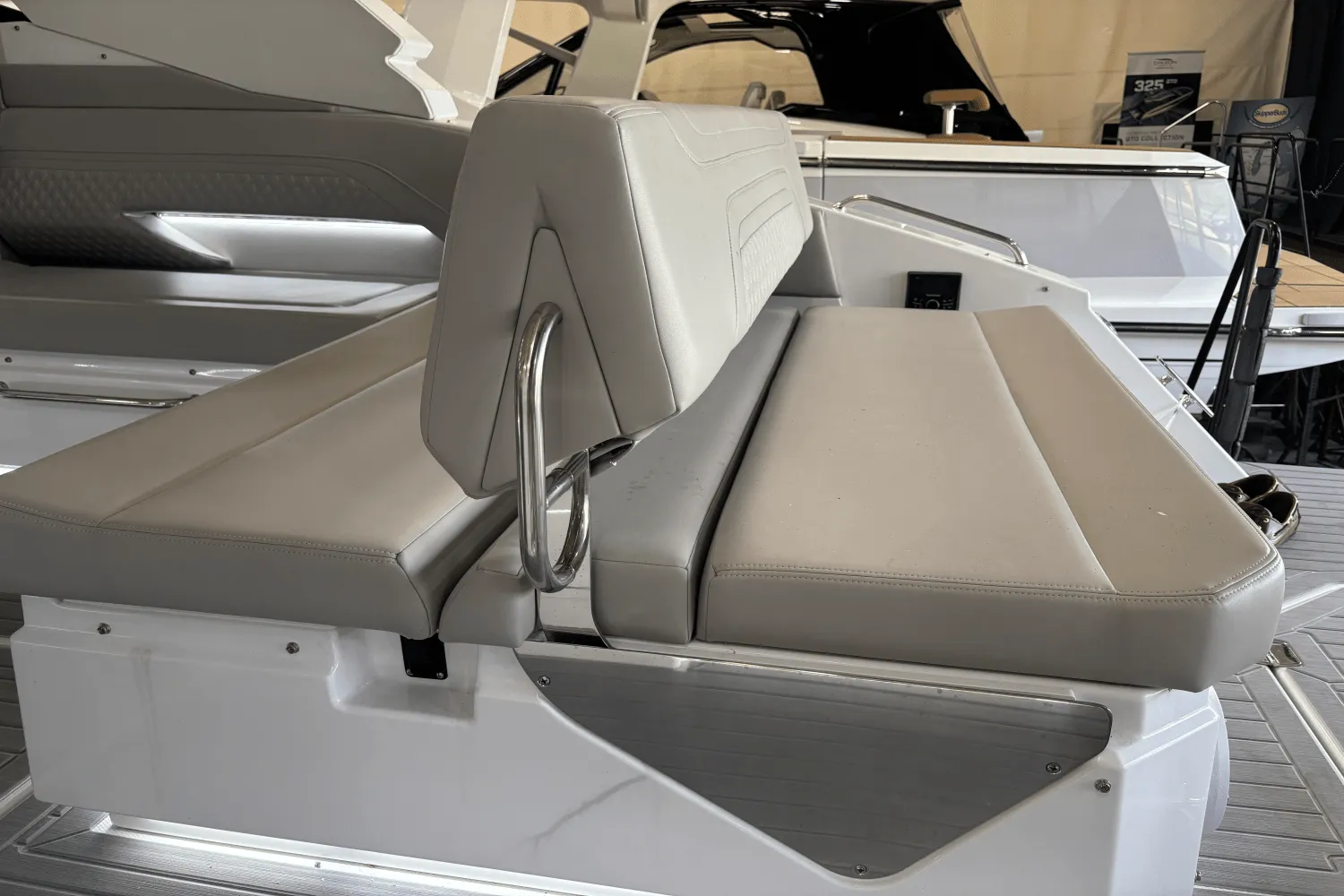 The GLS series continues its powerful, entertainment-centered yacht line with the 34 GLS. The 34 GLS’s cockpit features two cockpit L-shaped seating areas. The portside seating has an adjustable backrest while the larger starboard side seating converts into a large, aft facing sunpad. The lower salon features an aft stateroom, a dinette that converts into a berth, fridge, and microwave.