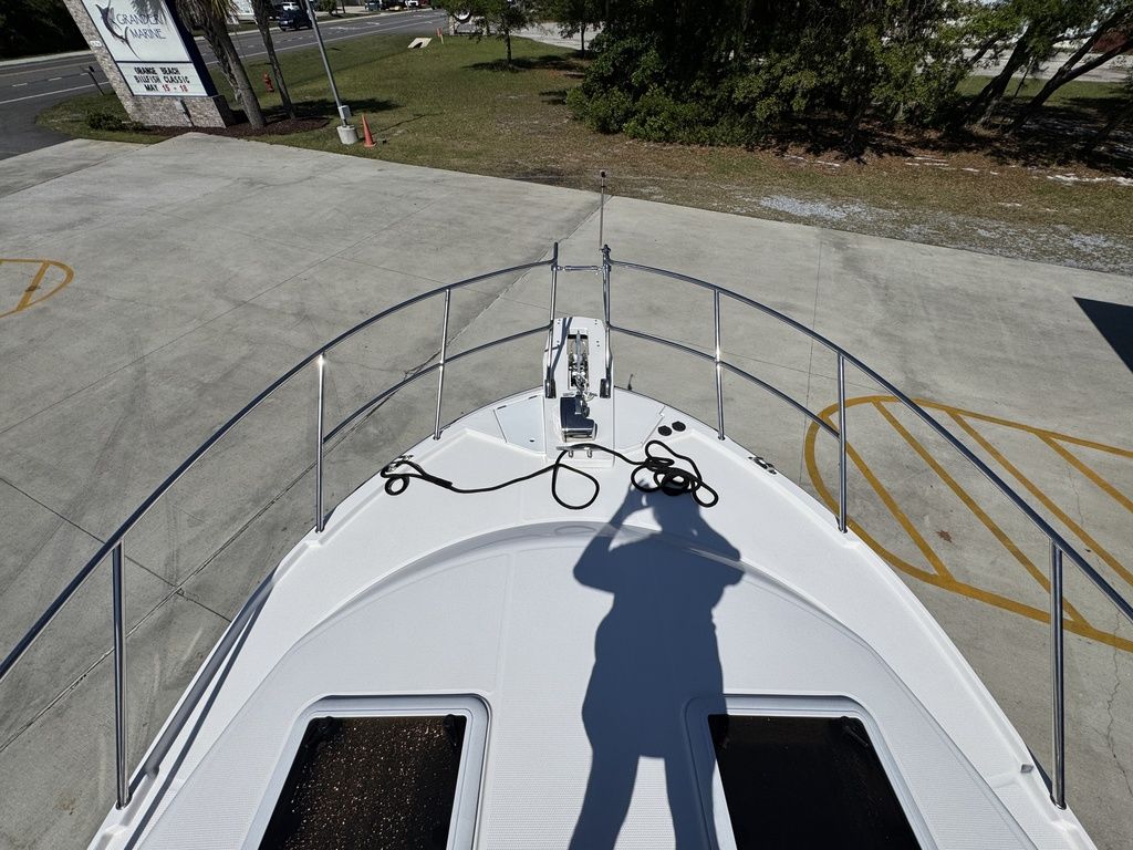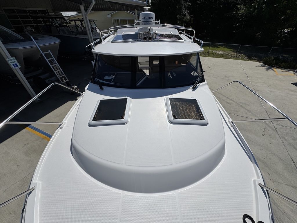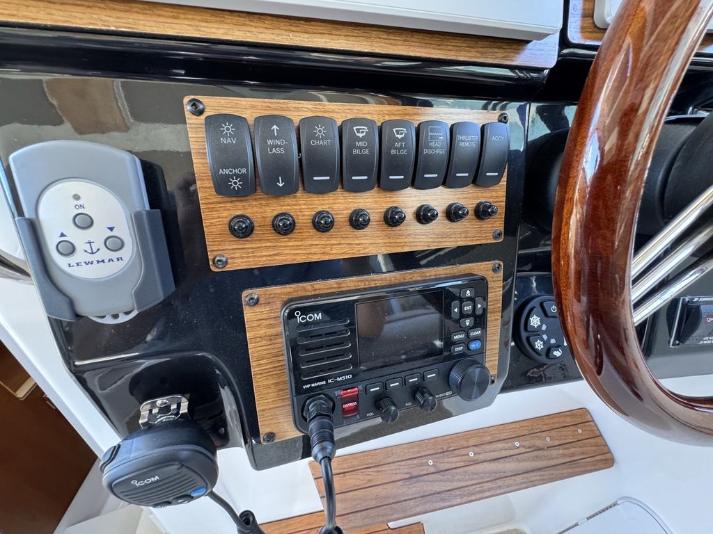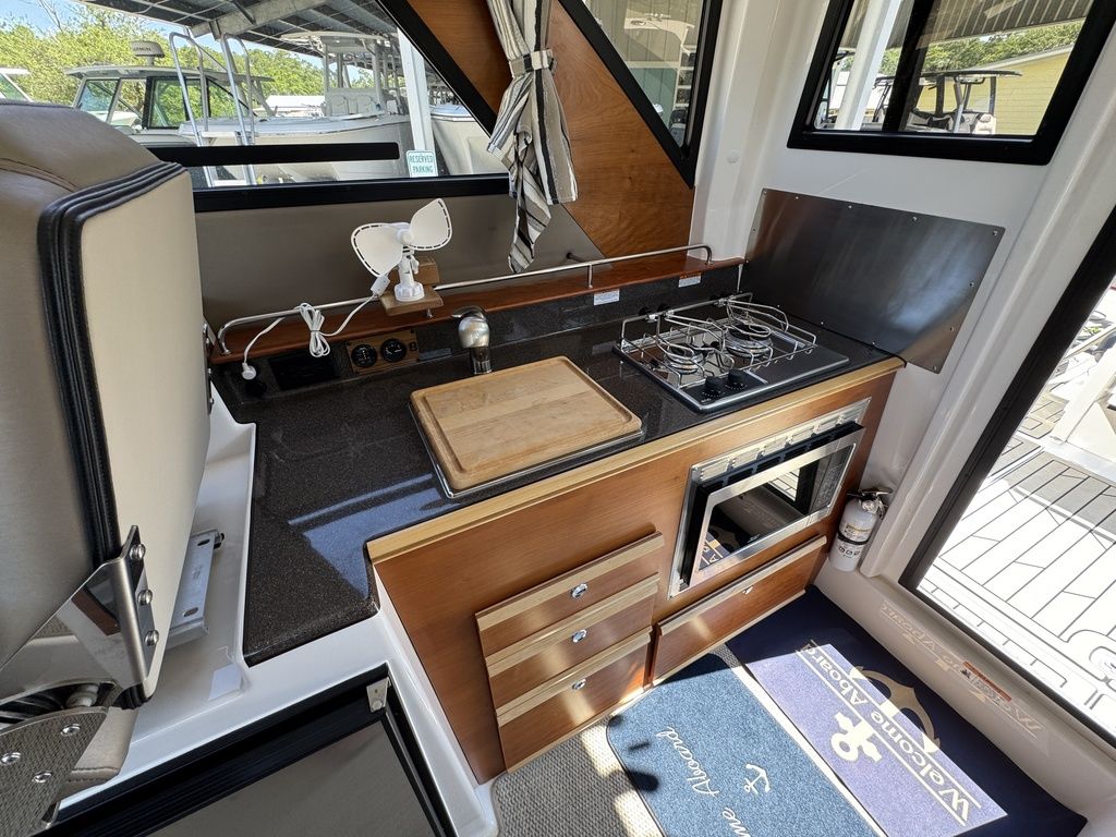 Step inside the salon and you’ll find your home on the water, with a full galley featuring a stovetop, stainless-steel sink with pull-out rinse faucet, fridge/freezer combo, microwave convection oven, cabinetry, and a wine/water cooler. The helm is a Captain’s dream with a Garmin 8612xsv chartplotter, Garmin Autopilot, sonar, xHD radar, color engine displays and a twin-lever electronic throttle control.