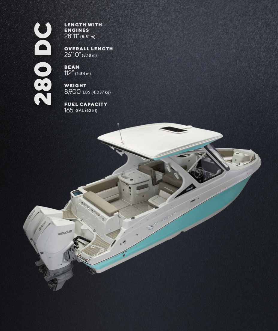 This multi-purpose model provides the versatility buyers expect when they’re in the market for a boat to suit the whole family. Every inch of the 280 DC is filled with well-placed fishing amenities to please even the most serious fisherman and fisherwoman, plus luxurious touches and entertainment features to create the perfect all-around family boat.