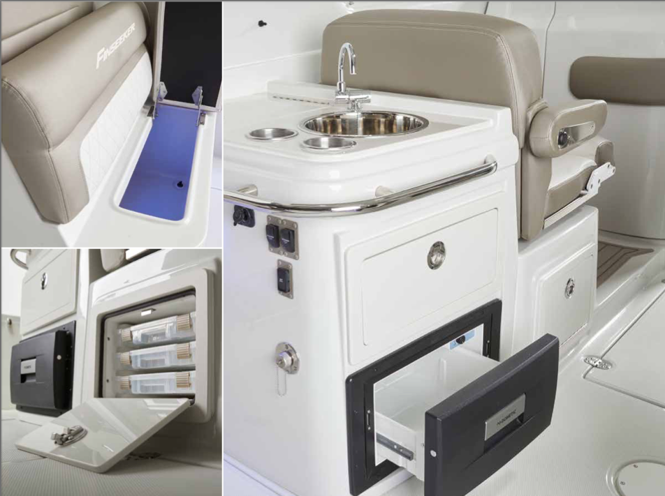 GALLEY – COCKPIT W/ S/STEEL SINK, COUNTERTOP, DRAWER REFRIGERATOR, DRINK HOLDERS & TOOL/TACKLE CABINET