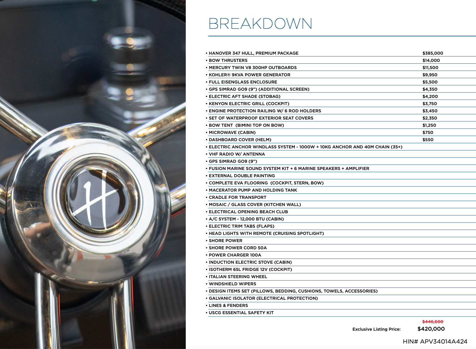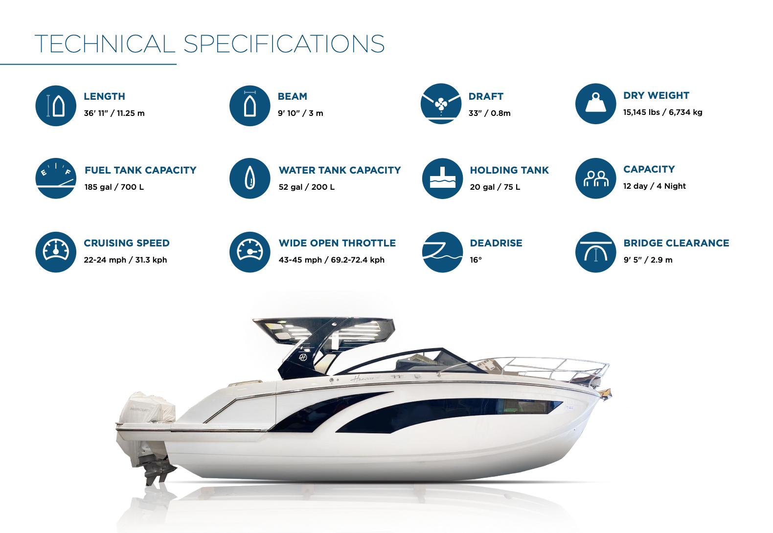 PROPULSION: Twin Mercury® 300HP V8 Outboards w/ Joystick Piloting