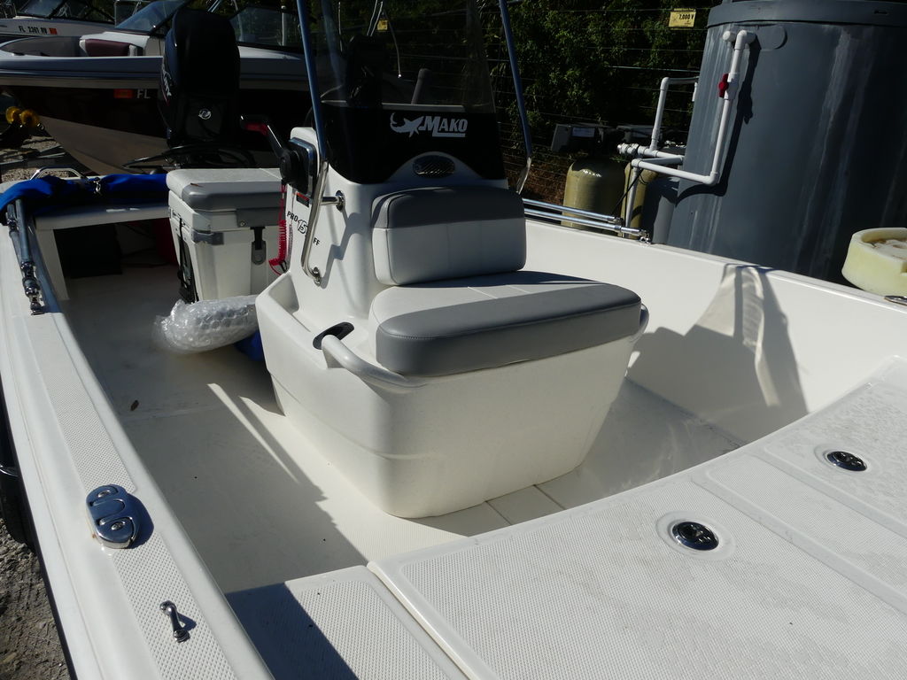 The strong design of the Pro Skiff 15 consists of the hull and deck liner that are chemically and mechanically bonded together, and then filled with expanding foam to create one unitized structure with excellent flotation and rigidity. It comes standard with a hot-dipped galvanized trailer, a Mercury outboard and the industry-leading MAKO Assurance 5+Life warranty.