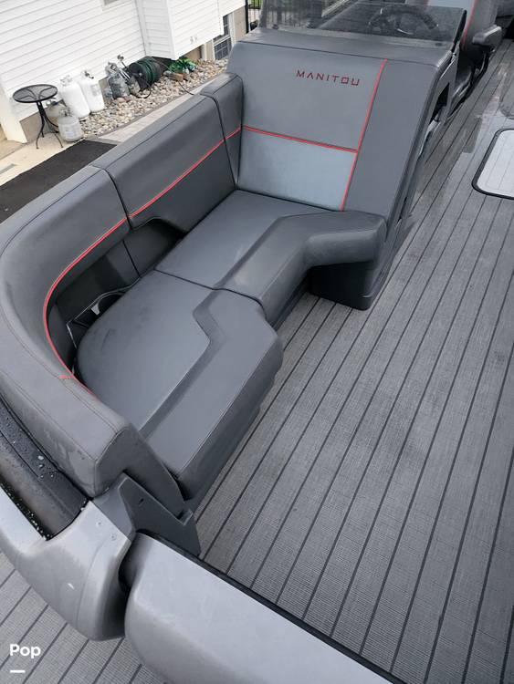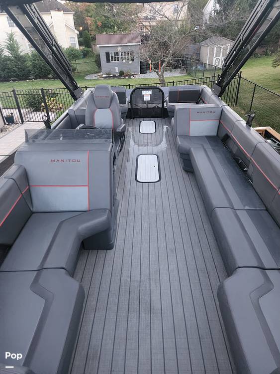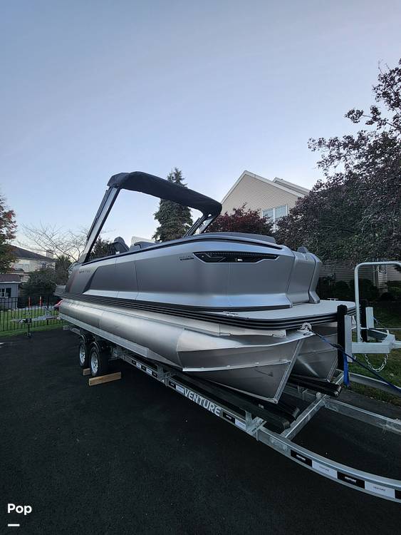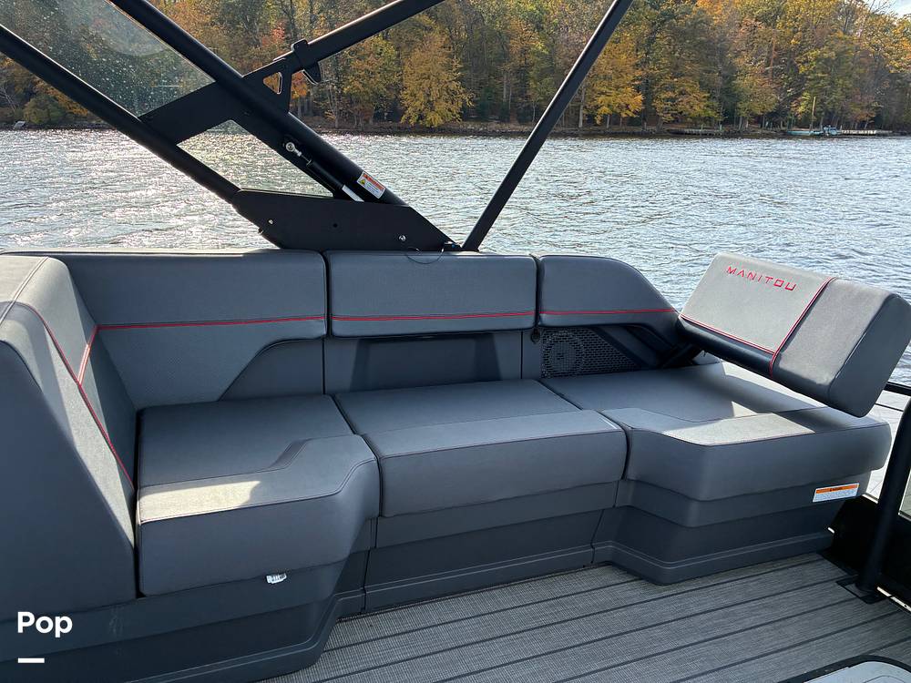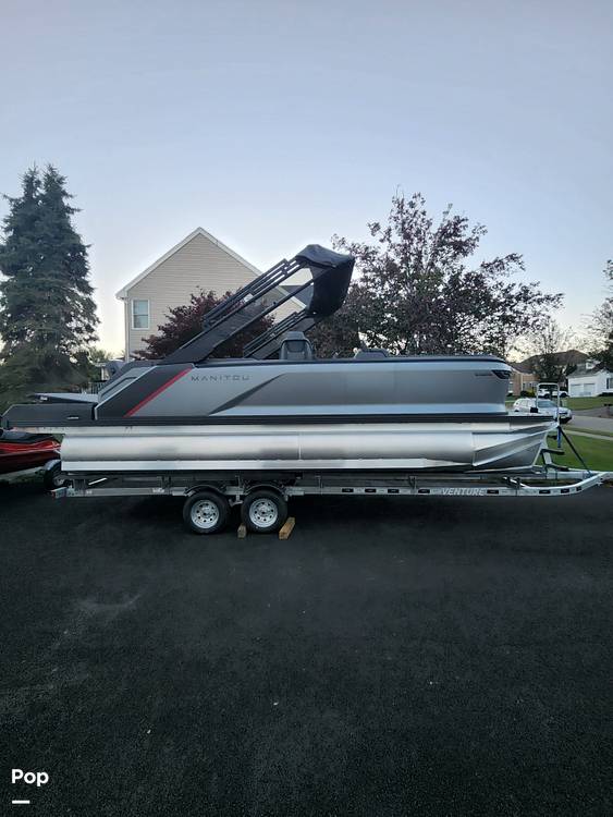This is a 2024 Manitou Explore 22 Max Bench tritoon boat. Its powered by a single Rotax 150 horsepower motor with just 6 total hours on the boat.