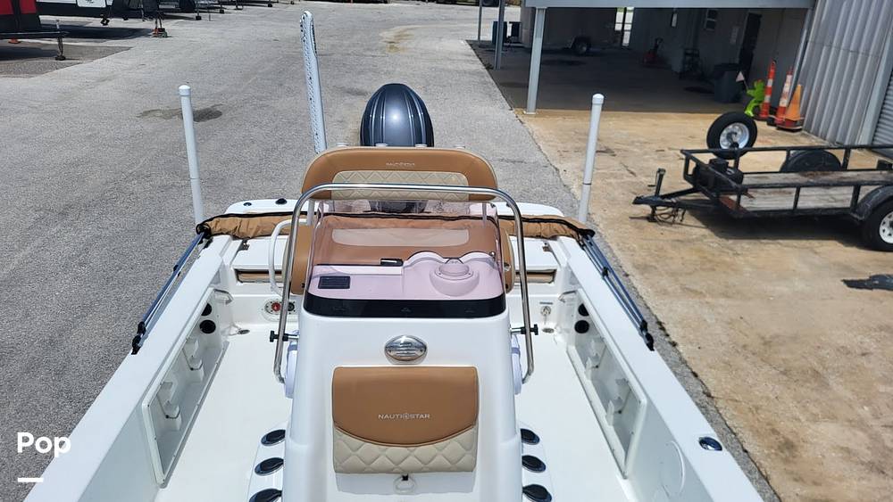The NauticStar has a 10-foot power pole with a 4-year warranty. The helm is equipped with 9 9-inch Simrad XO9 touchscreen navigation. Has a custom Bimini top, 2 house batteries, and Lenco Trim Tabs.